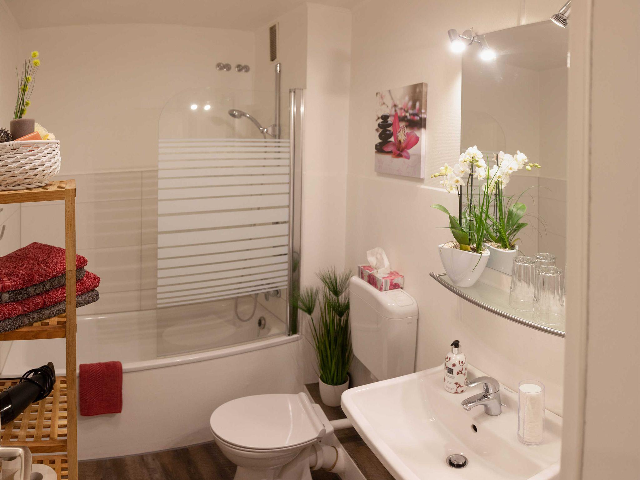 • Badezimmer mit Badewanne und Duschmöglichkeit, Haartrockner