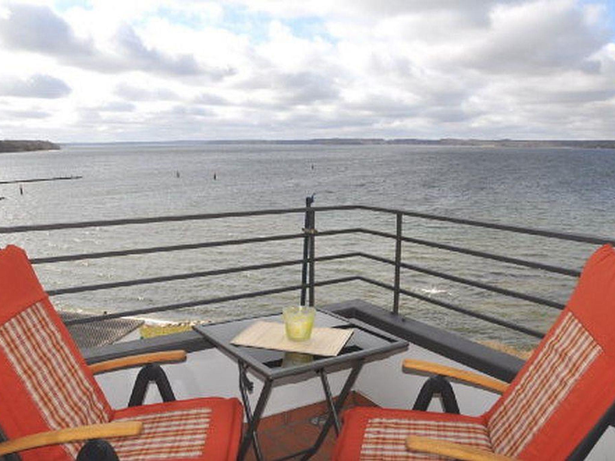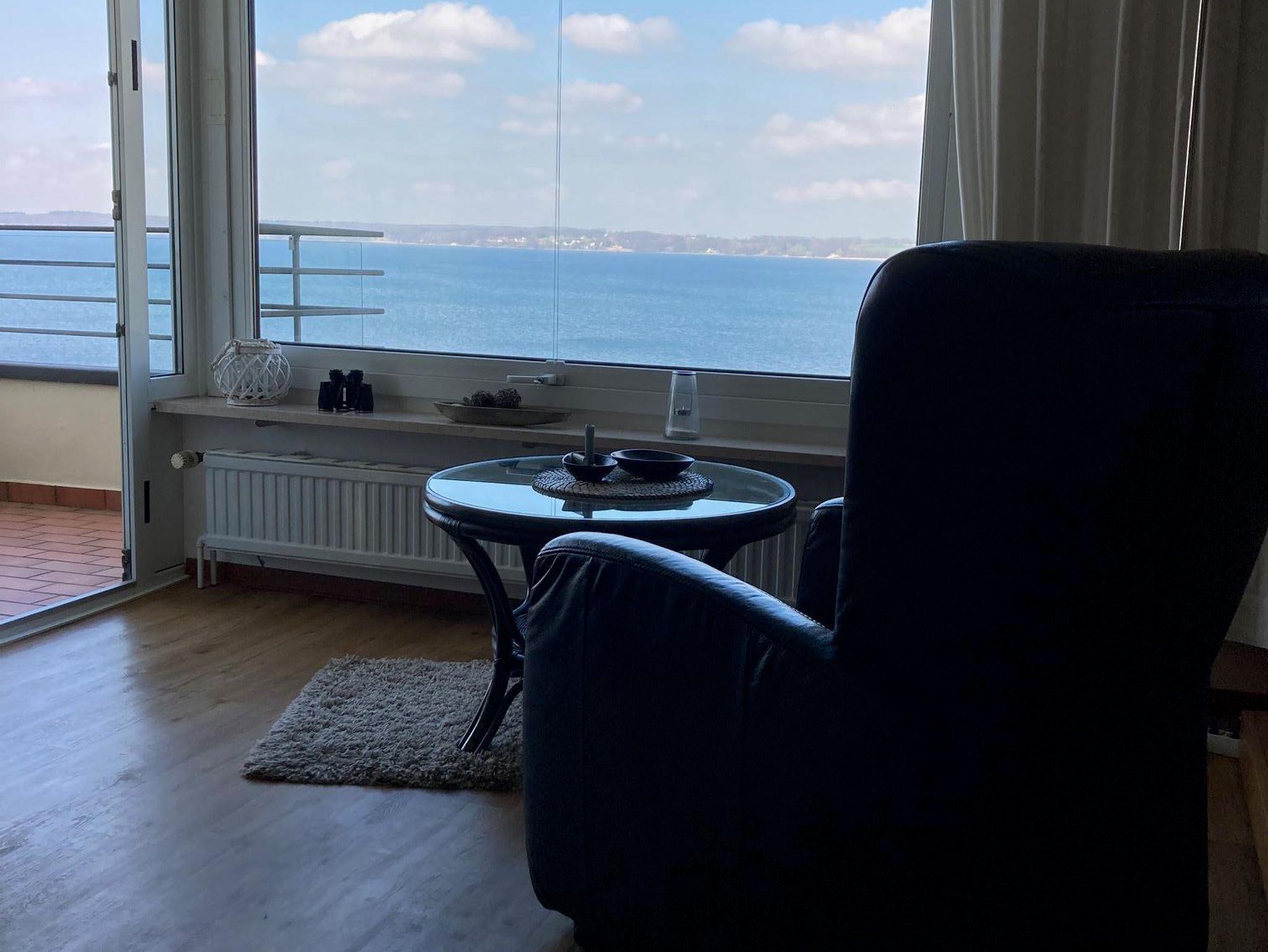 Ferienwohnung mit Panoramablick auf Flensburger Förde und Dänemark in ruhigem Haus mit Balkon und kostenlosem WLAN.