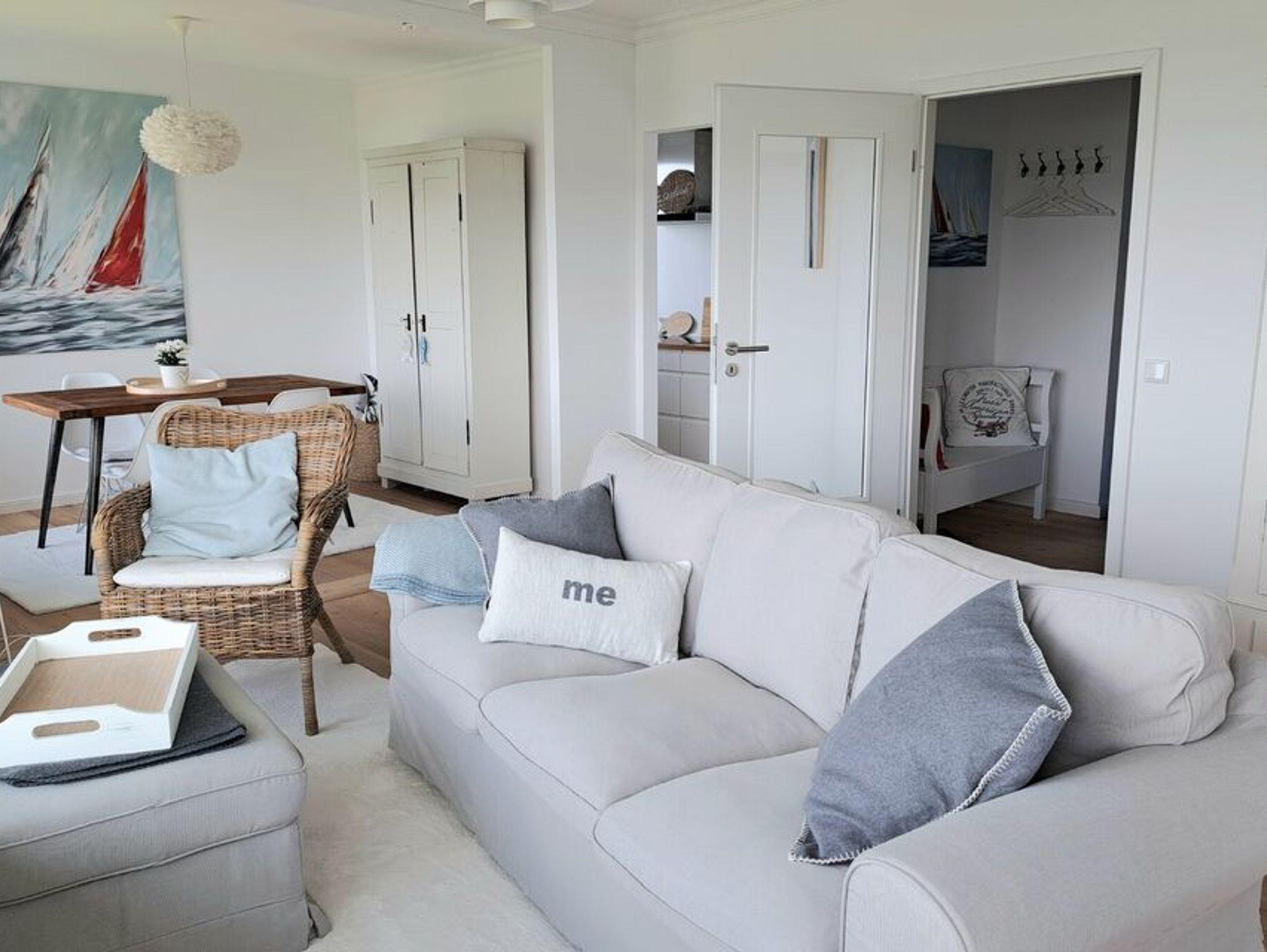 Sie verfügt über ein Wohnzimmer, einer kleinen Küche, ein Schlafzimmer mit einem Boxspringbett (1,80 x 2,00 m, Bettdecken 1,55 x 2,20 m), ein Duschbad und einem Balkon.