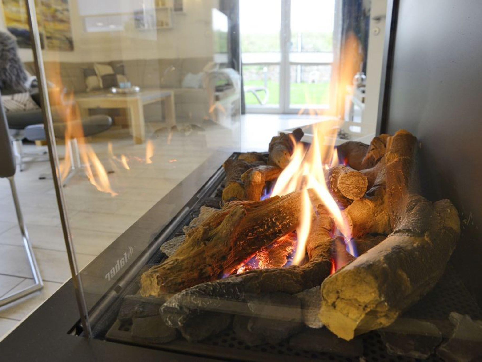 Gaskamin im Wohnzimmer mit Hifi-anlage und großem LED-Fernseher.