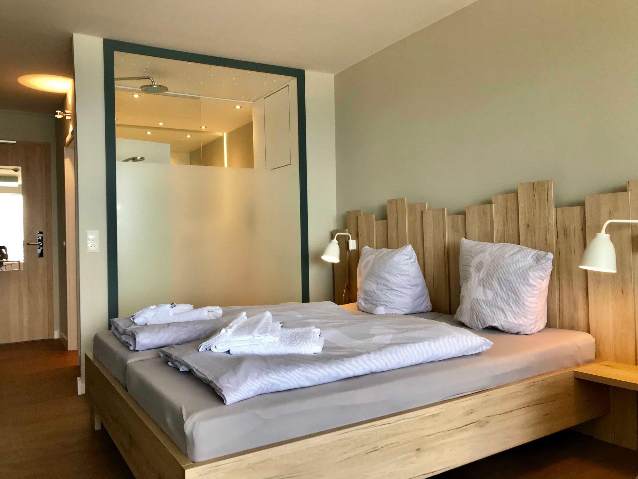 Das Badezimmer ist zum Wohn-/Schlafbereich hin mit einer Glasscheibe (im Mittelteil satiniert) ausgestattet. So hat man selbst beim Duschen Blick auf die Förde. Zusätzlich besitzt die Dusche einen Sternenhimmel aus winzigen Lichtern.
