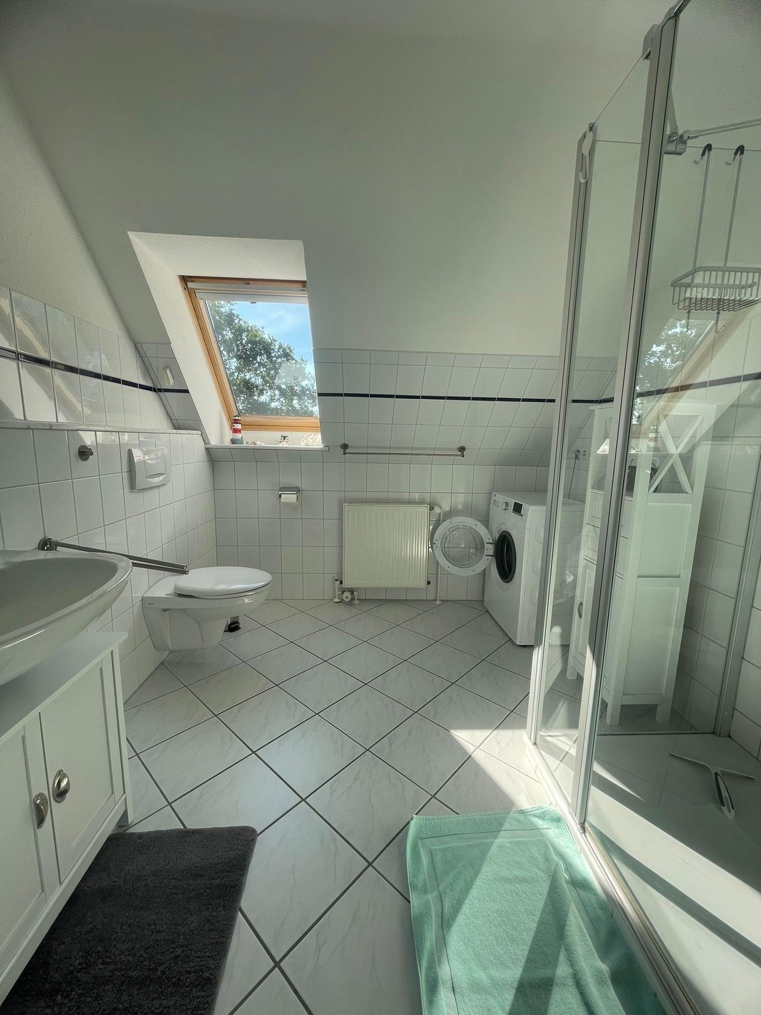 Das Badezimmer ist ebenfalls gut ausgestattet und verfügt über eine Waschmaschine, was für zusätzlichen Komfort sorgt, besonders bei längeren Aufenthalten. Ob nach einem Tag am Strand oder einer Erkundungstour durch die Umgebung – hier können Sie sich erfrischen und entspannen.
