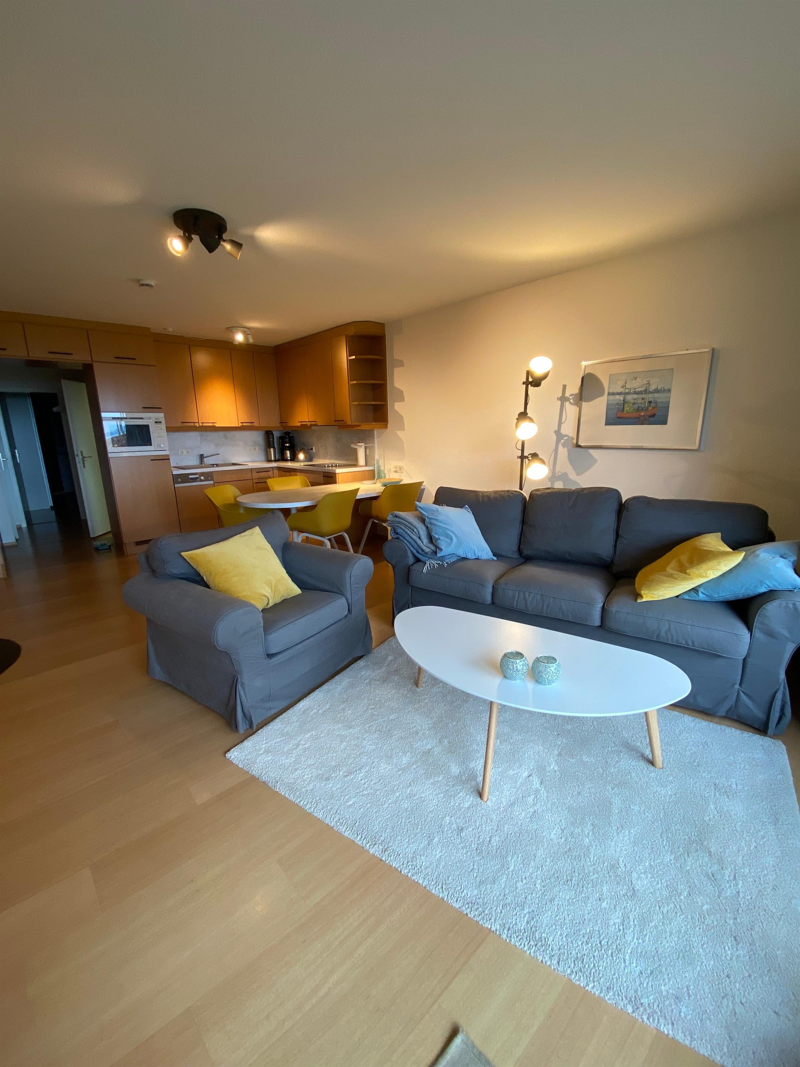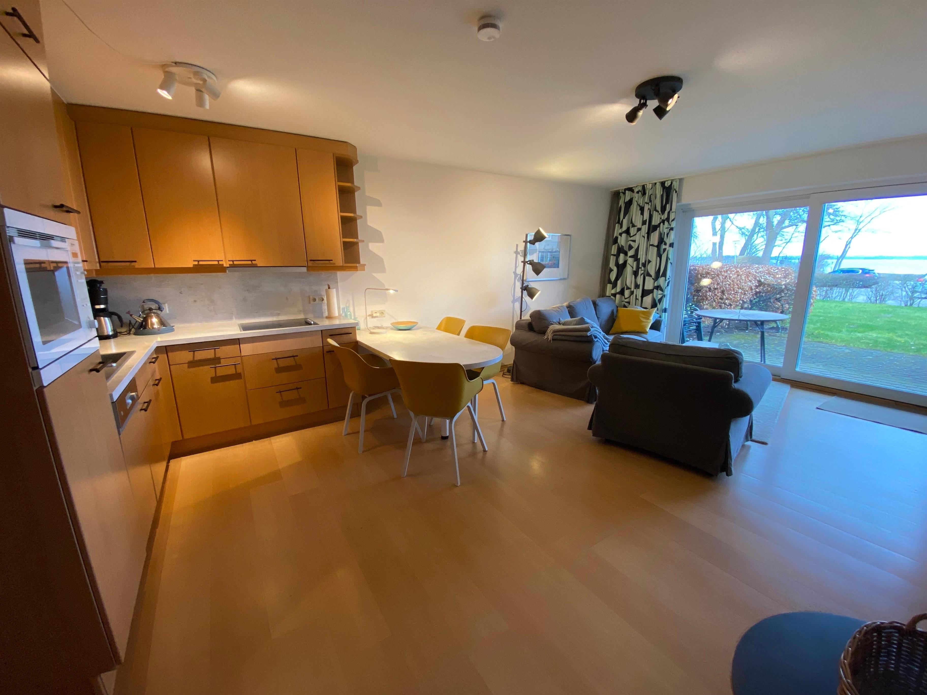 Das Herzstück der Wohnung bildet der großzügige Wohn-Essbereich, der mit einer modernen Küchenecke ausgestattet ist. Hier finden Sie einen Esstisch sowie eine gemütliche Sitzecke, die zum Verweilen einlädt. Genießen Sie von der Terrasse aus den atemberaubenden Blick über die Förde bis nach Dänemark — ein idealer Ort, um den Tag bei einem Glas Wein ausklingen zu lassen oder das Frühstück unter freiem Himmel zu genießen.
