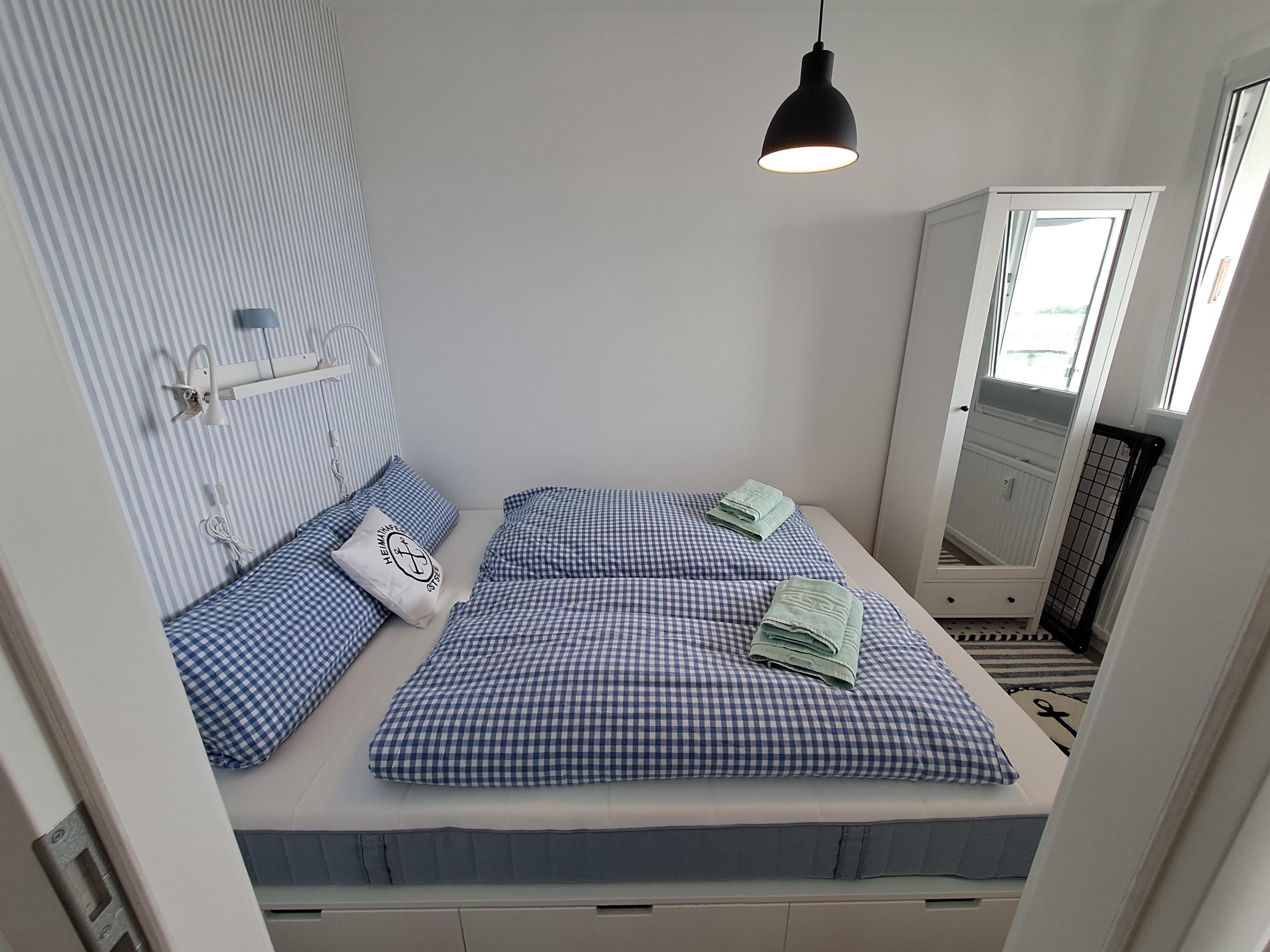 Das Schlafzimmer ist mit einem 160 cm breiten Doppelbett ausgestattet, das für erholsame Nächte sorgt. Das moderne Duschbad mit WC bietet zusätzlichen Komfort. Der Balkon, ausgestattet mit Gartenmöbeln, lädt dazu ein, die frische Luft zu genießen und die Seele baumeln zu lassen, während Sie den herrlichen Blick auf das Wasser und die Umgebung genießen.