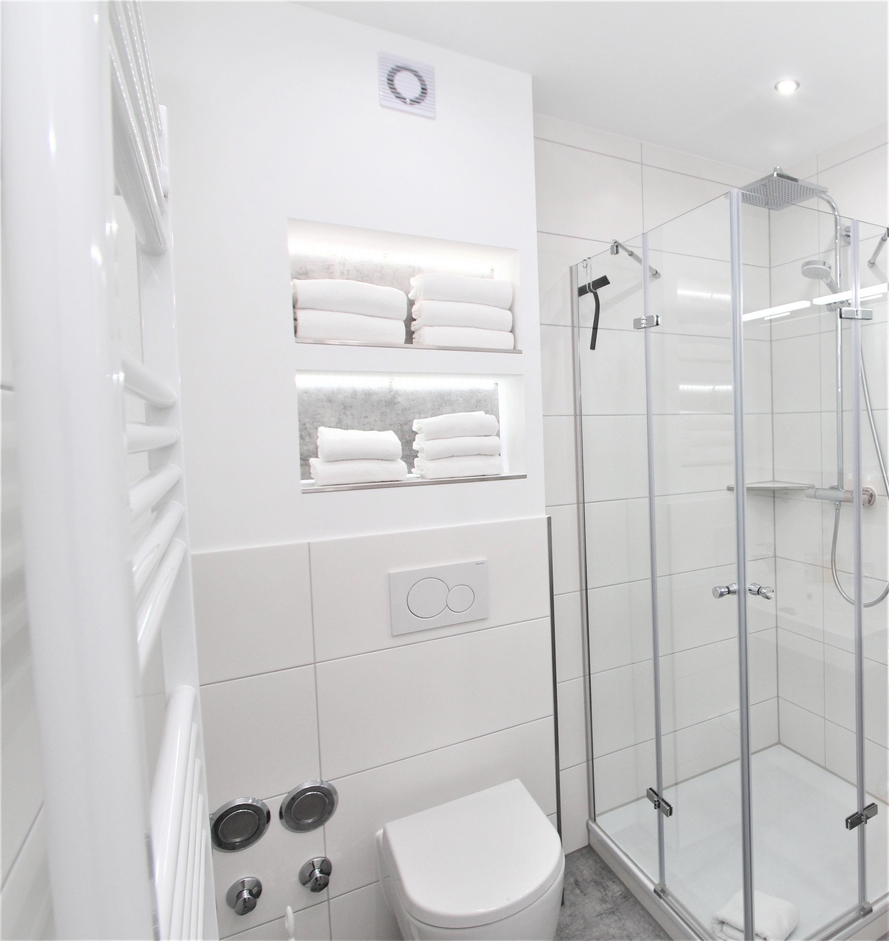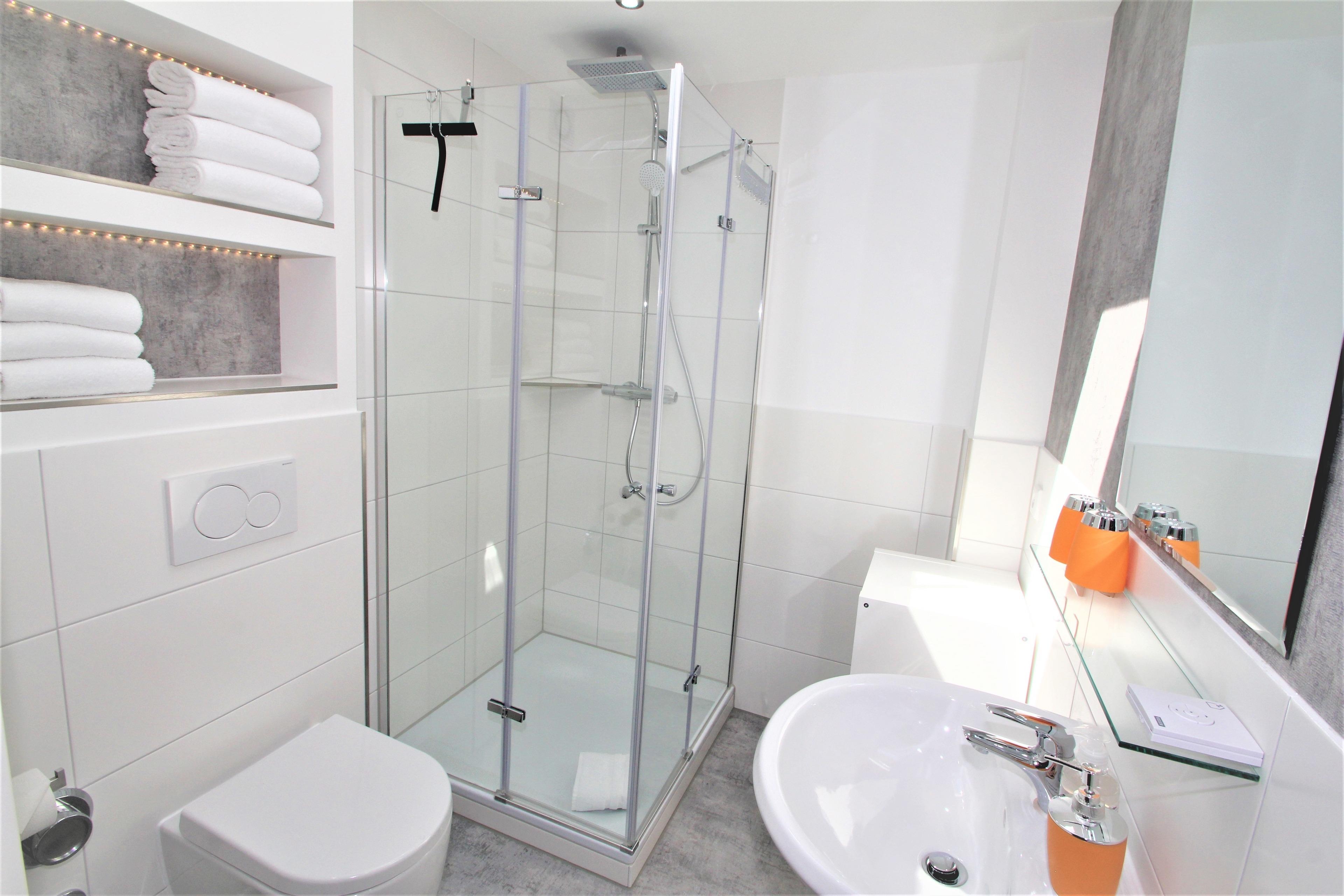 Das stilvolle Badezimmer ist mit einer modernen Dusche, einem Waschbecken und einem Haartrockner ausgestattet. Frische Bettwäsche und Handtücher können auf Wunsch gegen eine Gebühr zur Verfügung gestellt werden, sodass Sie sich um nichts kümmern müssen.