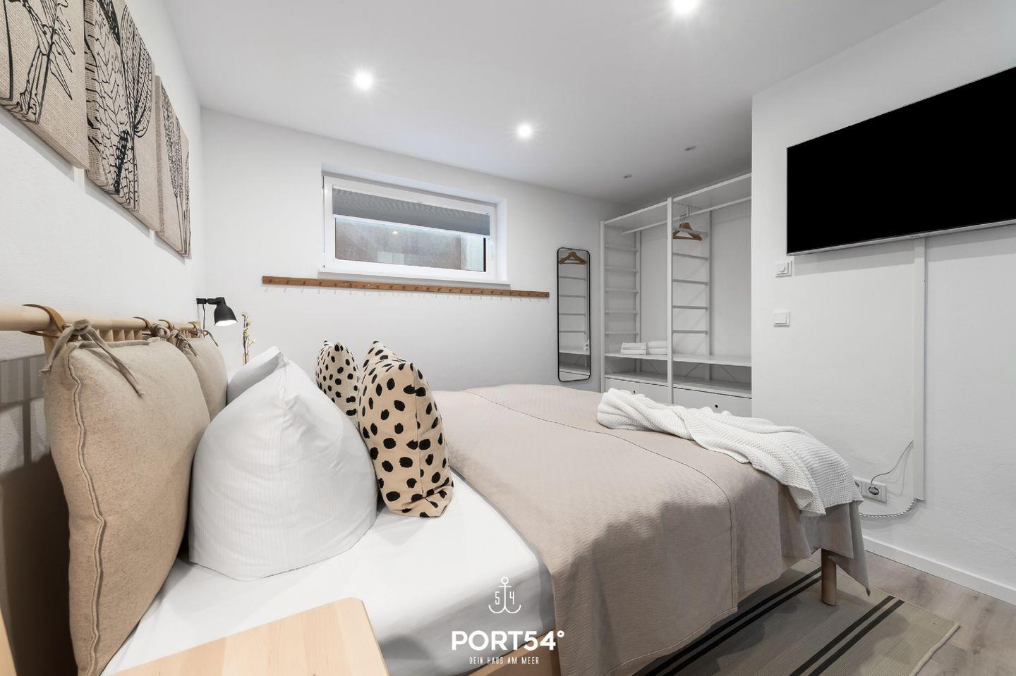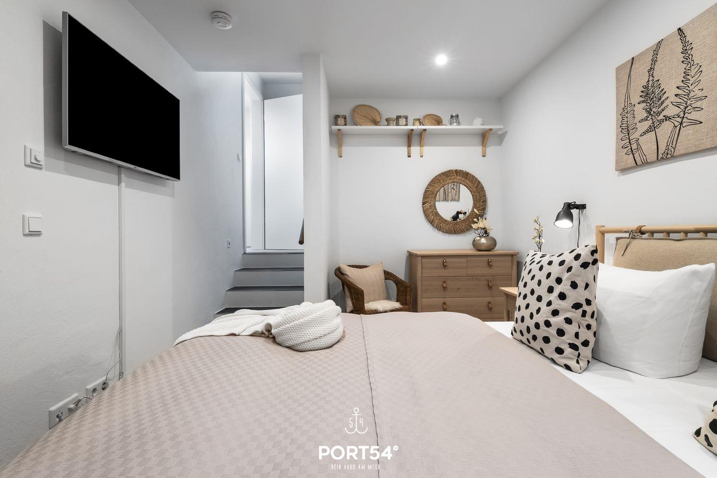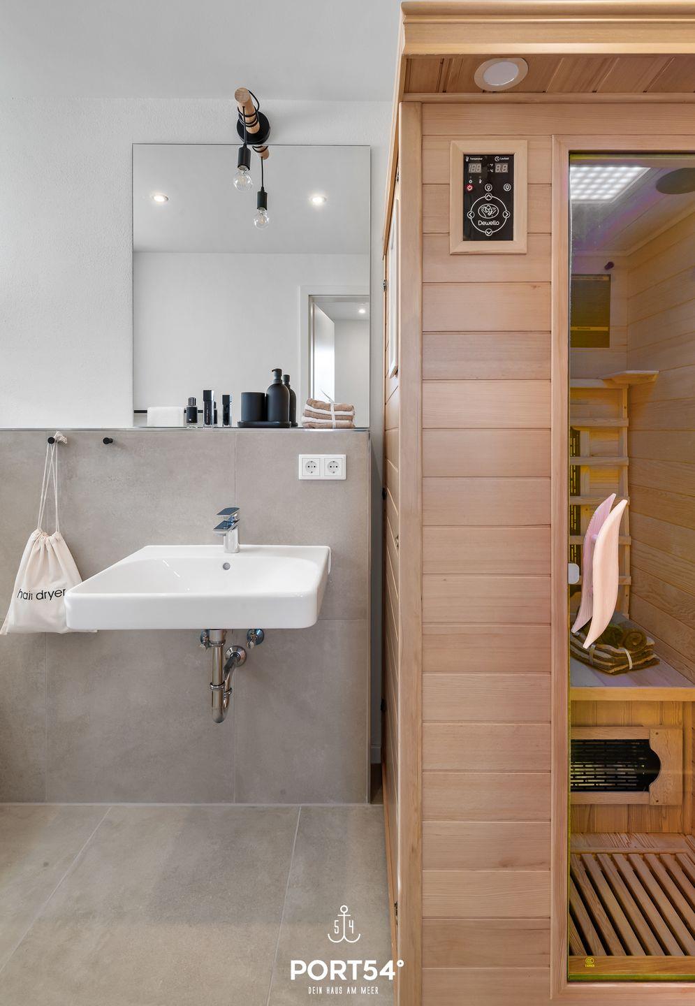 Mit Meerblick und Infrarot-Sauna lädt die Doppelhaushälfte "Meerliebe" zu jeder Jahreszeit zu einem Urlaub direkt an der Ostsee ein. Bis zu vier Personen finden auf rund 70m² Platz. Das Schlafzimmer im Souterrain mit TV bietet in einem Doppelbett (180x200cm) ruhige Nächte für 2 Personen. Ebenfalls im Souterrain befindet sich das Badezimmer, welches Sie mit einer bodengleichen Dusche, sowie eine Infrarot-Sauna erwartet. Nach langen Spaziergängen kann hier herrlich entspannt werden! Zwei weitere Schlafmöglichkeiten bietet die bequeme Couch (140x200cm) im offenen Wohn- und Essbereich mit angrenzender Küche. In der vollausgestatteten Küche können Sie nach Lust & Laune kochen und danach die Abende auf dem gemütlichen Sofa oder auf der Dachterrasse ausklingen lassen. Die Dachterrasse mit Gartenmöbeln bietet einen traumhaften Blick auf die Ostsee. Hier lassen sich sonnige Frühstücke oder laue Sommerabende am Elektro-Grill verbringen. Direkt vor dem Haus befindet sich eine eigene Parkfläche mit Zugang zur E-Ladesäule.