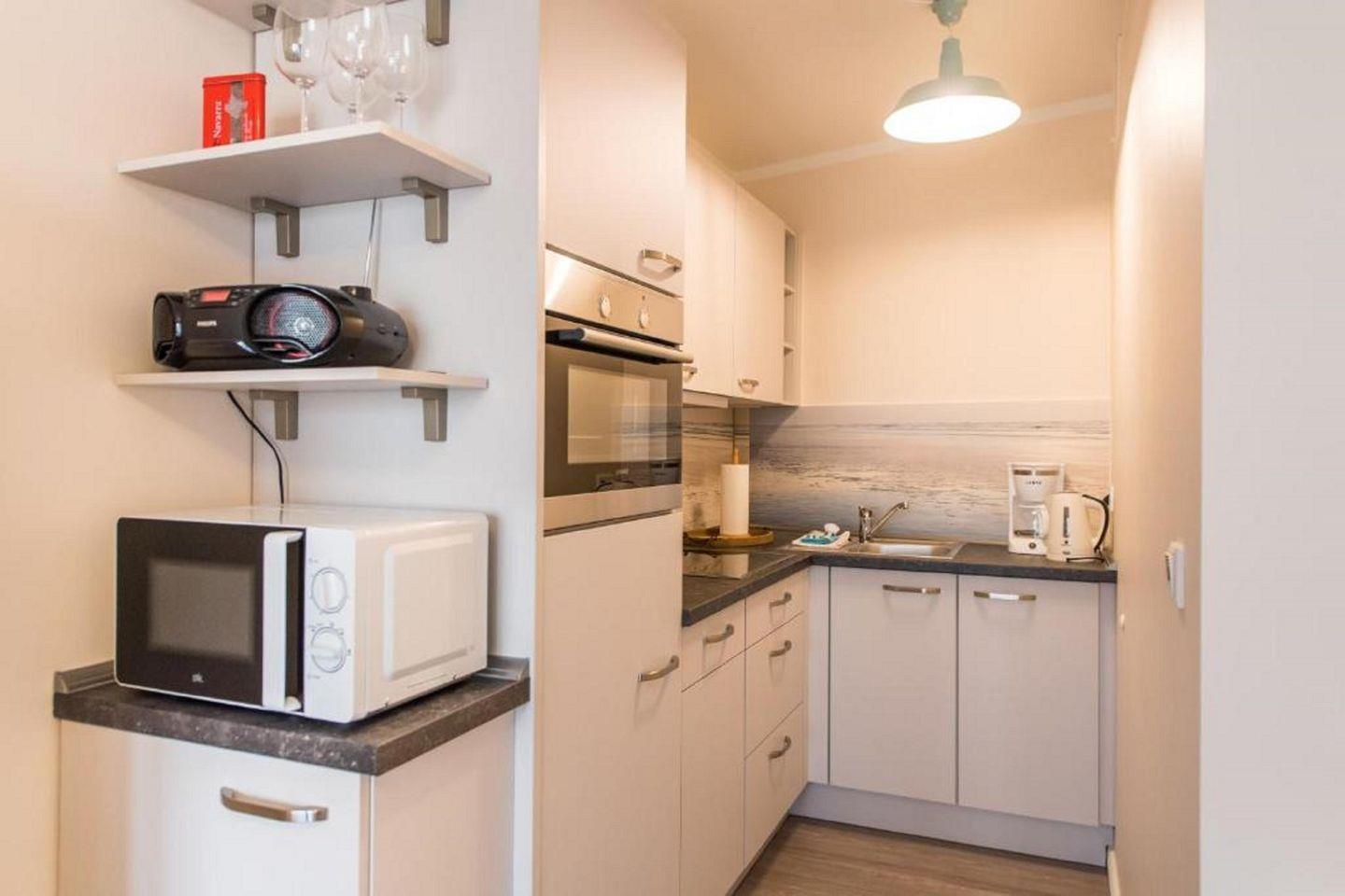 Diese 35m² große Ferienwohnung liegt nur wenige Meter vom Strand entfernt und bietet Ihnen einen offenen Wohn-/Essbereich mit integrierter voll ausgestatteter Küche, ein Schlafzimmer, gemütlich eingerichtet mit 2 Einzelbetten & einem Badezimmer, das über eine großzügige Dusche verfügt. Erwähnenswert ist auch der Balkon, von dem Sie einen fantastischen Ausblick haben und den Tag mit einem Glas Wein ausklingen lassen können.