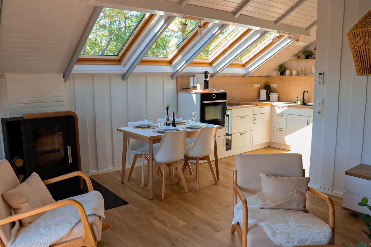 Das dänische Ferienhaus "Kiek in" bietet auf 63m² Traumurlaub pur! Im offenen Wohn- und Essbereich mit Küchenzeile kann auf dem Sofa herrlich entspannt und in der Küche nach Lust & Laune gekocht werden. Durch die bodentiefen Fenster und großen Dachfenster bietet das Ferienhaus jede Menge Licht und durch die gemütliche Einrichtung kommt direkt Urlaubsfeeling auf! Der Kamin sorgt an kälteren Tagen für eine wohlige und gemütliche Atmosphäre. An warmen Sommertagen schafft die Klimaanlage eine angenehme Temperatur. Das Ferienhaus bietet zwei Schlafzimmer: eines ist mit einem kleinen gemütlichen Doppelbett (140×200cm) ausgestattet, das andere Schlafzimmer bietet zwei komfortable Einzelbetten (je 80×200cm). Beide Zimmer sind mit Flachbild-TVs eingerichtet und für erholsame Urlaubsnächte gibt es Verdunkelungsmöglichkeiten. Ein weiteres kleines Zimmer bietet ein Hochbett (für Kinder bis 12 Jahre) mit einem Schreibtisch - ideal, falls im Urlaub die Arbeit doch nicht warten kann. Das Sofa im Wohnbereich lässt sich zu einem Schlafsofa ausziehen und bietet eine weitere Schlafmöglichkeit (140×200cm). Im Badezimmer finden Sie eine Dusche sowie Föhn und Handtuchtrockner vor. Der Hauswirtschaftsraum verfügt über eine Waschmaschine und einen Wäscheständer, sodass auch längeren Aufenthalten nichts im Wege steht! Die große Holzterrasse lädt zu gemütlichen Sonnenstunden mit der ganzen Familie. Der Sonnenschirm sorgt für ein schattiges Plätzchen und an lauen Sommerabenden kann am Holzkohlegrill gegrillt werden. Auf der Auffahrt zum Ferienhaus sind hintereinander zwei PKW-Stellplätze vorhanden. Der Strand befindet sich in ca. 150m Entfernung, sodass Sie den Strand zu jeder Zeit in nur wenigen Fußminuten erreichen können! Abends den Sonnenuntergang am Meer beobachten, Spaziergänge an der frischen Meerluft und an heißen Sommertagen im erfrischenden Meer baden gehen - was will man Mee(h)r?