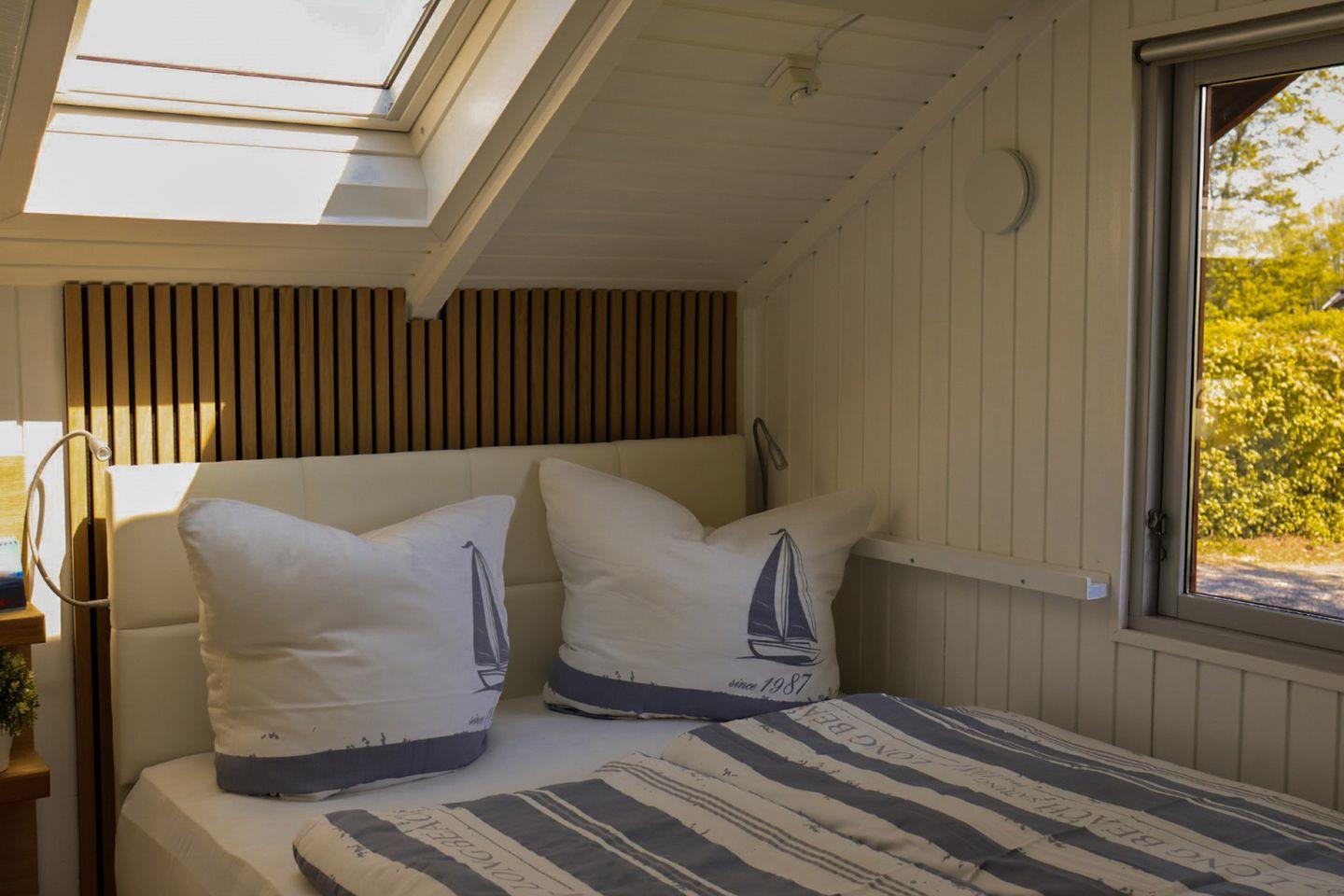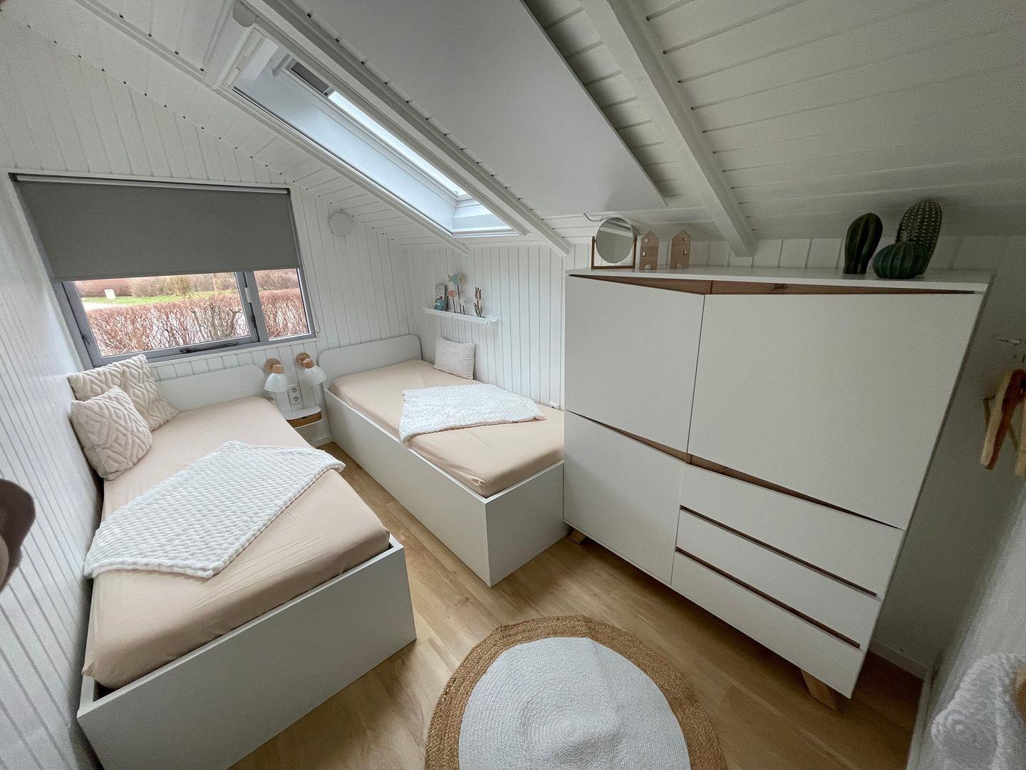 Das Ferienhaus "Kiek in" bietet einen offenen Wohn- und Essbereich, zwei Schlafzimmer, ein Badezimmer und eine große Sonnenterrasse. Das eine der beiden Schlafzimmer bietet ein kleines Doppelbett (140×200cm) und das andere Schlafzimmer verfügt über 2 Einzelbetten (je 80×200cm). Ein weiteres Zimmer bietet ein Hochbett (bis 12 Jahre) sowie einen Schreibtisch. Das Badezimmer bietet eine Dusche. Die möblierte Terrasse lädt zu gemütlichen Sonnenstunden ein. Zwei PKW-Stellplätze sind vorhanden.