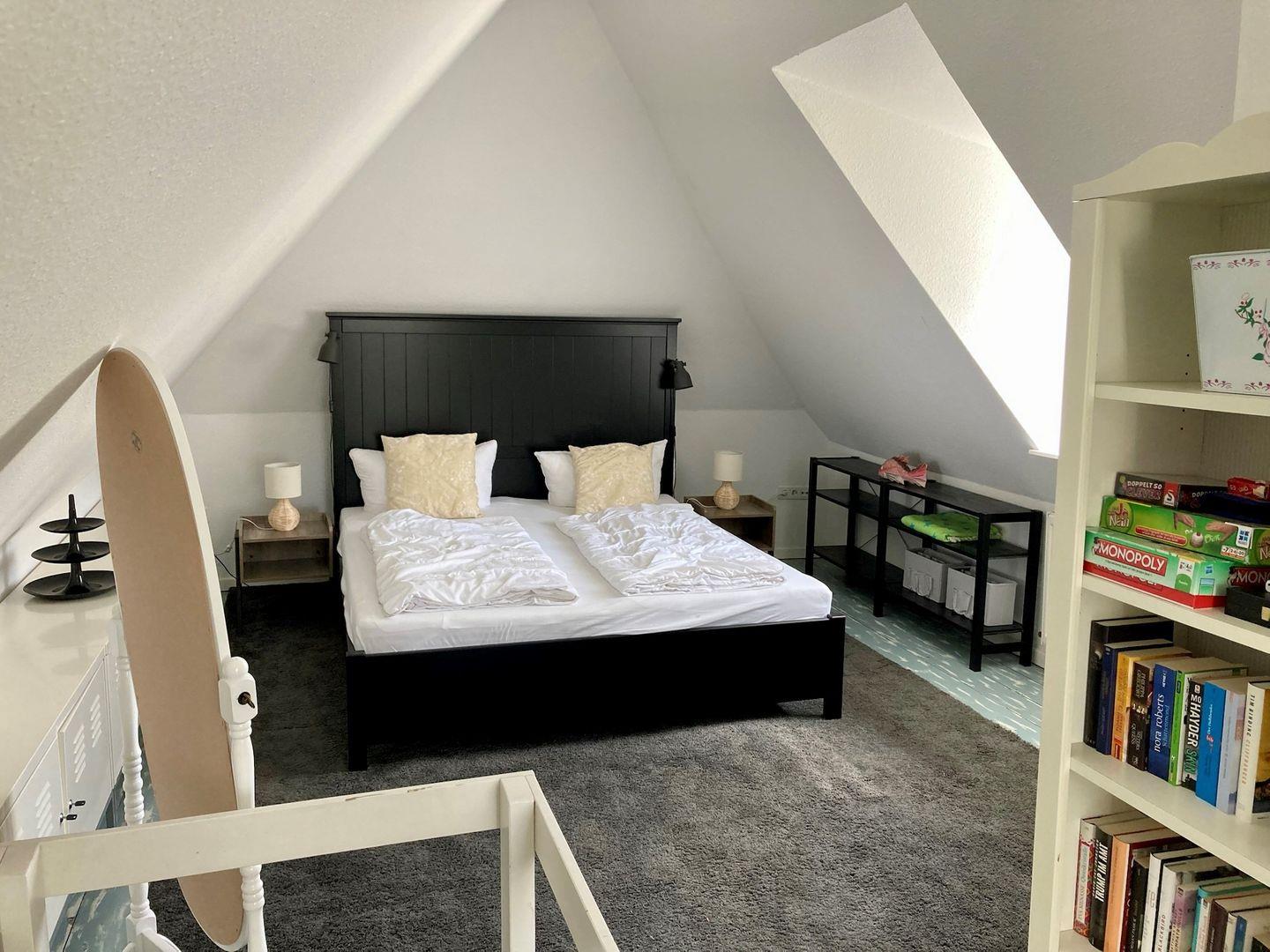 Das "alte Holzfällerhaus" befindet sich unweit vom traumhaften Glücksburger Strand und bietet auf ungefähr 100m² Platz für bis zu fünf Personen. Im Erdgeschoss des freistehenden Ferienhauses befinden sich das Wohnzimmer mit Flachbild-Fernseher, eine voll ausgestattete Küche und ein separates Esszimmer mit erweiterbarem Esstisch und einem Holzofen, der an den kälteren Tagen für eine gemütliche Wärme im Haus sorgt. Das Duschbad im Erdgeschoss verfügt über eine sehr großzügige Dusche (mit hohem Einstieg), einen Kosmetikspiegel und eine Waschmaschine. Im Abstellraum finden Sie einen Wäscheständer und einen Staubsauger. Das Schlafzimmer im Erdgeschoss ist mit einem Doppelbett (180x200cm), einem Kleiderschrank und einem Schreibtisch ausgestattet. Für die Kleinen sind ein Kinderhochstuhl und ein Kinderreisebett vorhanden. Im Flur gelangen Sie über Sie über eine steile Treppe ins Obergeschoss und befinden sich direkt im zweiten Schlafzimmer. In dem offenen Galerie-ähnlichem Raum befindet sich ein Doppelbett (180x200cm) und Kommoden, zudem haben Sie einen tollen Blick in den Garten. Hier befinden sich auch die Gesellschaftsspiele und Bücher. Ein weiterer Wohnraum mit Schlafsofa und ein Gäste-WC sind ebenfalls im Obergeschoss untergebracht. Ein Hund darf Sie gern begleiten. Im eingezäunten Garten ist für Hund und Kind viel Platz zum Toben und Spielen - auch ein Fußballtor ist vorhanden. Auf der geschützten Terrasse können Sie hervorragend auf den Gartenmöbeln und den Sonnenliegen Ihren Urlaub genießen. Ihre Fahrräder können Sie in einem offenen und sichtgeschützten Unterstand im Garten abstellen. Für Ihren PKW befindet sich gegenüber ein kleiner öffentlicher Parkstreifen, daneben befindet sich ein öffentlicher Spielplatz.