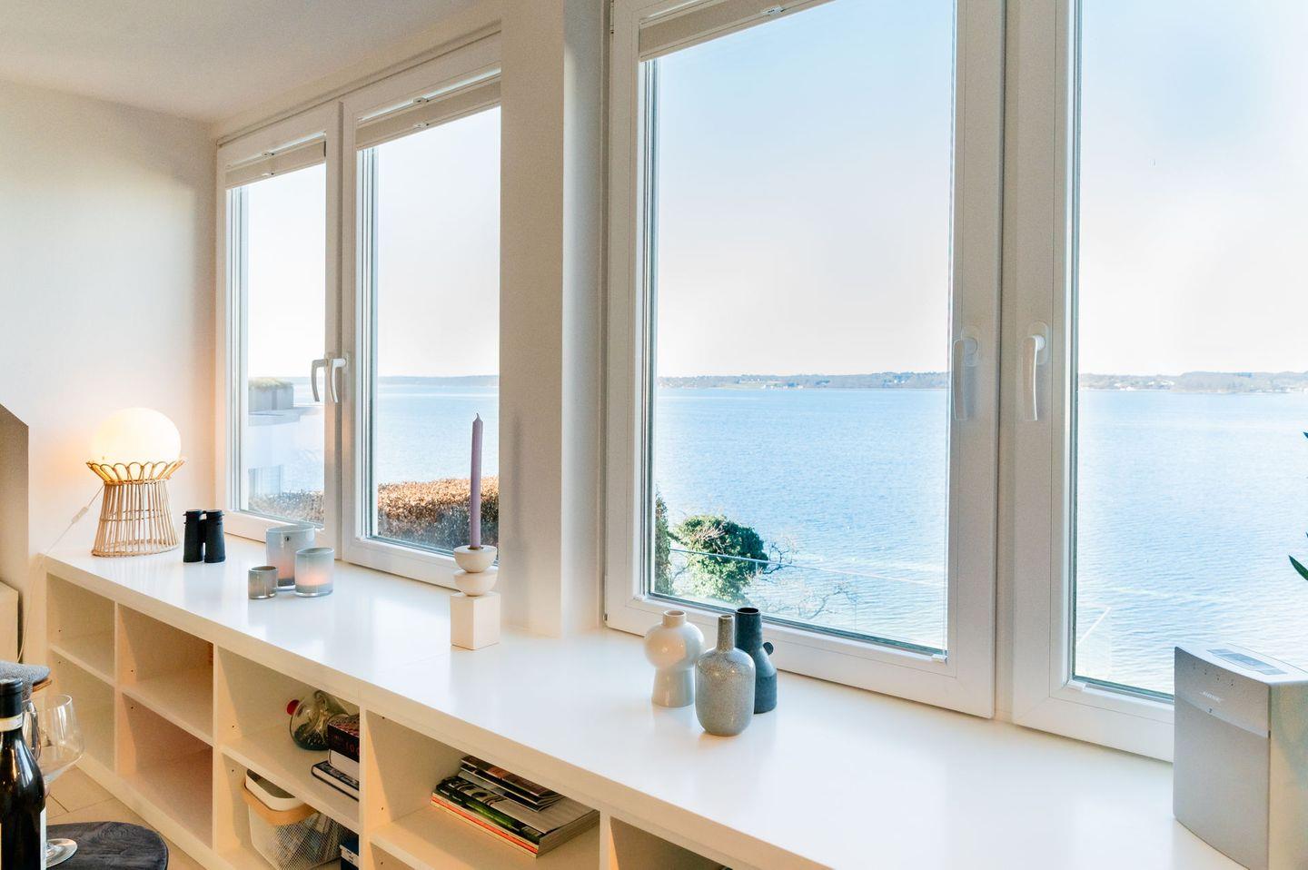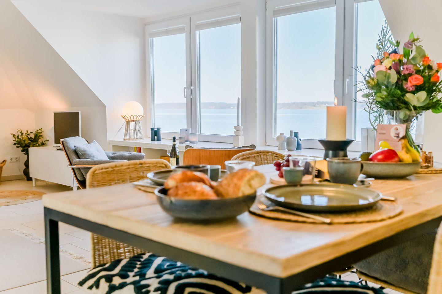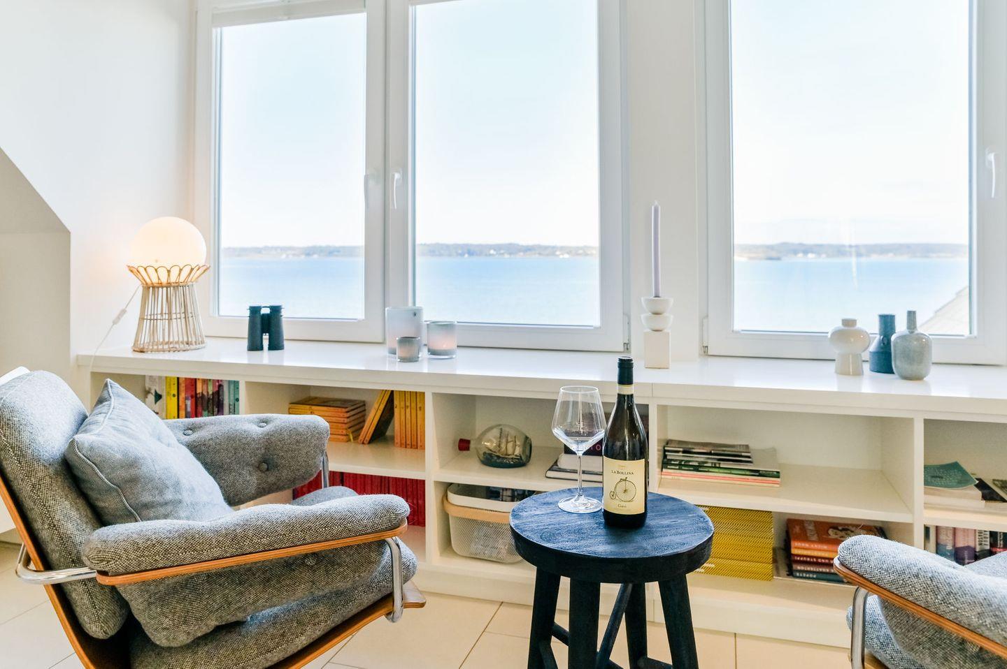 Moderne Ferienwohnung mit Panorama-Meerblick und Strandzugang in Glücksburg, perfekt für erholsame Tage zu zweit.