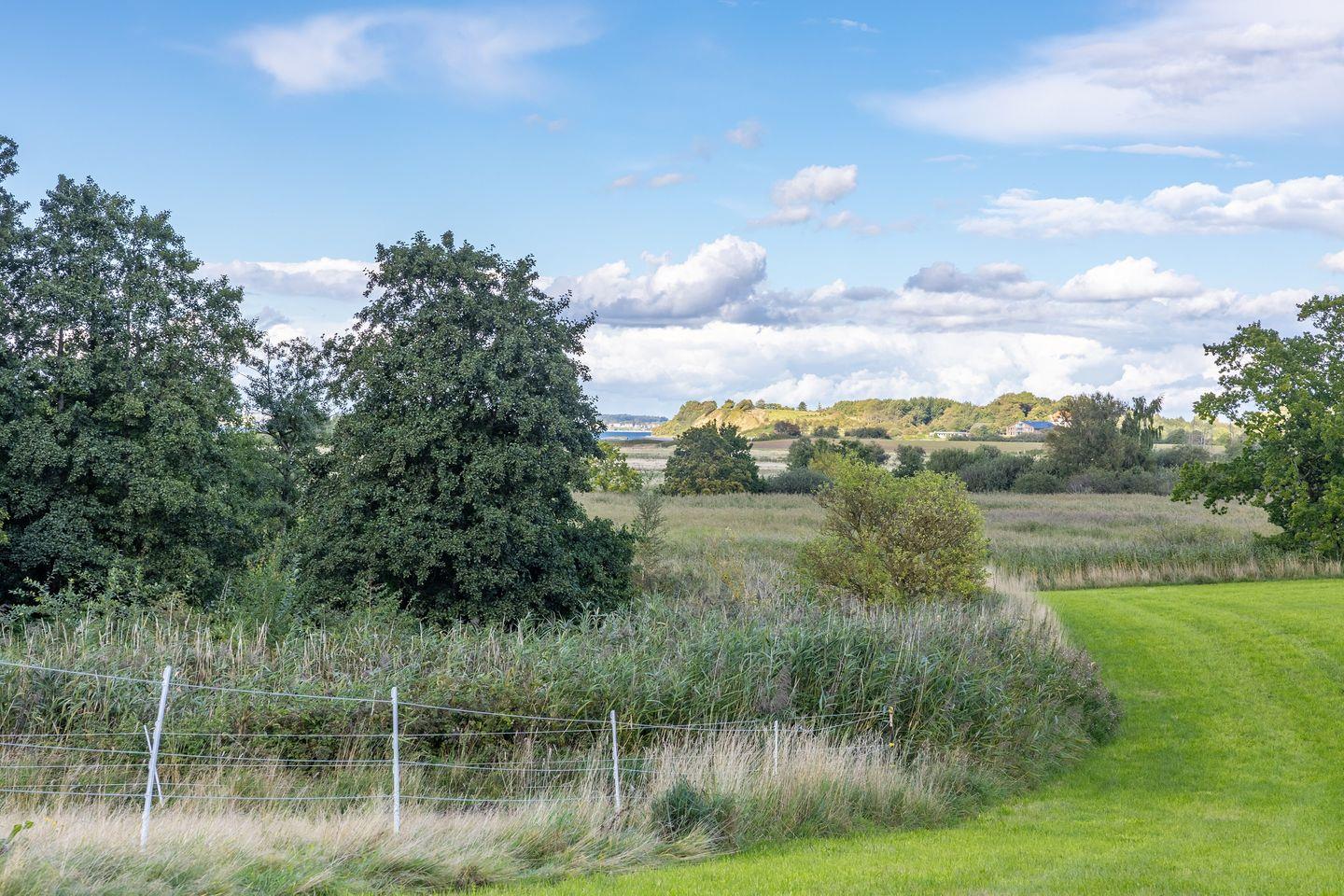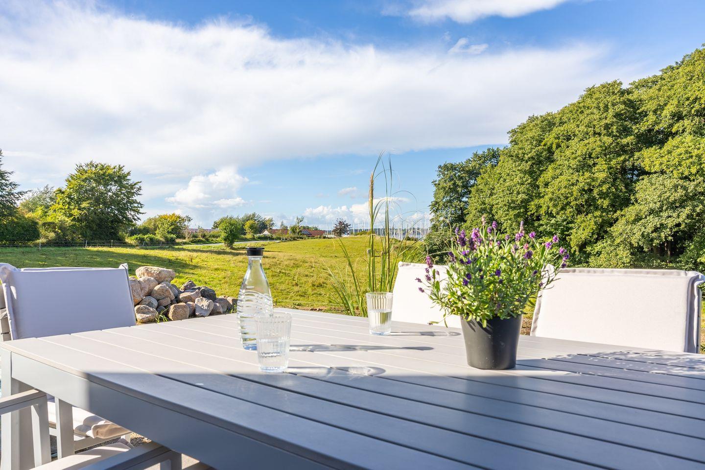 Modernes Ferienhaus in Glücksburg mit Terrasse, Strandkorb und Blick auf Segelhafen am Naturschutzgebiet.
