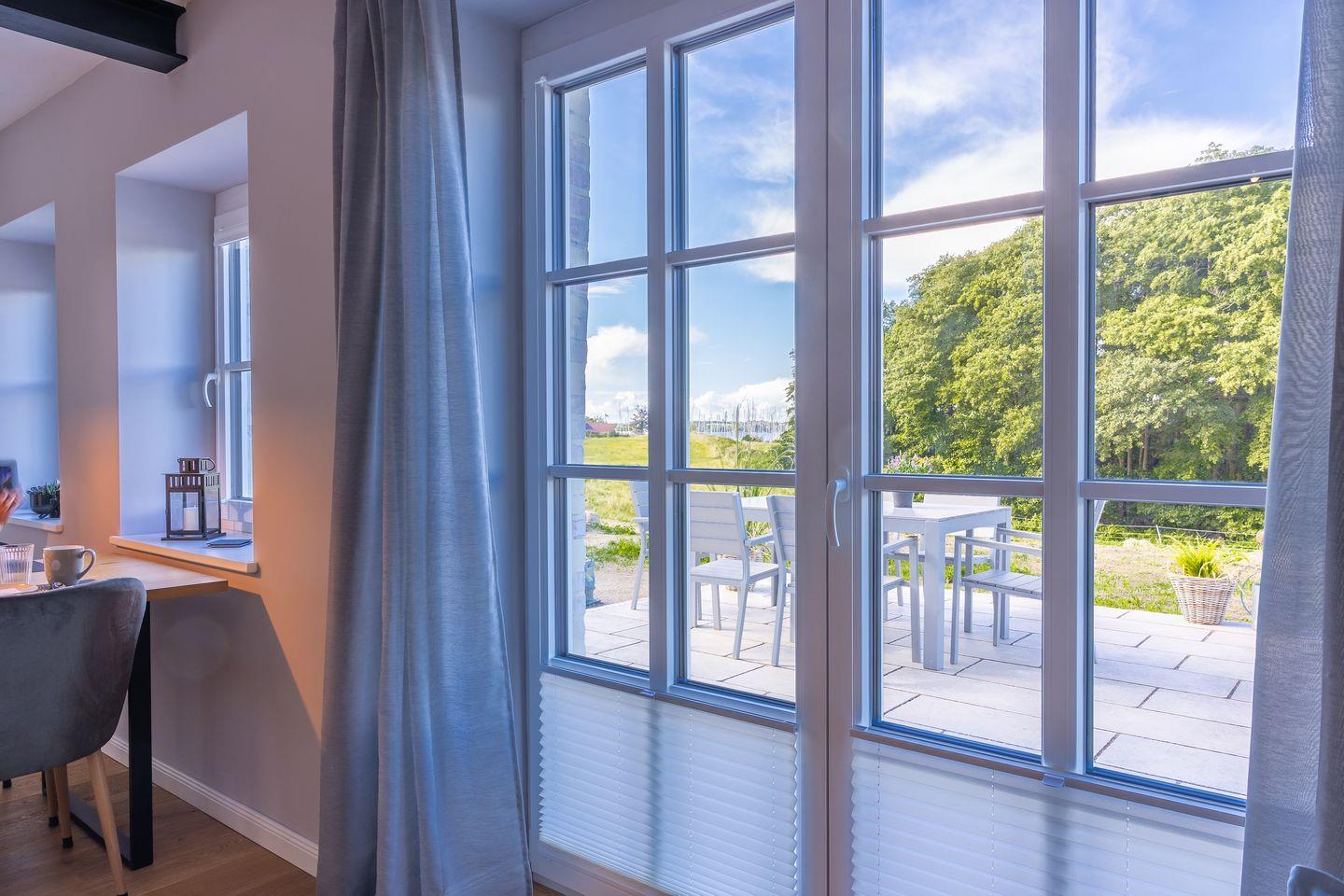 Ferienhaus mit Terrasse und Blick auf Segelhafen