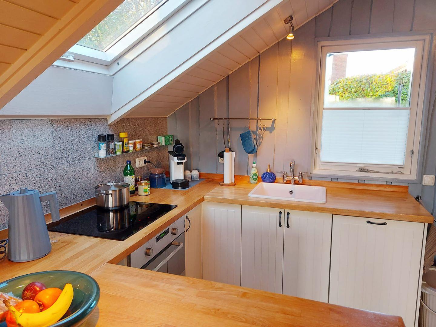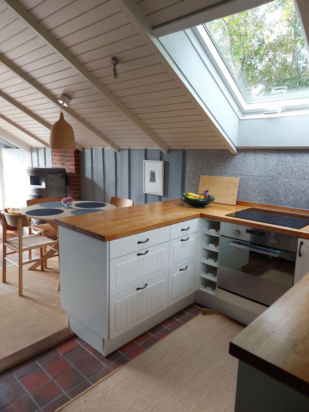 Das helle Wohnzimmer lädt mit einem gemütlichen Kaminofen und TV, auch an kühleren Tagen zu entspannten Stunden ein, während die offene Küche mit Herd, Backofen, Kühlschrank, Geschirrspüler und Kaffeemaschine zum gemeinsamen Kochen einlädt.