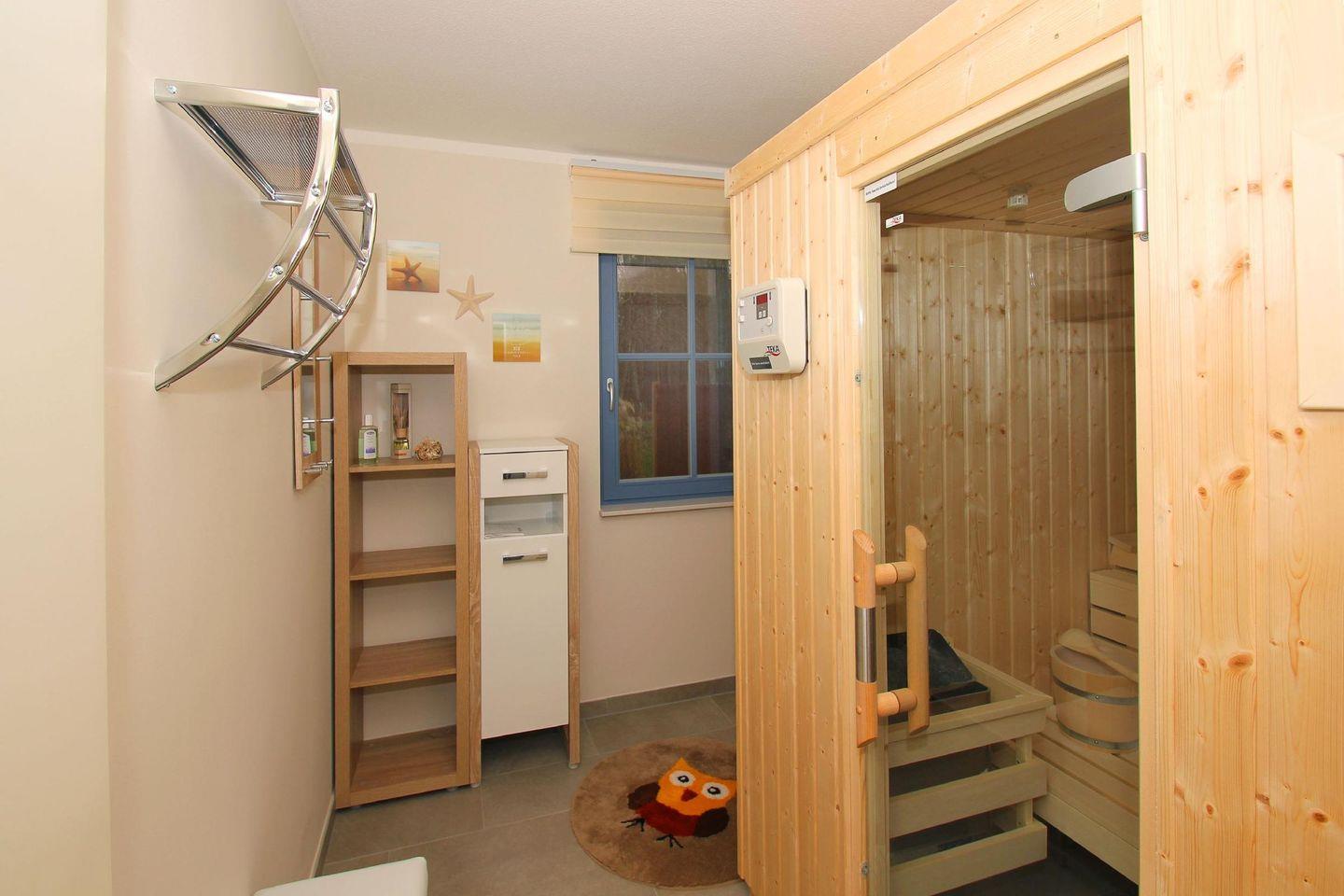 Zwei separate Schlafzimmer, eines mit einem großzügigen Doppelbett und das andere mit zwei Einzelbetten sowie modernes Duschbad mit Sauna und ein Gäste-WC machen das Ferienhaus komplett.