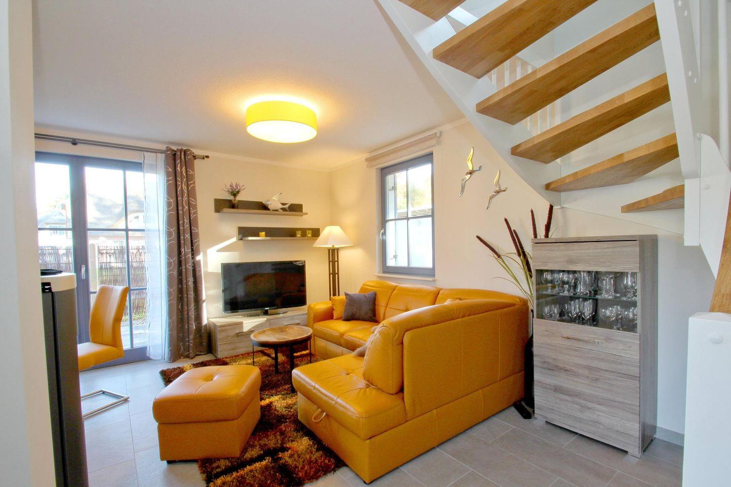 Im Ferienhaus erwartet Sie ein großzügiger Wohnbereich mit Sofaecke, Flachbild-TV, Kamin, Doppelbett und eine voll ausgestattete offene Küche mit Essbereich.