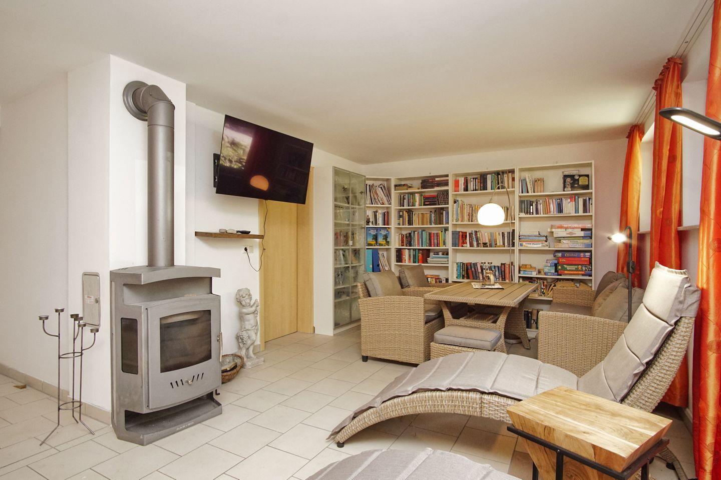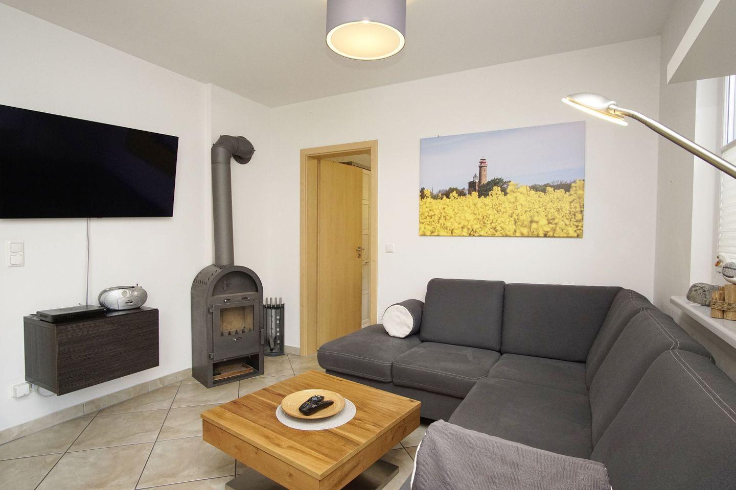 WOHNEN // Wohnraum mit Essbereich, Sitzgarnitur mit bequemer Couch, Kaminofen ,Flachbild-TV (Kabel) und Sky Komplettpaket, Radio ++