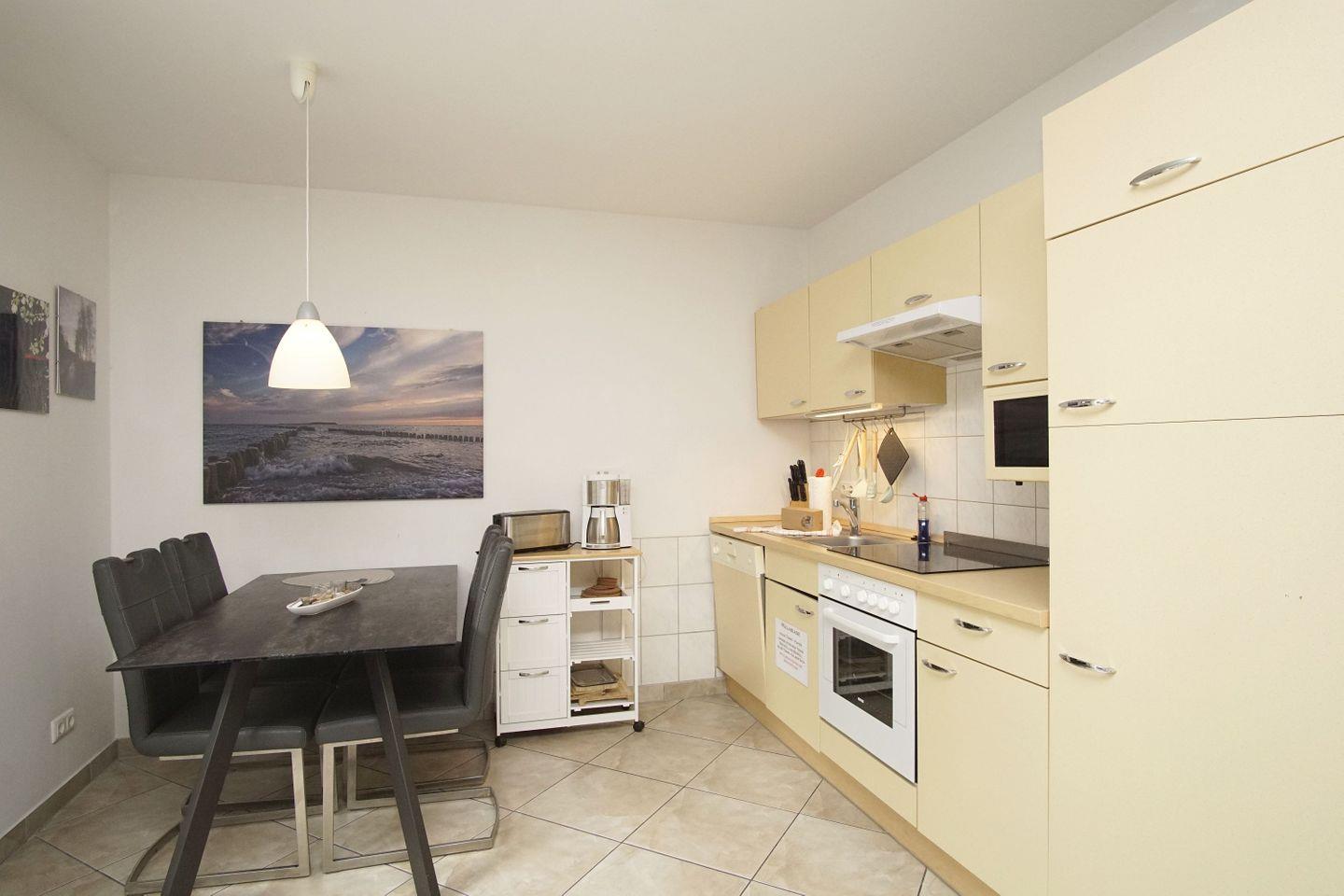 KÜCHE // Küchenzeile, 4-Platten Ceranfeld, Spülmaschine, Kühlschrank mit Gefrierfach, Backofen, Mikrowelle, Toaster, Wasserkocher, Kaffeemaschine, reichlich Besteck, Geschirr und Küchenutensilien ++
