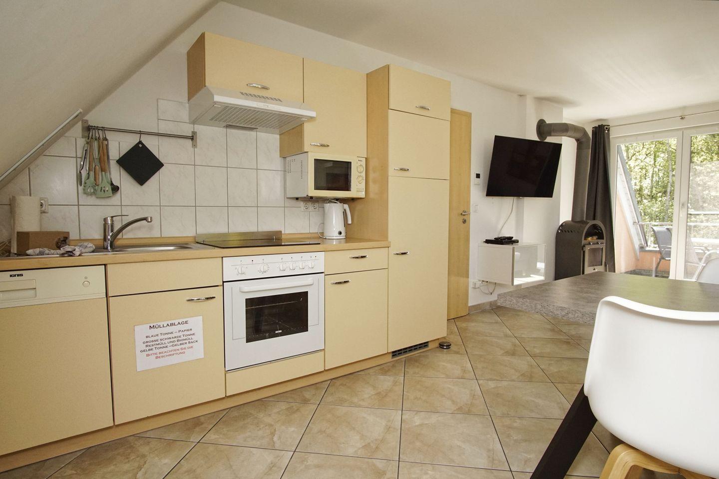 KÜCHE // Küchenzeile, 4-Platten Ceranherd, Spülmaschine, Kühlschrank mit Gefrierfach, Backofen, Mikrowelle, Toaster, Wasserkocher, Kaffeemaschine, reichlich Besteck, Geschirr und Küchenutensilien ++