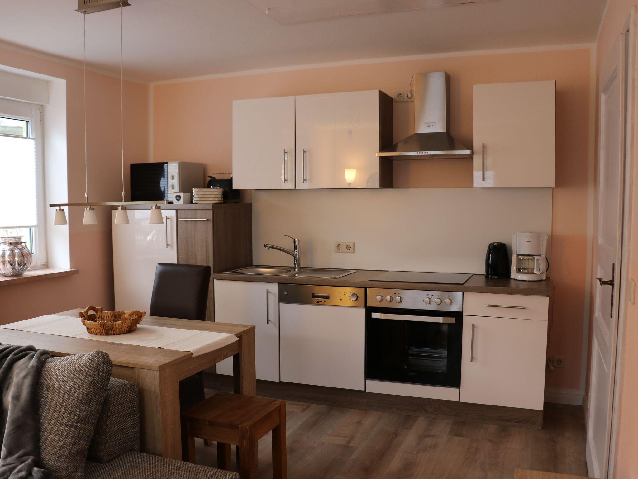 Ausstattung der Küche: Geschirrspüler, Herd mit Backofen, Kühlschrank, Mikrowelle, Toaster, Kaffeemaschine, Wasser- und Eierkocher.