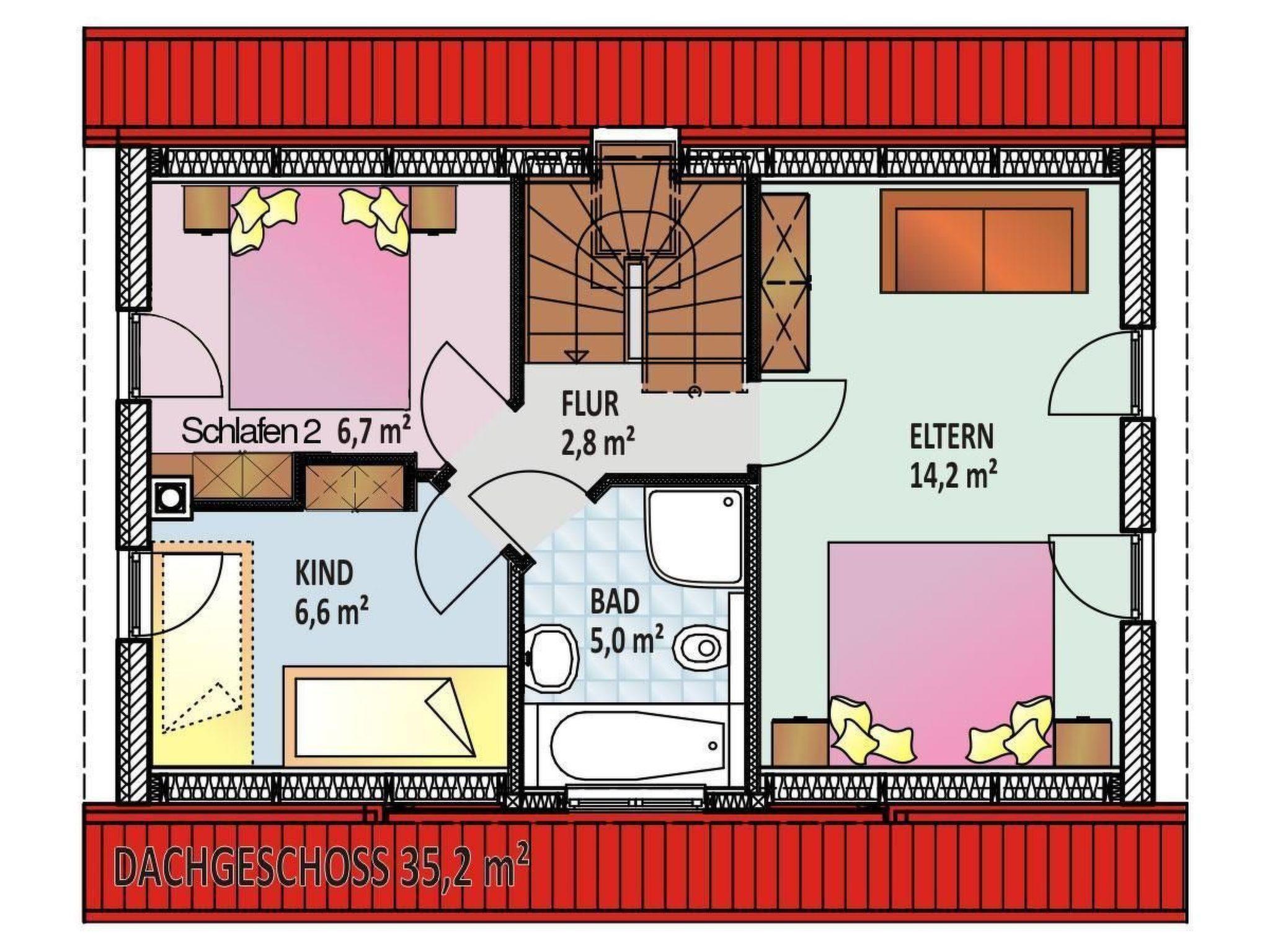 Der überwiegende Teil des Erdgeschosses wird als kombinierter Wohn- und Essbereich genutzt, wobei vier Terrassentüren den unmittelbaren Blick nach Süden und Westen auf die Blütengewächse im Garten freigeben. Sie erreichen hier auch unmittelbar die beiden halbrund gestalteten Terrassen. Im großzügigen Wohnzimmer lädt die gemütliche Sitzgruppe zum Entspannen ein. Hier können Sie sich am Kaminfeuer erfreuen und über die moderne TV- und Stereoanlage fernsehen, gute Musik hören, über den DVD-Player Filme anschauen oder über WLAN im Internet surfen. Zum Speisen und Spielen bietet sich der große Familientisch aus Massivholz an. Kleine Gäste können im Kinderhochstuhl Platz nehmen. Die Bilder an den Wänden sowie verschiedene Bücher über die Insel Rügen regen Sie zu Entdeckungstouren in der unmittelbaren Umgebung an. Für Unterhaltung sorgt auch das E-Piano, auf dem Sie sich entfalten können (bitte bei Buchung angeben). Die offene Küche schließt sich unmittelbar an und ist hochwertig ausgestattet. Dazu gehören der Herd mit Ceran-Kochfeld und Backofen, Geschirrspüler, Einbau-Mikrowelle, Kühlschrank mit separatem Gefrierfach, Kaffeemaschine, Mixer, Toaster und Wasserkocher und viele andere Utensilien. Vor der Spüle lässt ein Fenster die Morgensonne hinein. Im Eingangsbereich in das Ferienhaus befinden sich eine große Garderobe, ein Spiegel und ausreichende Ablagemöglichkeiten sowie ein Einbauschrank für Haushaltsgegenstände. Außerdem erreichen Sie hier das WC. Das Dachgeschoss verfügt über drei Schlafzimmer und zwei Doppelbetten sowie zwei Einzelbetten. Ein Kinderreisebett ist vorhanden. Die bodentiefen Fenster sorgen für viel Licht und Behaglichkeit. Zur Verdunklung sind Rollos vorhanden. Insektenschutzgitter schützen vor Plagegeistern. Die Zimmer sind mit umfangreichem Schrankraum ausgestattet. Das größere Schlafzimmer bietet dank der offenen Balkenlage ein großzügiges Wohngefühl. Hier können Sie sich zurückziehen und es sich auf dem Sofa gemütlich machen. Weiterhin befindet sich im Dachgeschoss ein hochwertig eingerichtetes Bad mit Runddusche, Badewanne, WC und großem Spiegel mit LED-Beleuchtung.