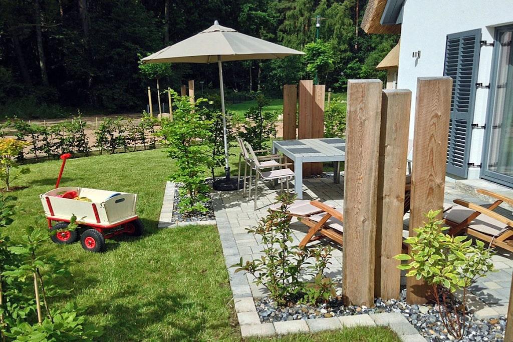 Erholungsort Glowe, Doppelhaus (Haushälfte rechte Seite) über 2 Etagen, ruhige Lage, ca. 600m zum Sandstrand (Ostsee), ca. 800 m zum Bodden Erdgeschoss: Wohn- Essbereich mit Fußbodenheizung, gemütliche Couchlandschaft, TV/ Sat (Flatscreen), Blu-ray Player, offene komplett ausgestattete Einbauküche mit 4- Plattenherd (Ceranfeld), Backofen, Kühlschrank mit kleinem Gefrierfach, Mikrowelle, Geschirrspüler und diversen Elektrogeräten (Kaffeemaschine mit Funktion Pad und Filter), der Esstisch ist individuell ausziehbar, Saunabereich mit Dusche, separates Gäste WC, Wirtschaftsraum mit Waschmaschine und zusätzlichem Kühlschrank(ohne Gefrierfach) Obergeschoss: 1. Schlafzimmer mit einem Doppelbett (2 Matratzen 90 x 200), Kleiderschrank und TV, 2. Schlafzimmer mit 3 Betten (1 Einzelbett und ein 2er Stapelbett, kann auch als Doppelbett gestellt werden) und Kleiderschrank, Bad mit Dusche , Föhn und WC, Terrasse mit Gartenmöbeln (inkl. Deckchairs), Sonnenschirm, Grill vorhanden Erstvermietung Februar 2017 - “ein perfekter Urlaubstraum im Reethaus-Dünenwald” Reetdachgedeckte Doppelhaushälfte, Nichtraucher, Internet (WLAN) kostenfrei vorhanden, gebührenpflichtige Wallbox (Ladestation für E-Auto) vorhanden (einmalige Pauschale in Höhe von 25 Euro), diverse Bücher und Gesellschaftsspiele sowie Strandspielzeug und Strandmuschel vorhanden, Fußbodenheizung im ganzen Haus, Saunanutzung (2 Euro / 3 Stunden), Waschmaschine ohne Gebühr, Liegewiese, Fahrradabstellmöglichkeiten vorhanden (Gartenhaus), 1 PKW- Stellplatz am Haus, Einkaufsmarkt, Bäcker und Restaurant in unmittelbarer Nähe, optimale Rad- und Wandermöglichkeiten