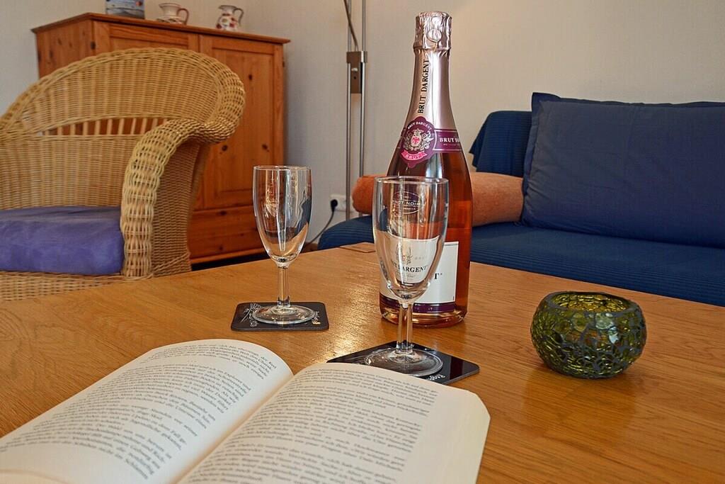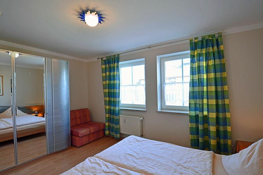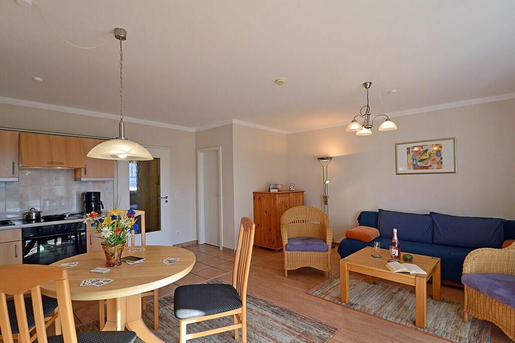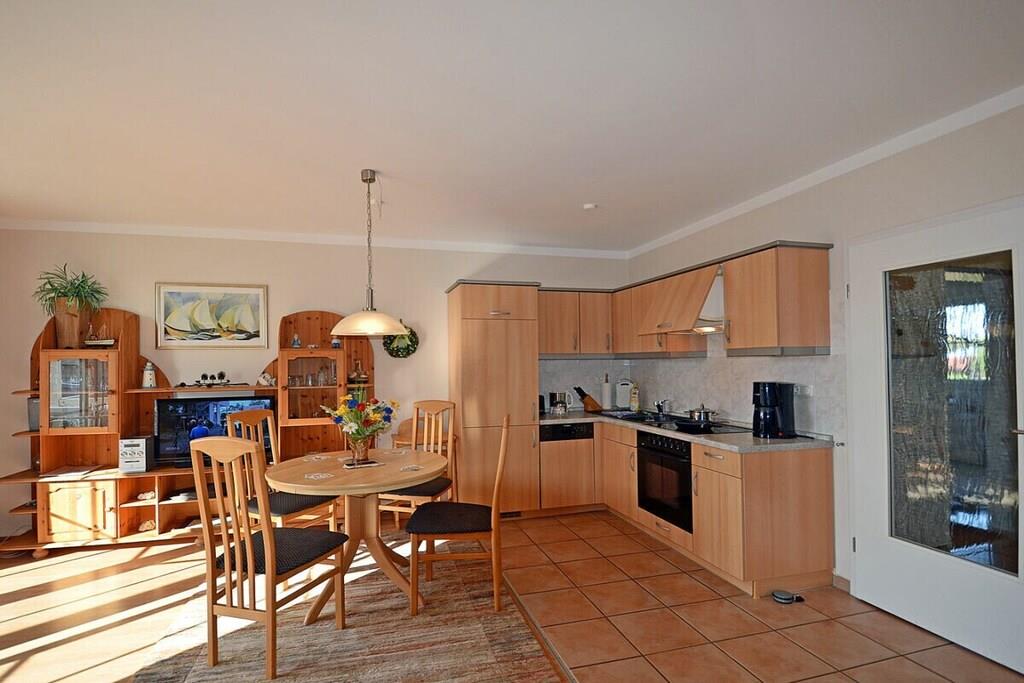Wohn- Esszimmer mit offenem Küchenbereich, gemütliche Schlafcouch mit bis zu 2 Liegeplätzen (Liegefläche: 150×200 cm), TV/Sat (Flatscreen), Radio/ CD, Bücher und Gesellschaftsspiele für gemütliche Abende, komplett mit Geschirr ausgestattete Einbauküche mit 4- Plattenherd (Ceranfeld), Backofen, Kühlschrank mit kleinem Gefrierfach, Geschirrspüler, Kaffeemaschine (Filter), Toaster, Wasserkocher und Mikrowelle, Holzkinderhochstuhl Schlafzimmer mit Doppelbett (getrennte Matratzen je 90×200 cm), Schlafsessel (Liegefläche: 80×190 cm) und großer Kleiderschrank, Fliegengitter im Schlafzimmer vorhanden, modernes Bad mit Dusche/ WC und Fön Abstellraum mit Waschmaschine Westbalkon mit Gartenmöbeln und Sonnenschirm
