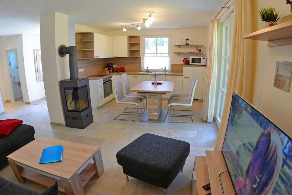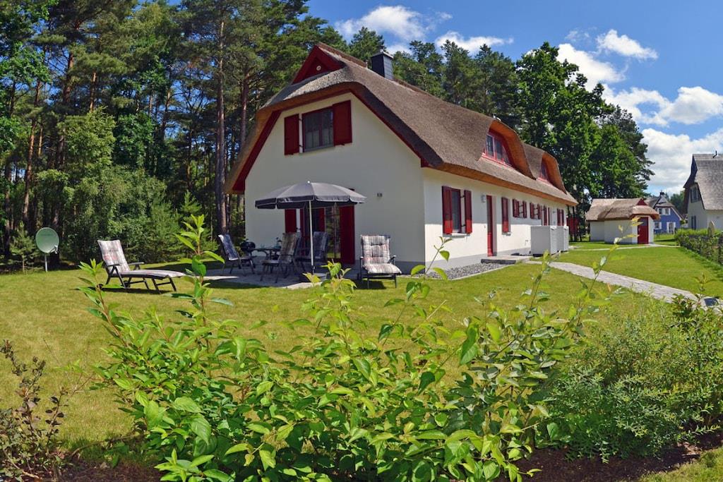 Erholungsort Glowe, Doppelhaus (Haushälfte linke Seite) über 2 Etagen, ruhige Lage direkt am Wald mit sonniger Südwest-Terrasse, ca. 500m zum Sandstrand (Ostsee), ca. 1 km zum Bodden Erdgeschoss: großzügiger Wohn- Essbereich mit gemütlicher Couchlandschaft, Kaminofen, TV/ Sat (Flatscreen), Blu-ray/ DVD Player, Internet, Gesellschaftsspiele und DVDs für gemütliche Abende, offene komplett ausgestattete Einbauküche mit 4- Plattenherd (Ceranfeld), Backofen, Kühlschrank mit kleinem Gefrierfach, Geschirrspüler, Mikrowelle und diversen Elektrogeräten, Saunabereich mit ebenerdiger Dusche, separates Gäste- WC, Wirtschaftsraum mit Waschmaschine, Obergeschoss: 1. Schlafzimmer mit Doppelbett (2 Matratzen je 80x200), Sideboard und Schreibtisch, 2. Schlafzimmer mit 2 Einzelbetten (100x200), Kleiderschrank, TV/ Sat (Flatscreen) und Radio/ CD-Player, Bad mit moderner Dusche Außenbereich: Terrasse mit Gartenmöbeln (4 Gartenstühle und 2 Liegestühle), Sonnenschirm, Grill vorhanden Erstvermietung Mai 2017 - "Reetgedecktes Ferienhaus, sehr liebevoll eingerichtet für unvergessliche Urlaubstage" 2 PKW-Stellplätze, Nichtraucher, Internet (WLAN) vorhanden, Wäscheständer, Fußbodenheizung im gesamten Haus, Waschmaschine ohne Gebühr, Insektenschutz im gesamten Haus, Einkaufsmöglichkeiten, Bäcker und Restaurant in unmittelbarer Nähe, optimale Rad- und Wandermöglichkeiten, wohlerzogene Hunde sind herzlich willkommen (Gebühr Euro 5,-/ pro Hund/ pro Nacht)