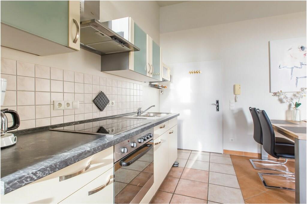 Großzügiger Wohn- Essbereich mit gemütlicher Couchlandschaft mit Schlaffunktion für 2 Personen ( 205 x 160 cm) und ein Sessel, TV-Sat (Flatscreen), Hi-Fi/ Musikanlage, DVD-Player, Gesellschaftsspiele und Bücher für gemütliche Abende, offene komplett ausgestattete Einbauküche mit 4-Plattenherd (Ceran) mit Esstisch, Backofen, Mikrowelle, Kühlschrank mit kleinem Gefrierfach und diversen Elektrogeräten, Badezimmer mit Fenster und Dusche/ WC, Haartrockner, Kosmetikspiegel 1 Schlafzimmer mit Doppelbett (2 Matratzen je 90cm x 200cm), Kleiderschrank und TV-Sat (Flatscreen), Herrendiener und Deckenventilator, Fahrradabstellmöglichkeit ist vorhanden