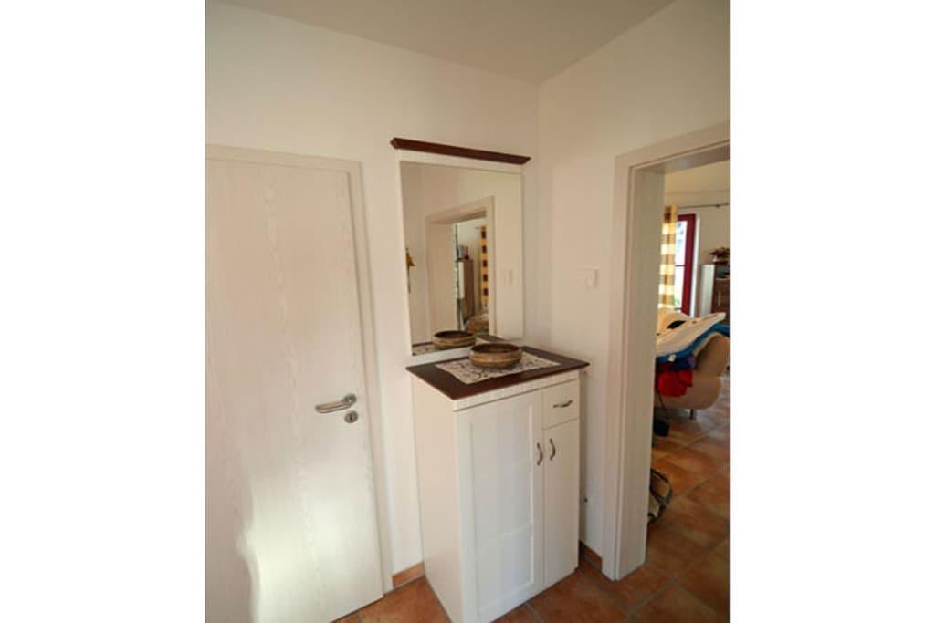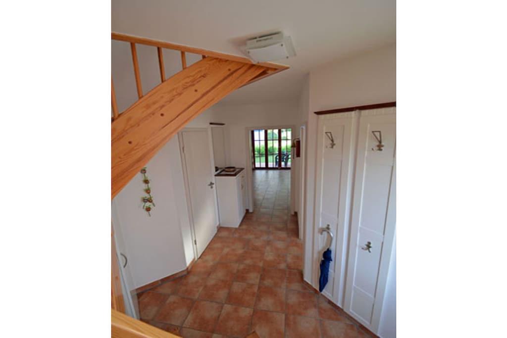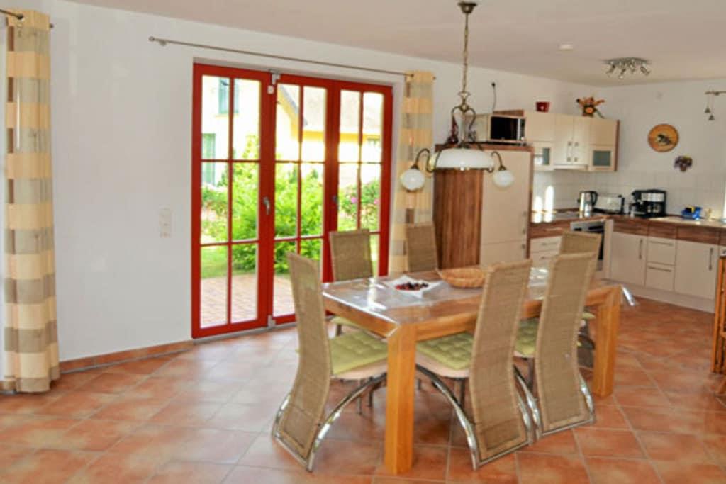 Erholungsort Glowe, über 2 Etagen mit Dachboden, ruhige Lage, ca. 250 m zum 8 km langen Sandstrand Schaabe, ca. 1 km zum Bodden Erdgeschoss: großzügiger Wohn- Essbereich mit Fußbodenheizung und Kamin, gemütliche Couchlandschaft, TV/ Sat (Flatscreen), DVD-Player, Radio/CD, Kinderhochstuhl, offene komplett ausgestattete Einbauküche mit 4- Plattenherd (Ceranfeld), Backofen, Kühlschrank mit großem Gefrierfach, Mikrowelle, Geschirrspüler und diversen Elektrogeräten, 1. Bad mit Dusche und WC, Obergeschoss: 1. Schlafzimmer mit Doppelbett (180x200) und Kleiderschrank, 2. Schlafzimmer mit zwei Einzelbetten, Kleiderschrank und TV, 3. Schlafraum im Dachboden (Steile Treppe, ungeeignet für Kleinkinder und Senioren) mit 2 Einzelbetten, Insektenschutzgitter in den Schlafräumen vorhanden, 2. Bad mit Badewanne, Dusche und WC, Terrasse mit Gartenmöbeln, Elektrogrill vorhanden Grundstück ca. 400qm, Nichtraucher, Waschmaschine und Trockner vorhanden, Internet (WLAN) vorhanden, Liegewiese, Fahrradabstellmöglichkeit (Gartenhaus), 2 PKW- Stellplätze am Haus, Kinderspielplatz, Einkaufsmöglichkeiten, Bäcker und Restaurant in unmittelbarer Nähe, optimale Rad- und Wandermöglichkeiten, Haustiere nach Absprache (Gebühr 7 Euro pro Nacht/ pro Haustier)