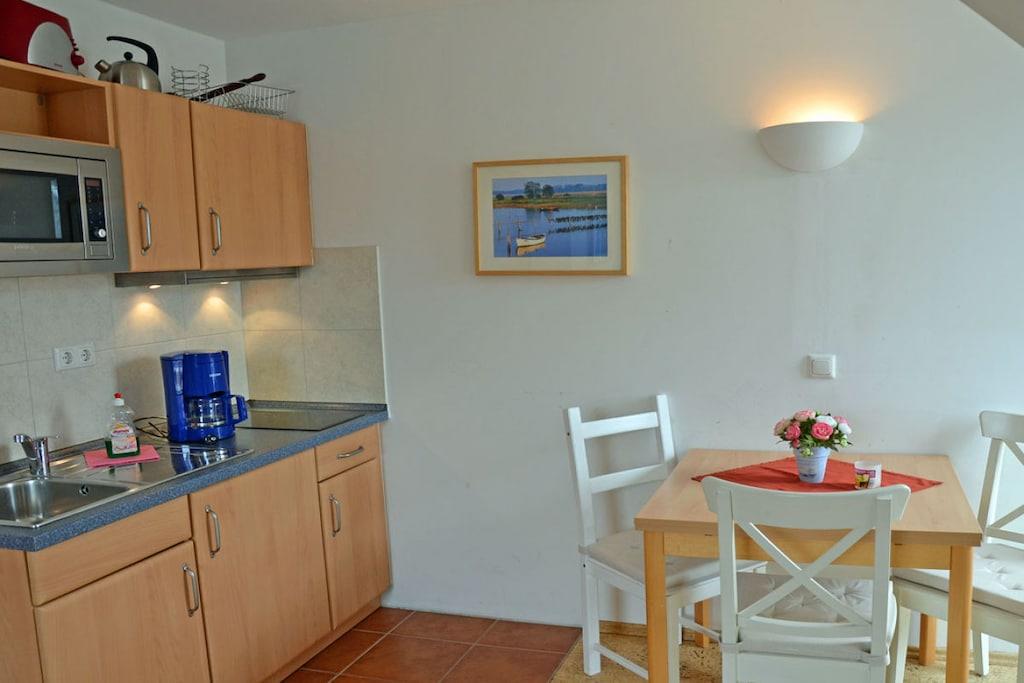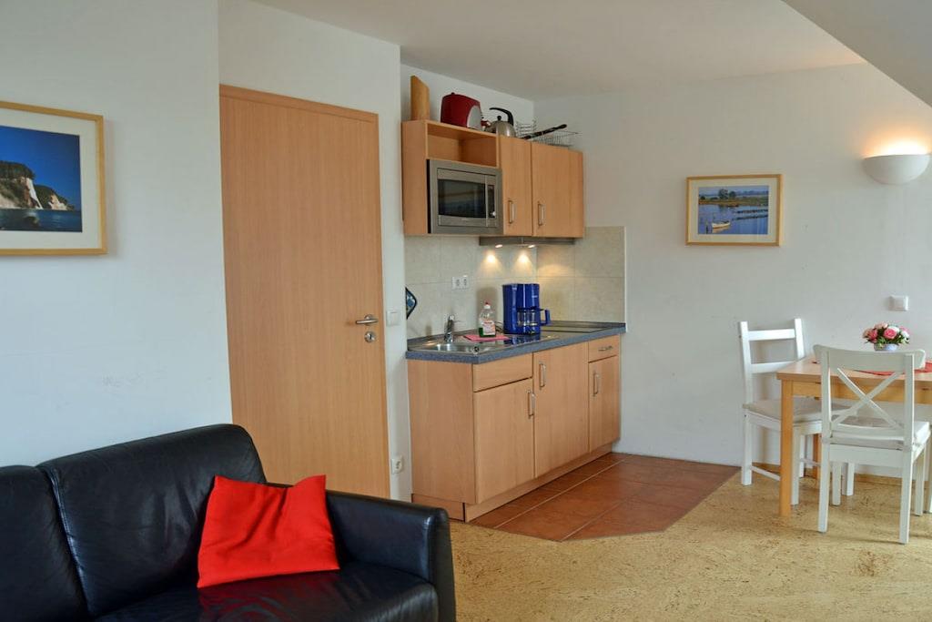Erholungsort Glowe, 1. Etage, sehr ruhige Lage, ca. 500 m zum Sandstrand (Ostsee), ca. 1 km zum Bodden Wohn- Essbereich mit Fußbodenheizung, Couch, TV/ Sat (Flatscreen), WLAN vorhanden, offene Küchenzeile mit 2- Plattenherd (Ceranfeld), Kühlschrank mit kleinem Gefrierfach, Mikrowelle und diversen Elektrogeräten, Schlafzimmer mit Doppelbett und Kleiderschrank, Bad mit Dusche und WC, gemeinschaftlich genutzter Wirtschaftsraum mit Waschmaschine, Wäschetrockner, große Gefriertruhe, Balkon mit Gartenmöbeln und Sonnenschirm (Balkontrennung durch Seitenmarkise zur Nebenwohnung) “Nur 8 Gehminuten zum Ostseesandstrand” Nichtraucherwohnung, Fußbodenheizung im gesamten Haus, Waschmaschine und Waschtrockner ohne Gebühr, Grundstück ca. 500 qm, 1 PKW- Stellplatz am Haus, Haustiere nicht erwünscht, diverse Einkaufsmöglichkeiten mit Bäcker und Restaurants im Ort vorhanden, optimale Rad- und Wandermöglichkeiten