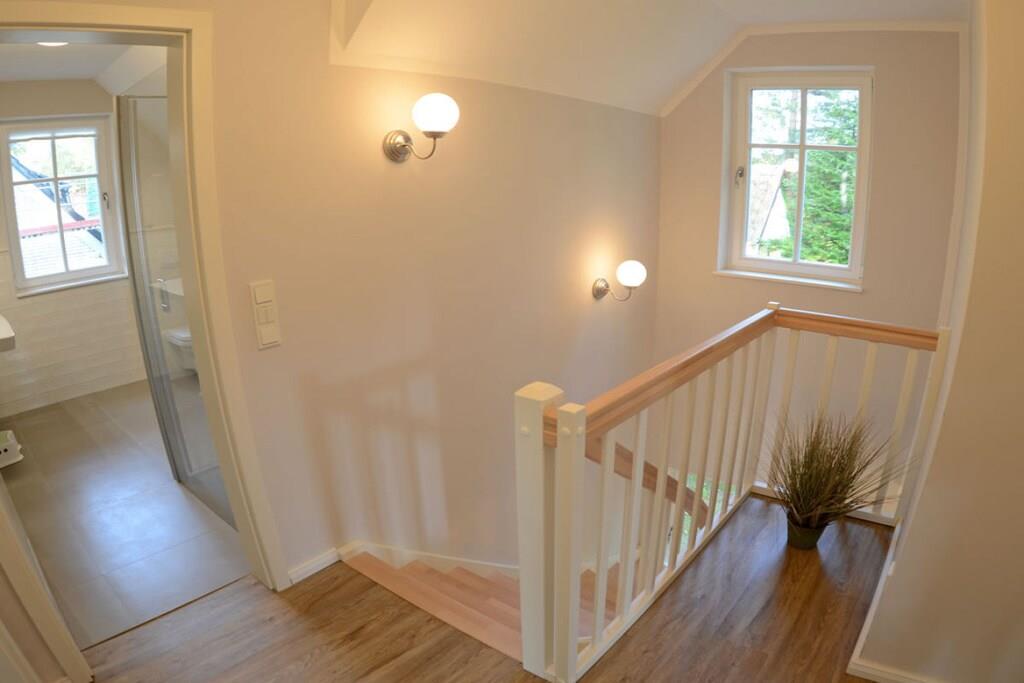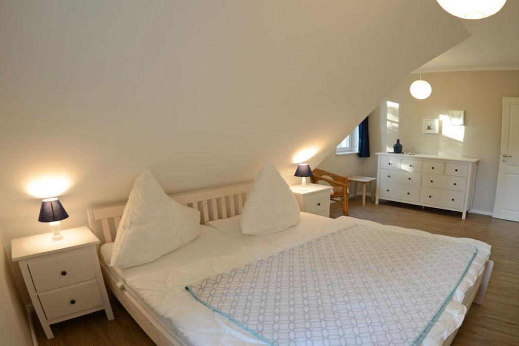 Liebevoll eingerichtetes Wohlfühlhaus auf naturbelassenem Grundstück Freuen Sie sich auf den großzügigen Wohnbereich mit gemütlicher Couchecke, TV/ Sat (Flatscreen),Radio, Kaminofen und einem kuscheligen Leseplatz, offene komplett ausgestattete Einbauküche mit großem Esstisch für 6 Personen, 4- Plattenherd (Ceranfeld), Backofen, Kühlschrank mit großem Gefrierfach, Geschirrspüler und diversen Elektrogeräten, Bad mit Dusche, WC und Sauna – um auch an kühleren Tagen den Urlaub rundum genießen zu können Im Obergeschoss haben wir für Sie drei Schlafzimmer eingerichtet – alle im nordischen Stil und doch jedes ein bisschen anders… Eines der Zimmer wird besonders die Kinder ansprechen: mit Bullaugenschrank, Legosteinen und Holzeisenbahn, 1. & 2. Schlafzimmer mit je einem Doppelbett (180×200 cm) und Kleiderschrank, 3. Schlafzimmer mit einem Einzelbett ausziehbar auf 160 x 200 cm mit Kleiderschrank, Bad mit Dusche und WC Außenbereich: auf der Holzterrasse finden 6 Personen Platz, Gartenmöbel (6 Gartenstühle), Grill vorhanden Besonderes: teilweise umzäuntes Grundstück ca. 627 qm groß, 2 PKW-Stellplätze am Haus, Nichtraucher, Internet (WLAN) vorhanden,, Insektenschutzgitter an den Fenstern und der Terrassentür, Waschmaschine (ohne Gebühr), Abstellmöglichkeit für Fahrräder im Gartenhaus Großer Spielplatz und ein Beachplatz zum Volley- und Fußball spielen, Einkaufsmöglichkeiten, Bäcker und Restaurant in unmittelbarer Nähe, optimale Rad- und Wandermöglichkeiten, Haustiere nicht erwünscht