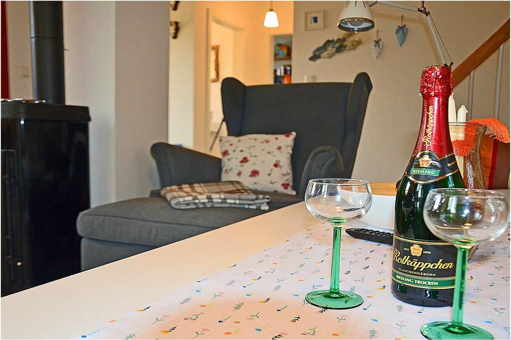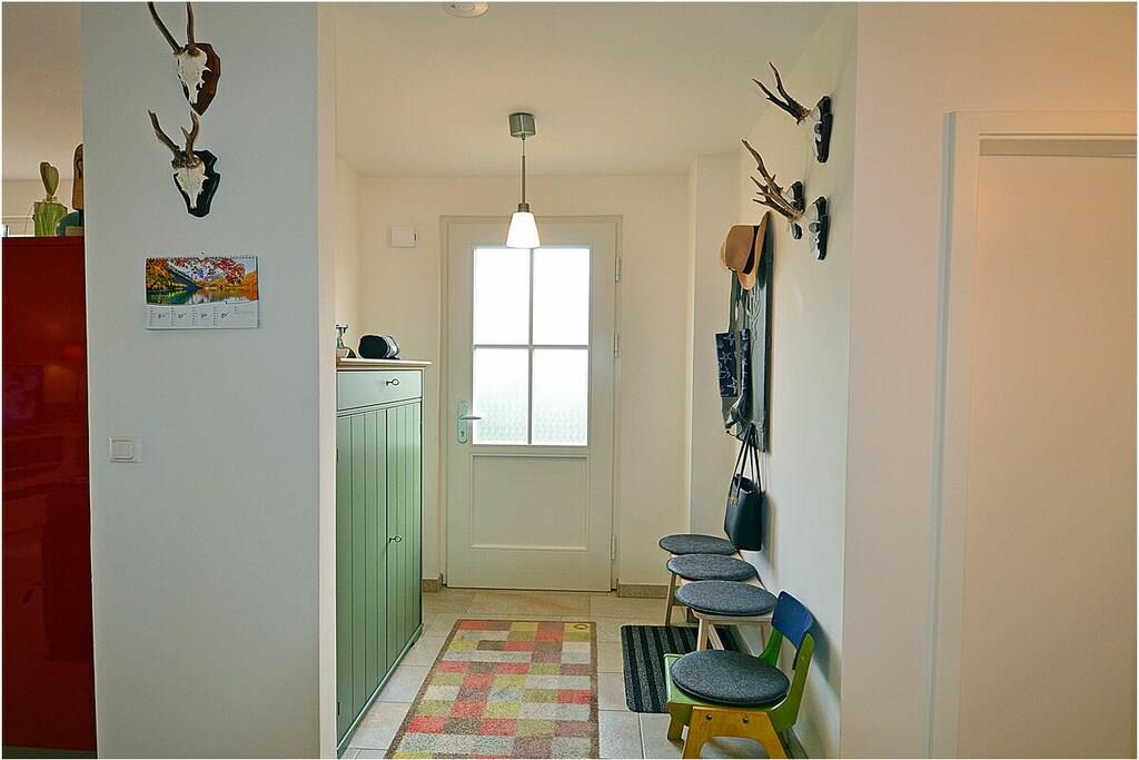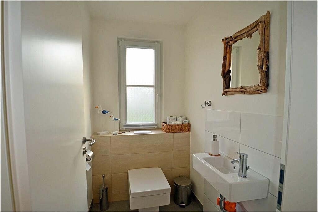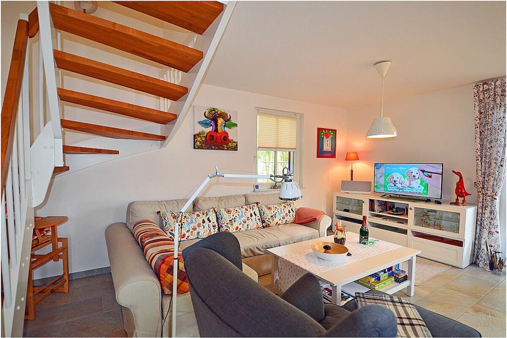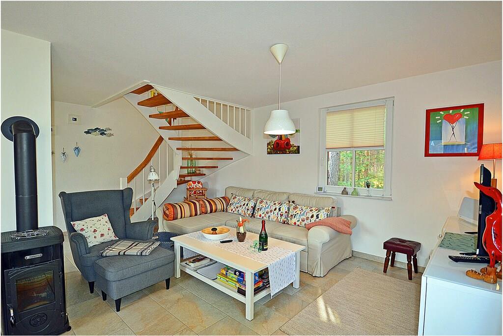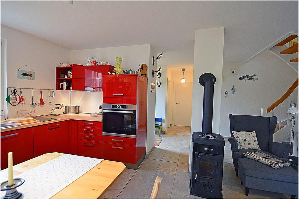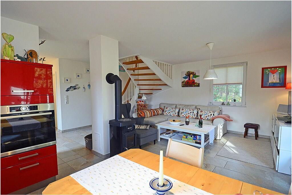 Erdgeschoss: großzügiger Wohn- Essbereich mit gemütlicher Couchlandschaft, Kaminofen, TV/ Sat (Flatscreen), Radio, Gesellschaftsspiele, DVDs` und Bücher für gemütliche Abende, offene komplett ausgestattete Einbauküche mit 2- Plattenherd (Induktion), Backofen, Kühlschrank mit großem Dreier-Gefrierfach, Geschirrspüler und diversen Elektrogeräten, Saunabereich mit ebenerdiger Dusche, separates Gäste-WC, Wirtschaftsraum mit Waschmaschine, Staubsauger und Wäscheständer Obergeschoss: 1. Schlafzimmer mit Doppelbett (2 Matratzen je 90×200), Sideboard und Kleiderschrank, 2. Schlafzimmer mit 2 Einzelbetten (ausziehbar 180×200) und Kleiderschrank, großes Bad mit ebenerdiger modernen Dusche, Treppenschutzgitter oben und Kinderhochstuhl vorhanden, Außenbereich: Terrasse mit Gartenmöbeln (4 Gartenstühle und 2 Liegestühle), Sonnenschirm, Tischgrill mit Beistelltisch, 2 PKW Stellplätze direkt am Objekt, überdachte verschließbare Fahrradabstellmöglichkeit (Gartenhaus) vorhanden, Schaukel für die Kleinen