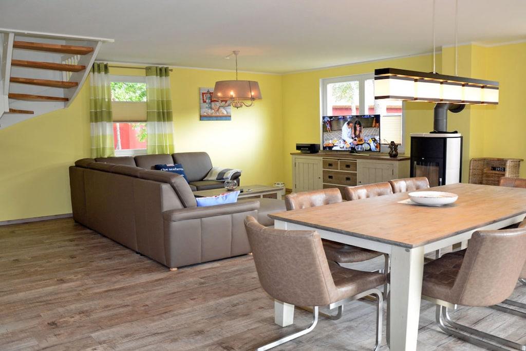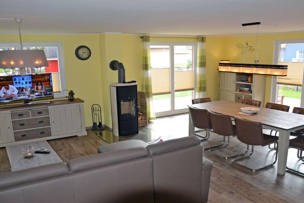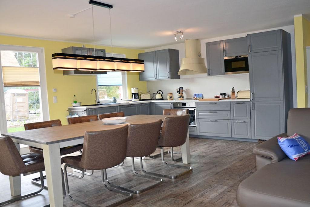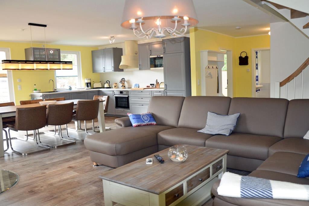 Erholungsort Glowe, über 2 Etagen, zentrale Lage, ca. 300 m zum Sandstrand (Ostsee), ca. 1 km zum Bodden Erdgeschoss: großzügiger Wohn- Essbereich mit Fußbodenheizung und Kamin, gemütliche Couchlandschaft, TV/ Sat (Flatscreen),DVD-Player, Radio/ CD, offene komplett ausgestattete moderne Einbauküche mit 4- Plattenherd/ Induktion (Ceranfeld), Backofen, Kühlschrank mit großem Gefrierfach, Mikrowelle, Geschirrspüler und diversen Elektrogeräten, Sauna mit Dusche, separates Gäste WC, Wirtschaftsraum mit Waschmaschine und Trockner, Bügeleisen Obergeschoss: 1. & 2. & 3 Schlafzimmer mit je einem Doppelbett und Kleiderschrank, 4 Schlafzimmer mit je 2 Einzelbetten und Kleiderschrank, alle Schlafzimmer sind mit einem TV (Flatscreen) ausgestattet, großes Bad mit Dusche, Badewanne und WC, Terrasse mit 6 Gartenstühle und 4 Liegestühle, Sonnenschirm, Grill vorhanden Erstvermietung November 2016 - “ein perfekter Urlaubstraum im Reethaus-Dünenwald” Reetdachgedecktes Haus, Nichtraucher, Internet (WLAN) vorhanden, Fußbodenheizung im ganzen Haus, Sauna, komplett umzäuntes Grundstück ca. 650 qm groß, Waschmaschine und Trockner ohne Gebühr, Liegewiese, Wäscheständer, Fahrradabstellmöglichkeiten vorhanden, 2 PKW- Stellplätze am Haus, Einkaufsmarkt, Bäcker und Restaurant in unmittelbarer Nähe, optimale Rad- und Wandermöglichkeiten, Haustiere nach Absprache (Gebühr 5 Euro pro Nacht/ pro Haustier)