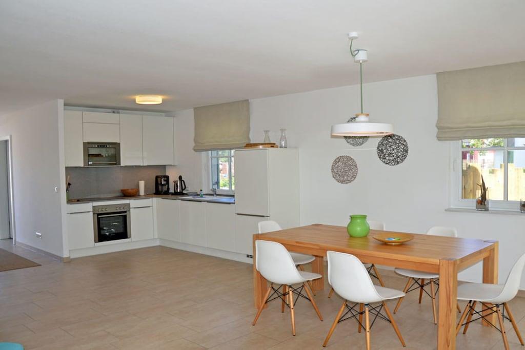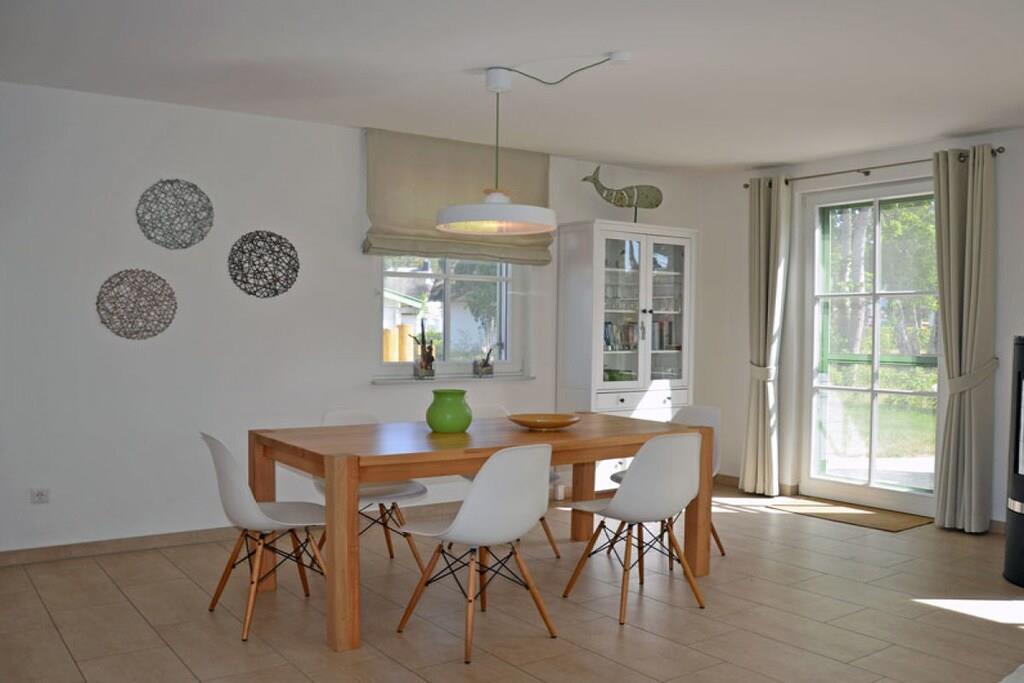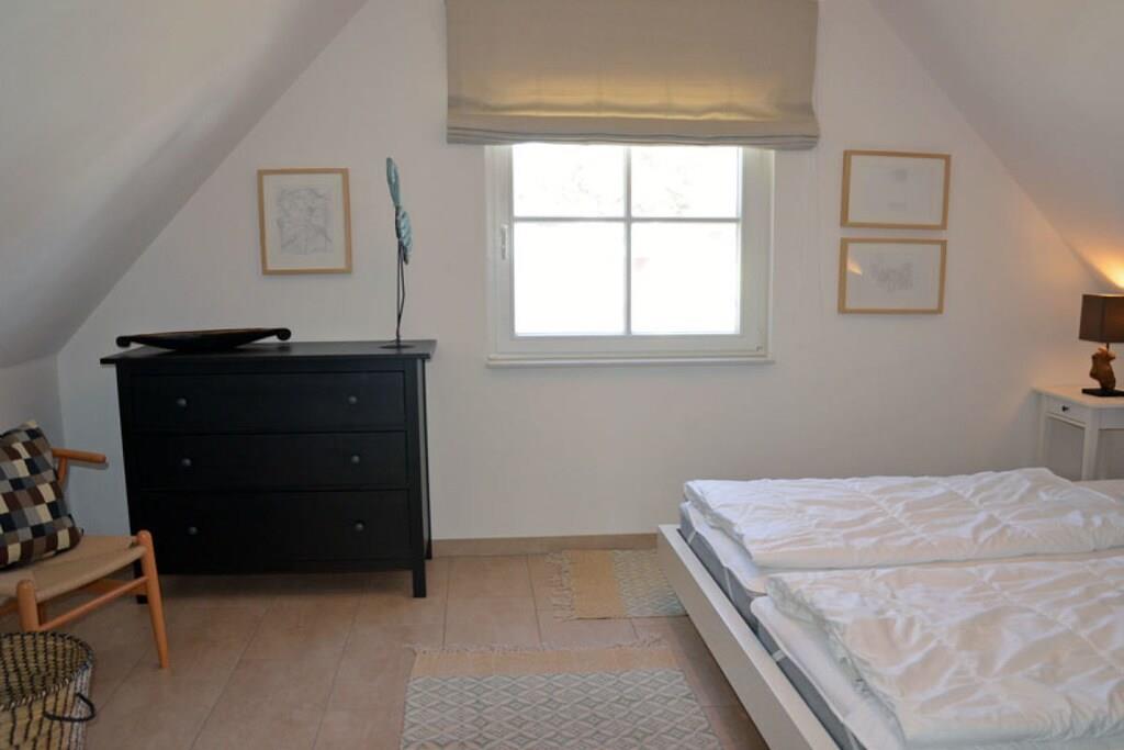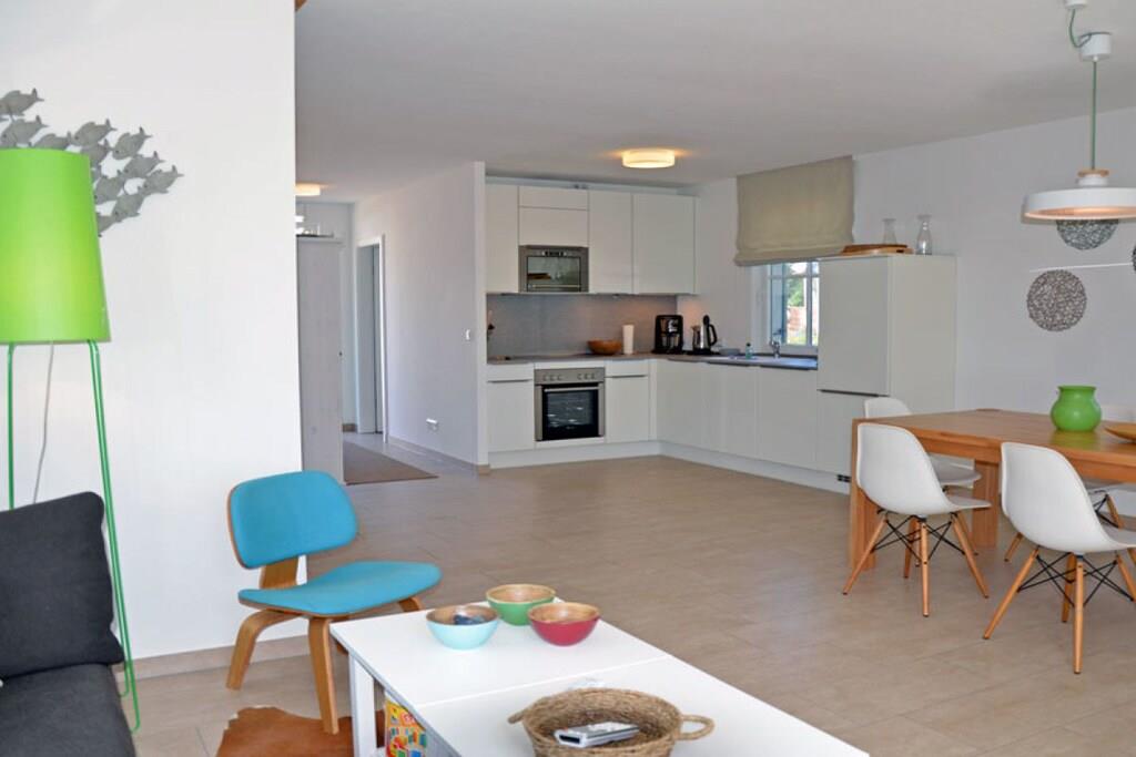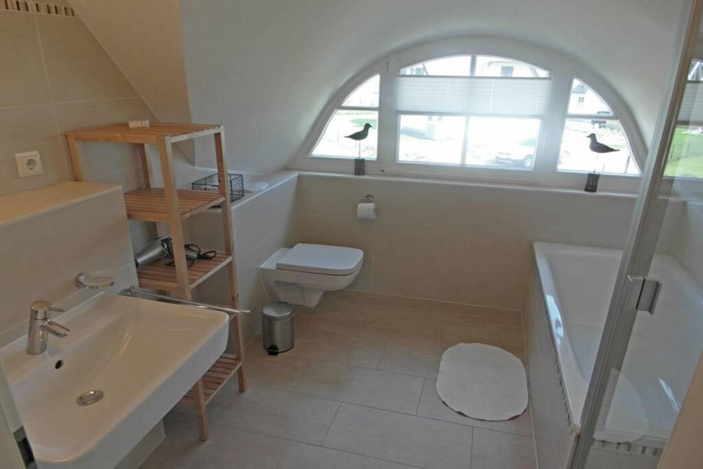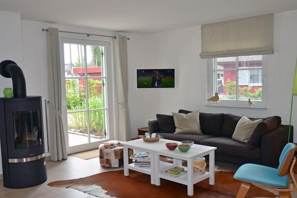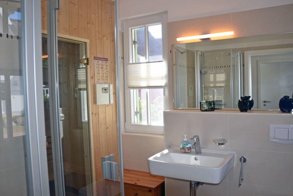 Erholungsort Glowe, über 2 Etagen, ruhige Lage, ca. 300 m zum 8 km langen Sandstrand Schaabe, ca. 1 km zum Bodden Erdgeschoss: sonnendurchfluteter Wohnraum mit Fußbodenheizung, gemütlicher Sitzecke und Kaminofen, offene Küche und großer Esstisch mit Sitzgelegenheiten für 6 Personen, Sauna Bad mit WC und Dusche, Hauswirtschaftsraum, Flur und große Terrasse mit abgegrenztem Garten. Ausstattung: Küchenzeile: Geschirrspüler, 4 Platten Ceranherd mit Backofen, Kühl- und Gefrierschrank, Mikrowelle, Espressomaschine, Wasserkocher, Toaster und Kaffeemaschine Technik: 1x Flat TV Sat, DVD Player/ Blue Ray, HiFi Anlage mit Air Play, CD Radio, Internet/WLAN, Waschmaschine, 2x Föhn Obergeschoss: 2 geräumige Schlafzimmer für bis zu 4 Erwachsene. In jedem Schlafzimmer besteht die Möglichkeit ein Kinderreisebett aufzustellen. 1 Schlafzimmer mit Doppelbett (180x200), zweites Schlafzimmer mit 2 Einzelbetten (90x200), die auch als Doppelbett gestellt werden können. Hochwertiges Bad mit Badewanne und Dusche Kindgerecht:Kinderreisebett mit Matratze sowie 2 Tripp Trapp im Haus vorhanden, Babyphone vorhanden, Bollerwagen vorhanden, Kinderschutz-Treppengitter vorhanden, alle Steckdosen sind gesichert, Pürierstab, Kinderbesteck und Teller, Kinderspielzeug und Bücher Sonstiges: Gartenmöbel, hochwertiger Elektrogrill (Weber) vorhanden, Insektenschutz, Gartenhaus, Windschutz, Strandmuschel und 2 PKW Stellplätze am Haus, diverse Gesellschaftsspiele im Haus Einrichtung: hochwertige, skandinavisch designorientierte und liebevolle Einrichtung und familiengerechte Ausstattung