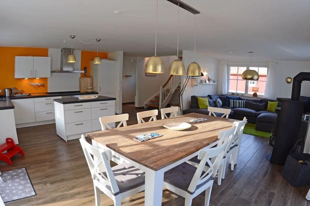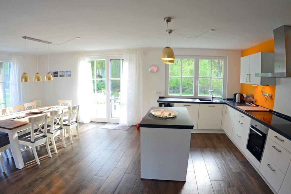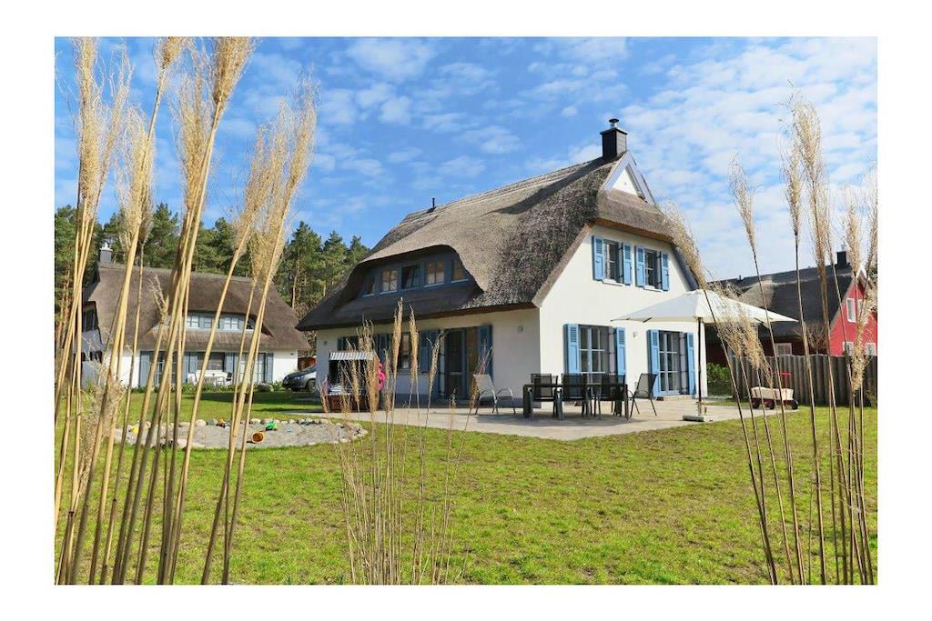 Erholungsort Glowe, über 2 Etagen, sehr ruhige Lage, direkter Zugang zum Kieferwald, ca. 500 m zum Sandstrand (Ostsee), ca. 800 m zum Bodden Erdgeschoss: großzügiger Wohn-Essbereich mit Kamin, gemütlicher Couchlandschaft, Internet-TV (Flatscreen), Musikanlage/CD-Player, DVD-Player, Blu-ray Player, Gesellschaftsspiele und Bücher für Groß und Klein, offene komplett ausgestattete hochwertige Einbauküche mit Granitplatte und Kochinsel, Kaffee-und Nespressomaschine, 4-Plattenherd (Ceranfeld), Backofen, Kühlschrank mit großem Gefrierfach, Geschirrspüler, Waffeleisen und diversen Elektrogeräten, Sauna-Bad mit ebenerdiger Dusche, separates WC, Hauswirtschaftsraum mit Waschmaschine und Trockner Obergeschoss: 1., 2. und 3. Schlafzimmer mit je einem Doppelbett (180×200) und Kleiderschrank, 4. Schlafzimmer mit 2 Einzelbetten (90×200) und Kleiderschrank (in einem Schlafzimmer ist Internet-TV (Flatscreen) vorhanden), großes Bad mit Badewanne und Regendusche, Fön ist vorhanden Außenbereich: die Terrassen des Hauses sind nach Süden und Westen angelegt, gemütliche Gartenmöbel (8 Gartenstühle und 4 Liegestühle) und ein großer Gartentisch, ein Strandkorb lädt zum Relaxen ein, Sonnenschirm sowie Grill vorhanden Willkommen im Reetdachhaus Dünenrose und fühlen Sie sich wohl - wie zu Hause- großes, komplett umzäuntes Grundstück ca. 740 m², direkter Zugang zum Waldwanderweg, Internet (WLAN) vorhanden, kinderfreundlich eingerichtet, für die Kleinen gibt es einen eigenen Sandspielplatz, Bollerwagen, Kinderhochstuhl und Kinderreisebett vorhanden, Nichtraucher, Allergiker geeignet, Fußbodenheizung im gesamten Haus, Waschmaschine und Trockner ohne Gebühr, Wäscheständer, Tritthocker für Bad und Küche vorhanden, Insektenschutz und Rollläden/ Plissees, Abstellmöglichkeit für Fahrräder im Gartenhaus, Bollerwagen, 2 PKW-Stellplätze direkt am Haus, Einkaufsmöglichkeiten, Bäcker und Restaurant in unmittelbarer Nähe, optimale Rad- und Wandermöglichkeiten, Haustiere nach Absprache (Gebühr 5 Euro pro Nacht/ pro Haustier)