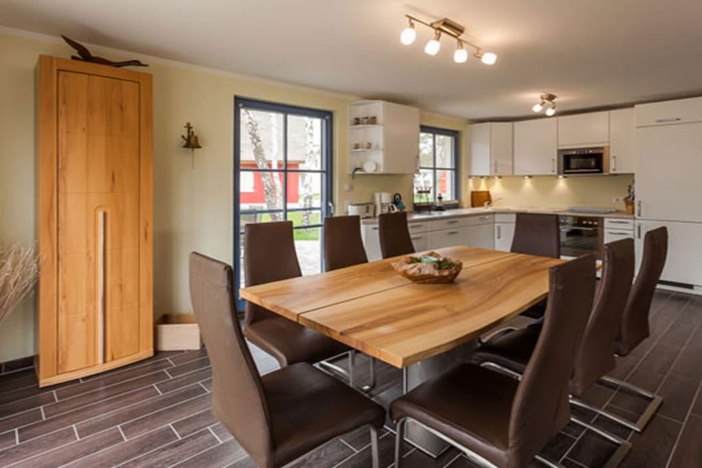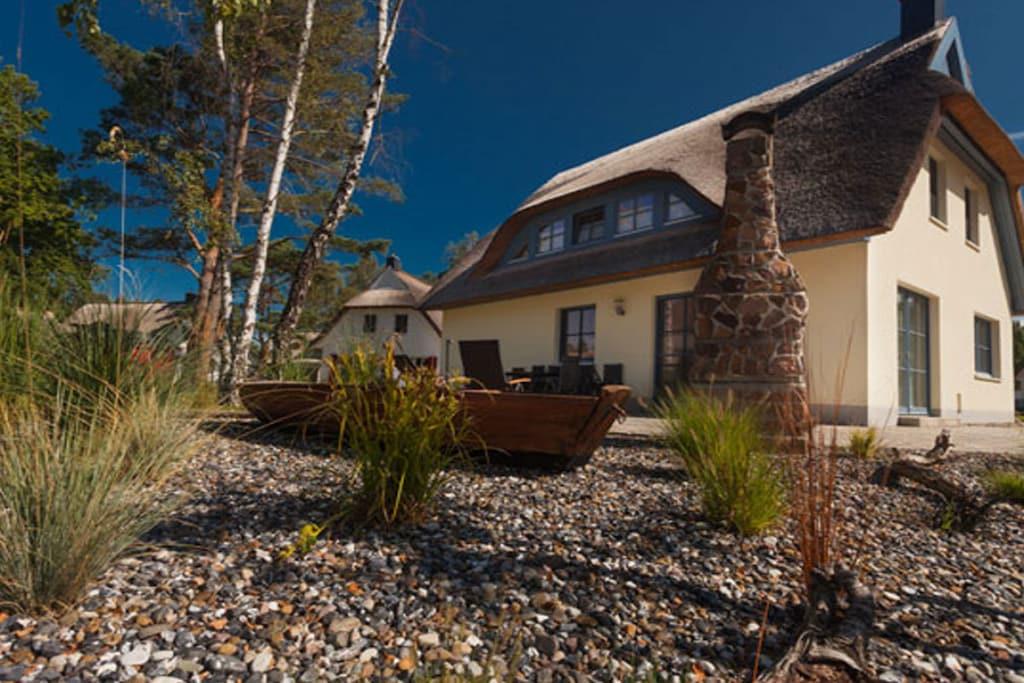 Erholungsort Glowe, über 2 Etagen, ruhige Lage, ca. 400 m zum Sandstrand (Ostsee), ca. 1 km zum Bodden Erdgeschoss: großzügiger Wohn- Essbereich mit Fußbodenheizung und Kamin, gemütliche Couchlandschaft, TV/ Sat (Flatscreen), Radio/CD, offene komplett ausgestattete Einbauküche mit 4- Plattenherd (Ceranfeld), Backofen, Kühlschrank mit Gefrierfach, Mikrowelle, Geschirrspüler und diversen Elektrogeräten, Saunabereich mit Dusche, Gäste-WC, Wirtschaftsraum mit Waschmaschine und Trockner Obergeschoss: 1. & 2. Schlafzimmer mit je einem Doppelbett und großem Kleiderschrank, 3. & 4. Schlafzimmer mit je 2 Einzelbetten und großem Kleiderschrank, Bad mit Badewanne, Dusche, WC und Doppelwaschtisch, Terrasse mit Gartenmöbeln, Grillmöglichkeit besteht “ein perfekter Urlaubstraum im Reethaus-Dünenwald” Reetdachgedecktes Haus, Grundstück ca. 650 qm mit Gartenhaus, Internet (WLAN) kostenfrei vorhanden, Waschmaschine und Trockner ohne Gebühr, Bügeleisen und Bügelbrett vorhanden, Insektenschutzgitter an den Fenstern und der Terrassentür, Liegewiese, 3 PKW- Stellplätze am Haus, Haustiere nicht erwünscht