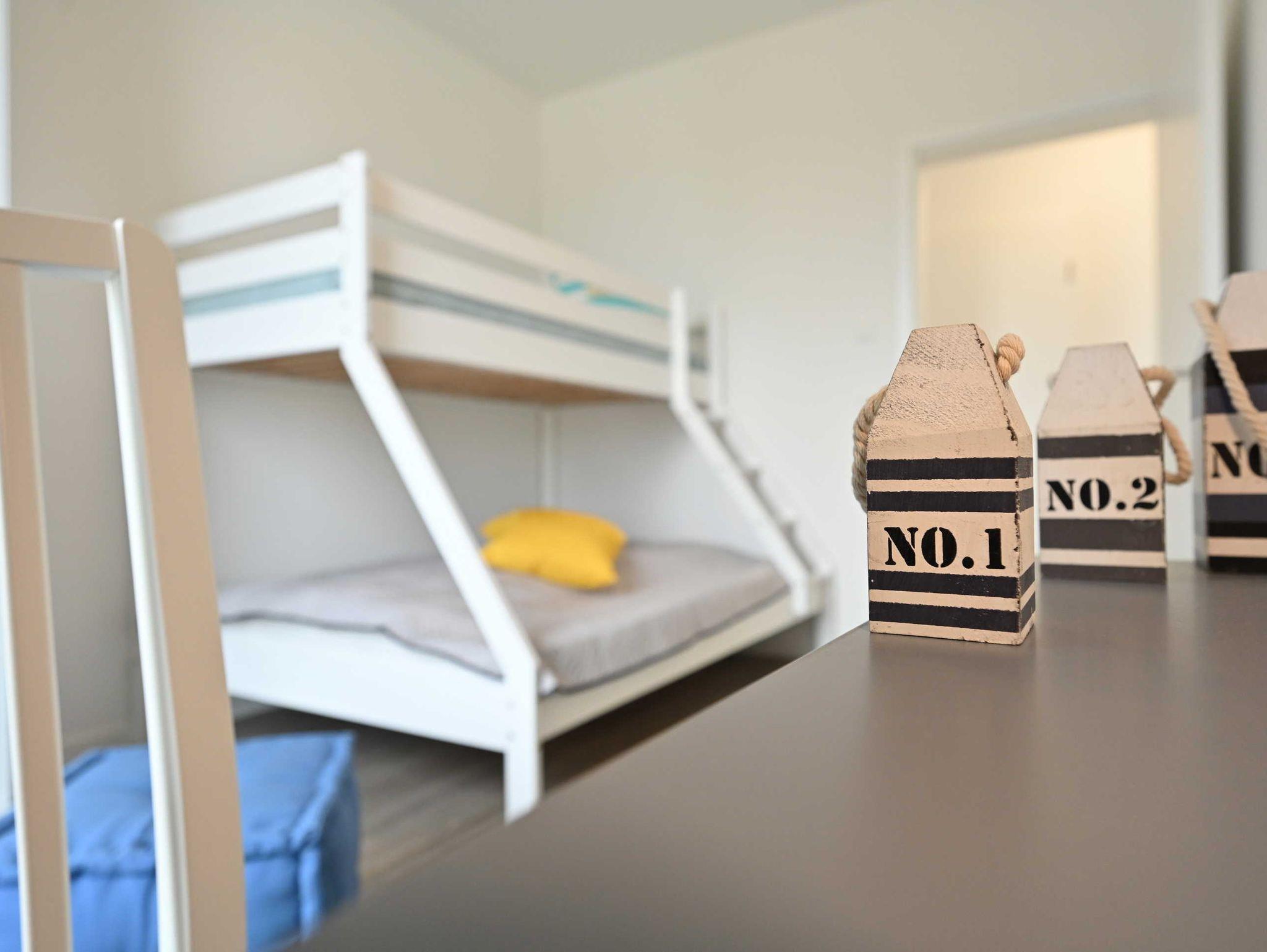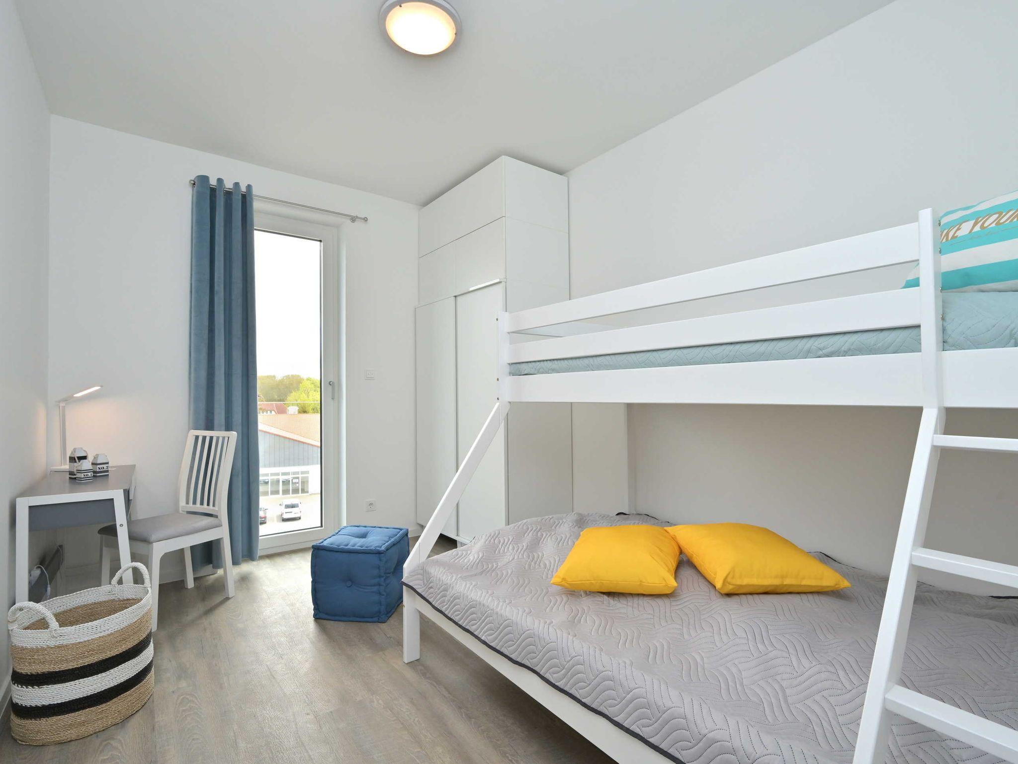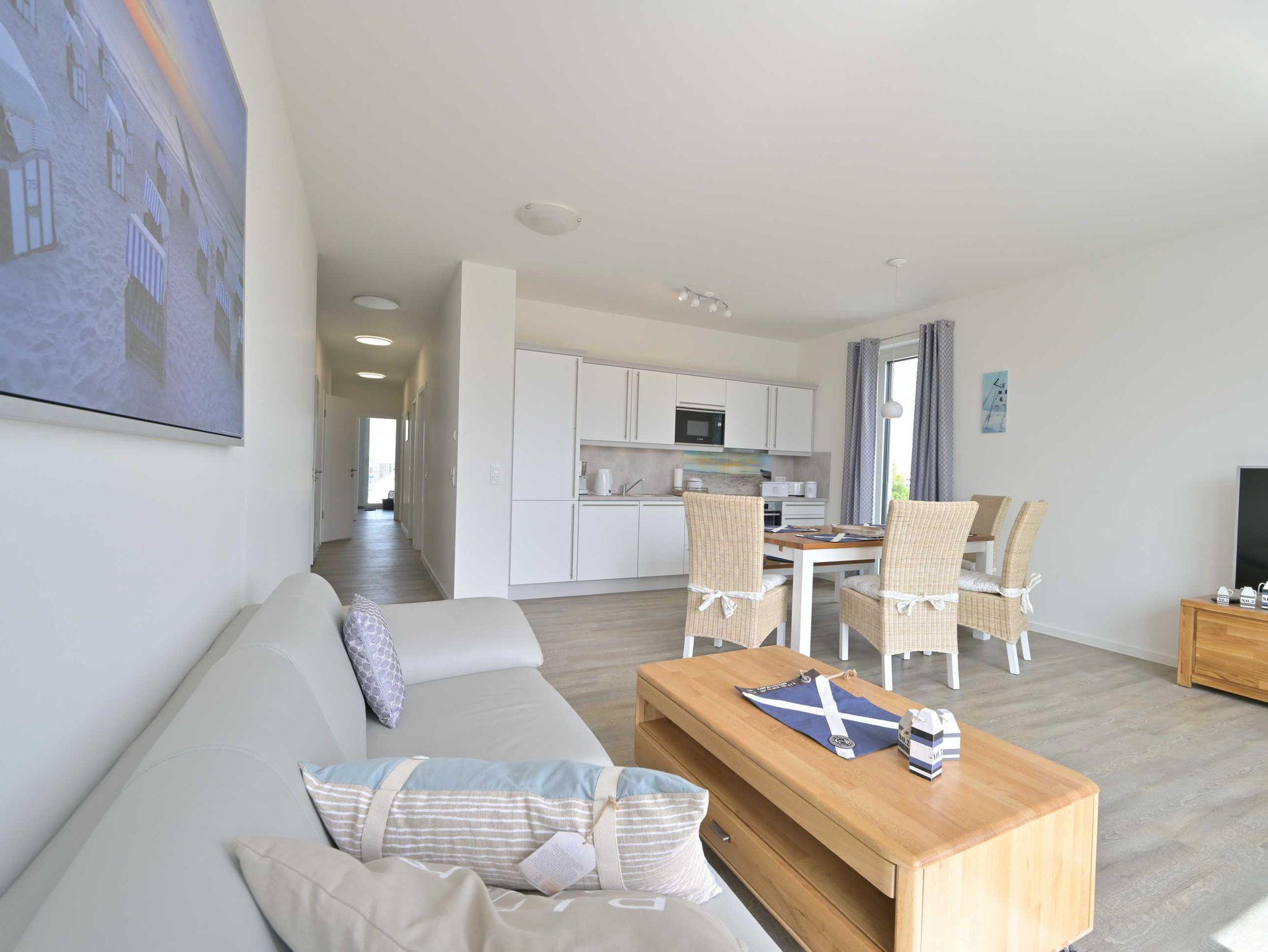 Die Ferienwohnung ArkonaPanorama im Haus Seezeichen in Glowe bietet 3 geräumige Schlafzimmer mit insgesamt 7 Schlafplätzen, einen großzügigen Wohnbereich mit integrierter Küche und angrenzendem Balkon sowie zwei Bäder mit ebenerdigen Duschen.