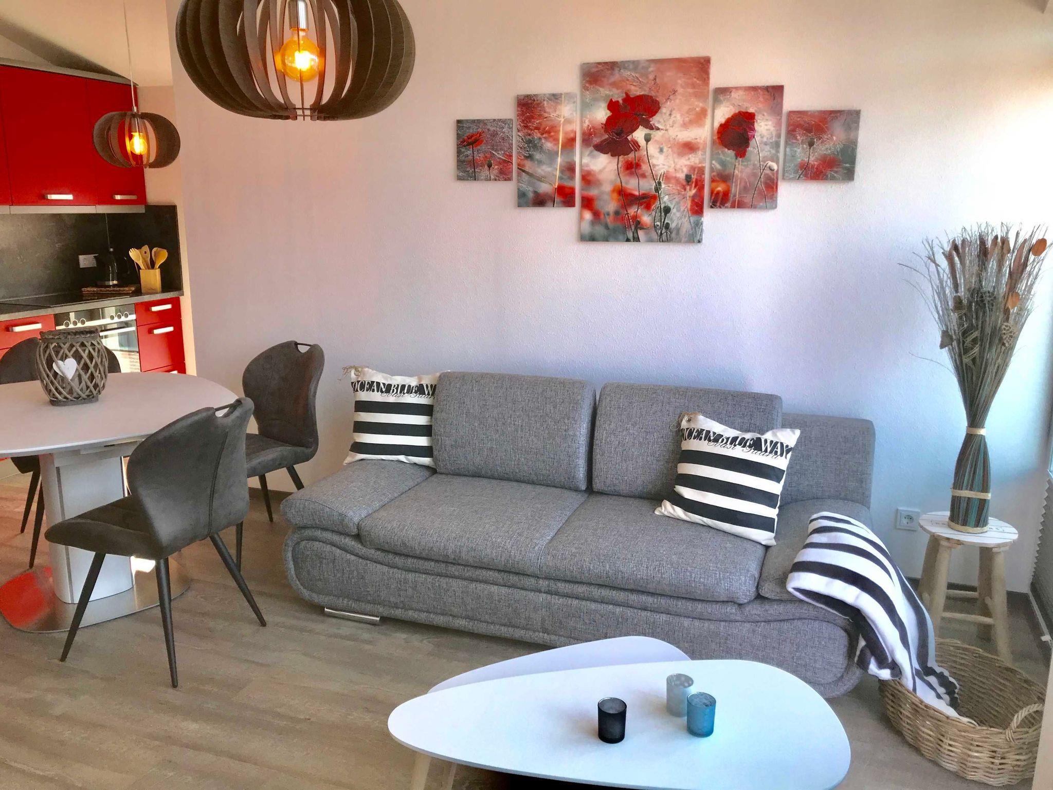 Die Wohnung bietet auf 50qm einen gemütlichen Wohnraum mit Schlafcouch (150x200cm) und eingebundener Küche, einen Schlafraum mit Doppelbett und ein Bad mit Dusche. Der Balkon ist aus dem Wohnbereich begehbar.