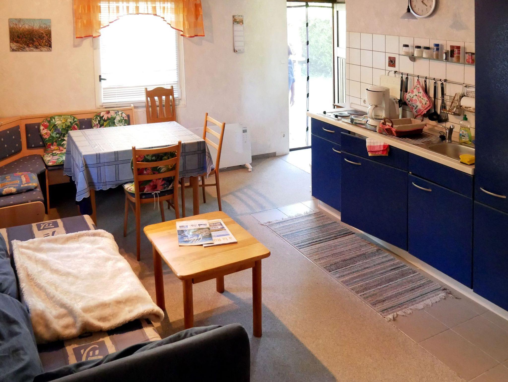 Sitzecke | Couch | TV | offene Küche mit zwei E-Herd-Platten, Kühlschrank, Kaffeemaschine und Toaster