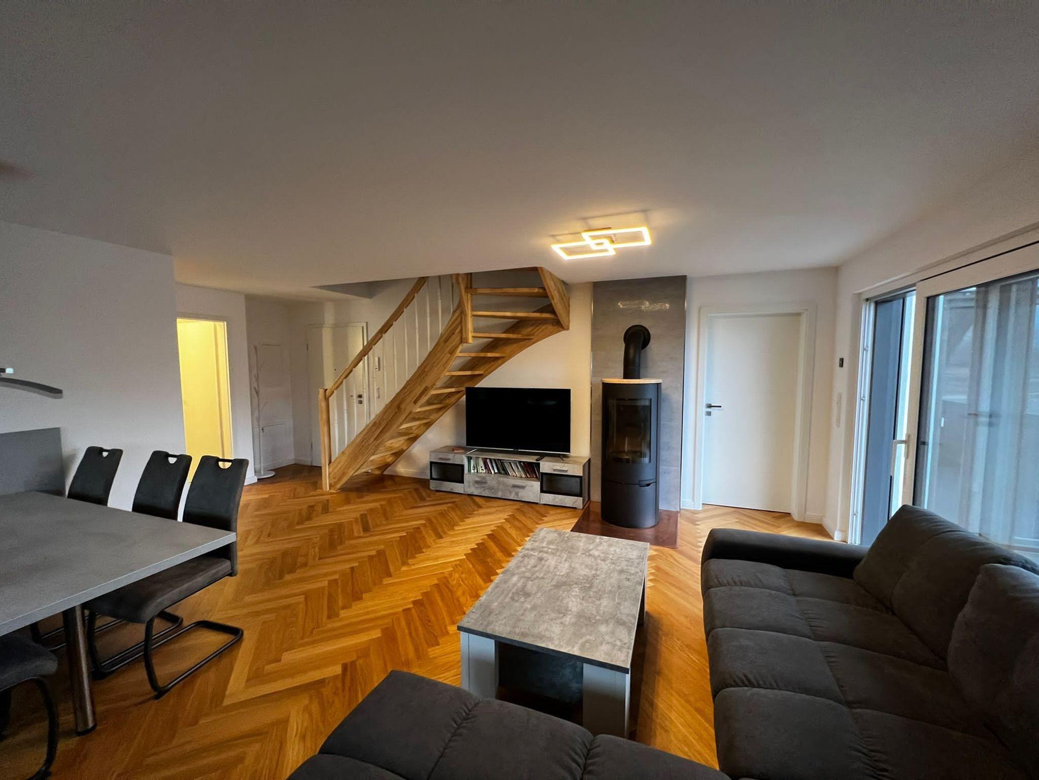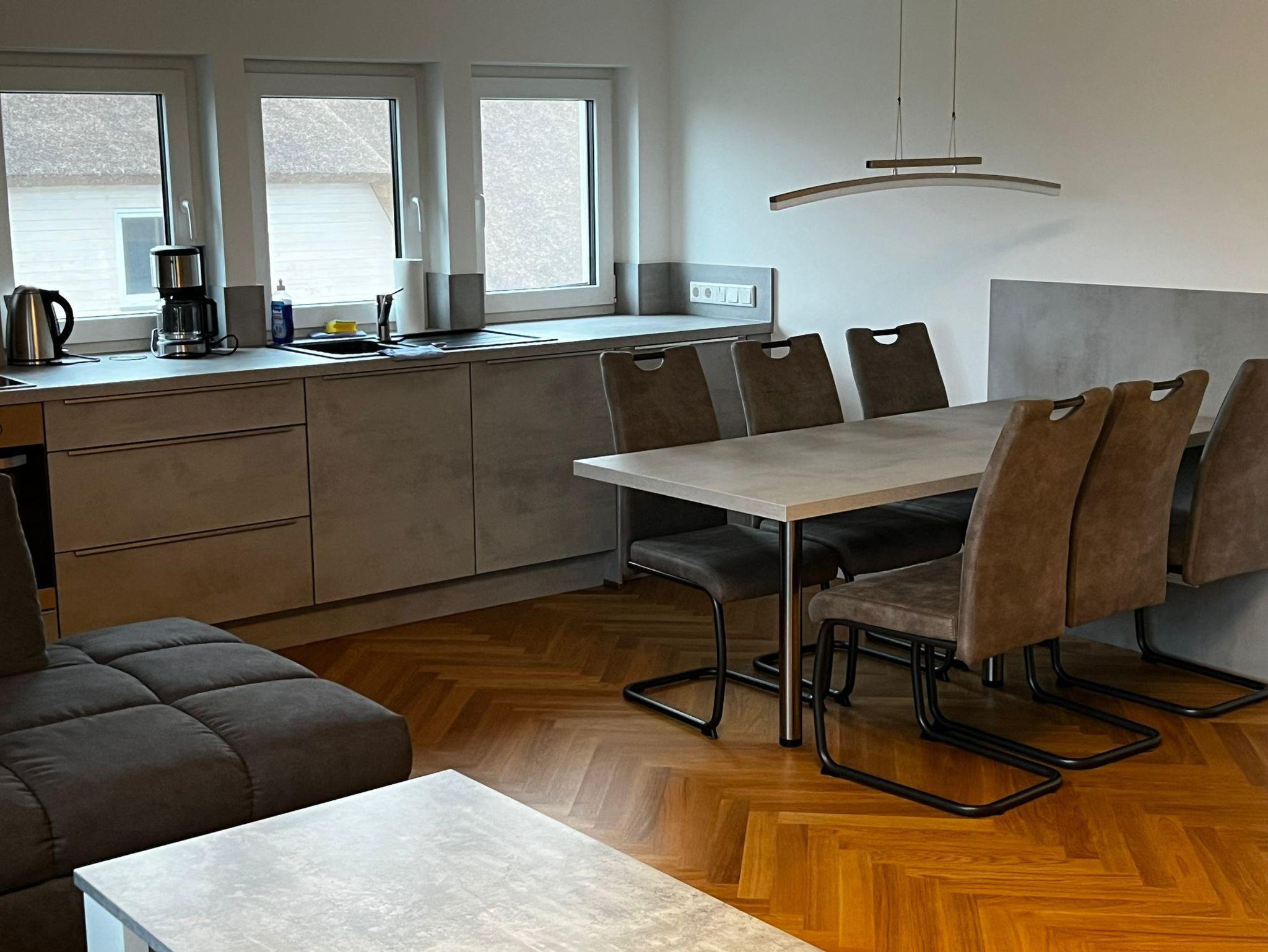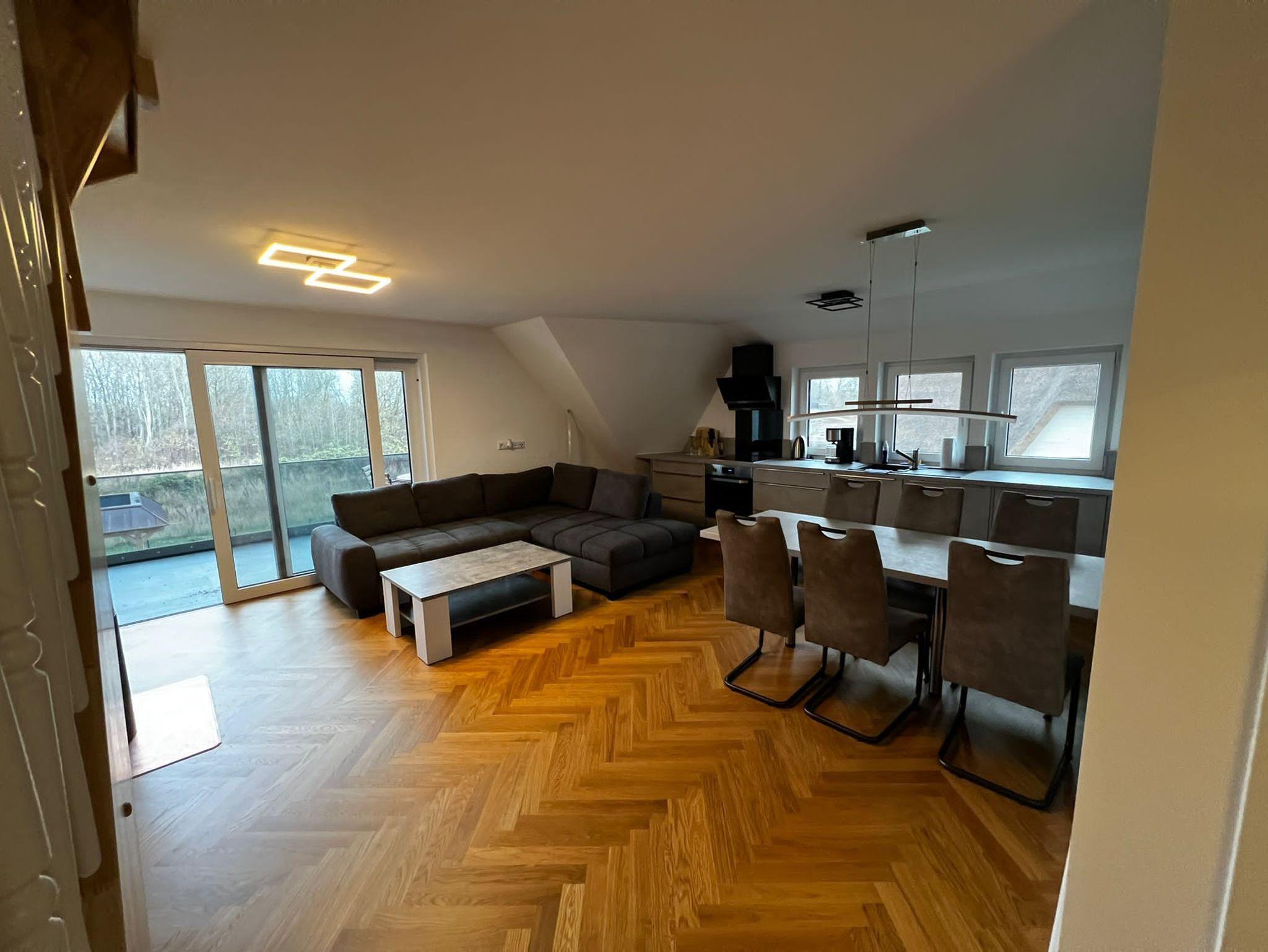 Das Wohnzimmer hat neben einer bequemen Couch und einem Tisch, eine offene Küche die modern und komplett ausgestattet mit einem Esstisch und Stühlen ist.
