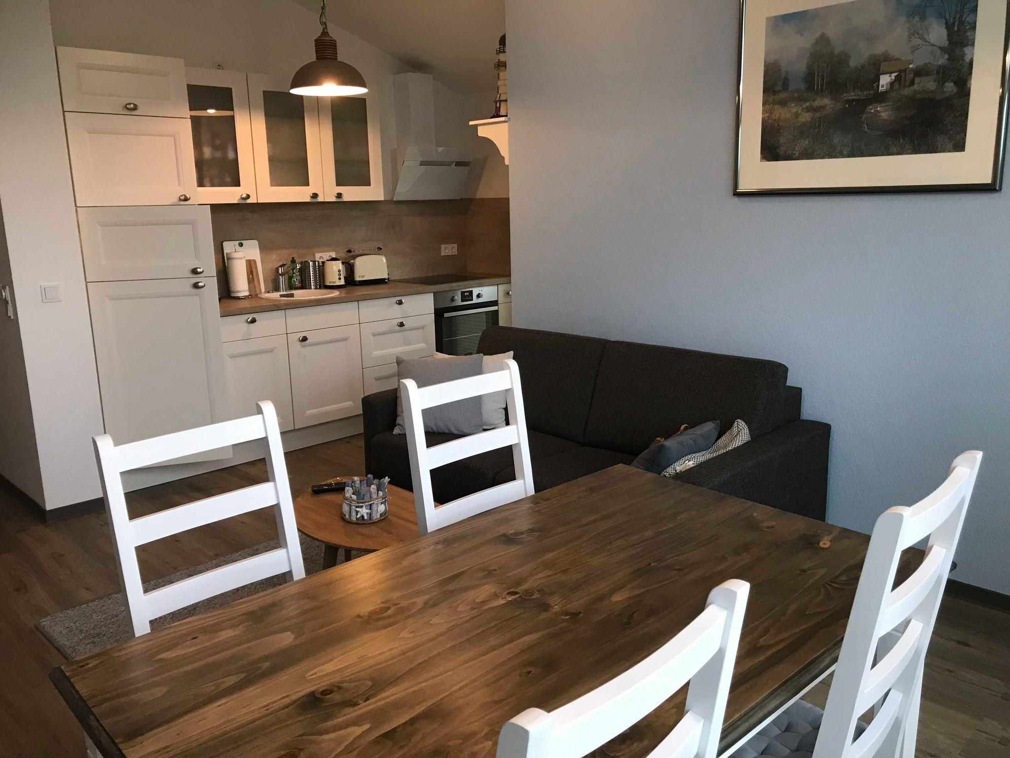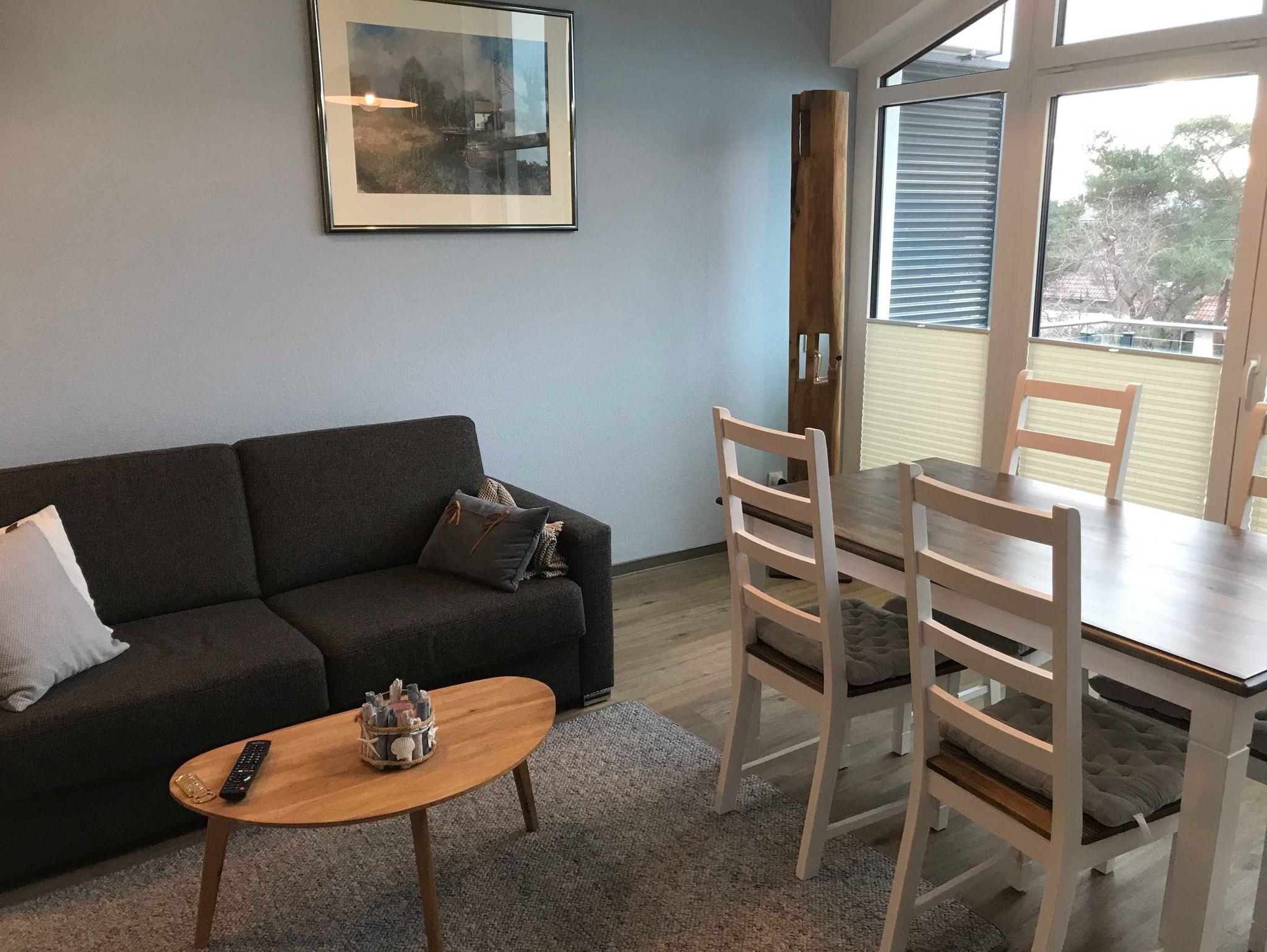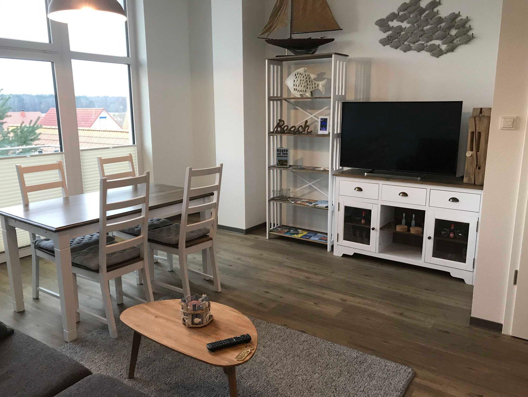 Die Wohnung bietet auf 50qm einen gemütlichen Wohnraum mit integrierter Küche, einen Schlafraum mit Doppelbett und ein Bad mit Dusche. Der Balkon ist aus dem Wohnbereich begehbar. Er bietet einen weiten Blick bis zum Großen Jasmunder Bodden.