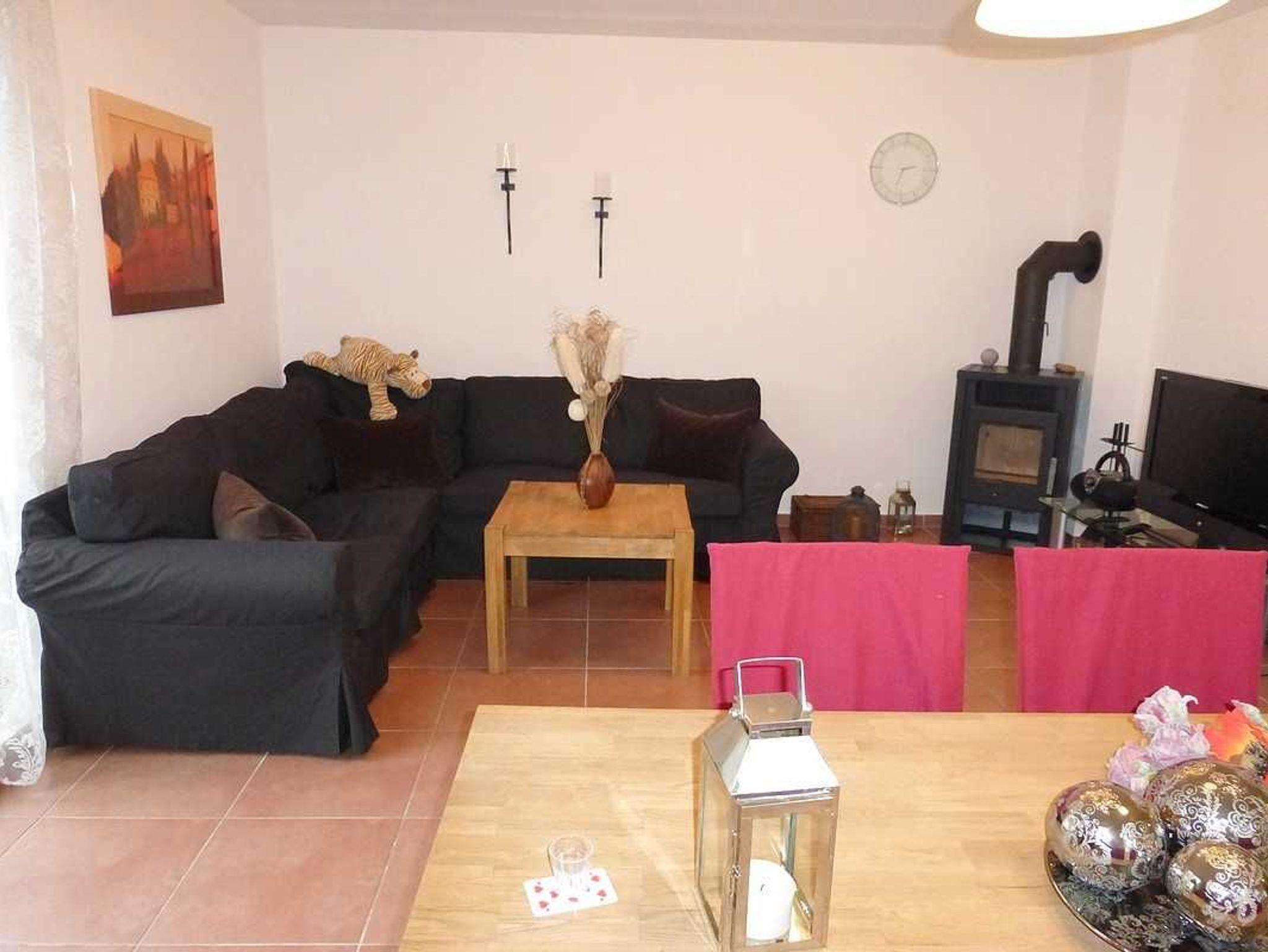 - Wohnzimmer mit großer Couch, Flachbild-TV, Kaminofen, Eßtisch