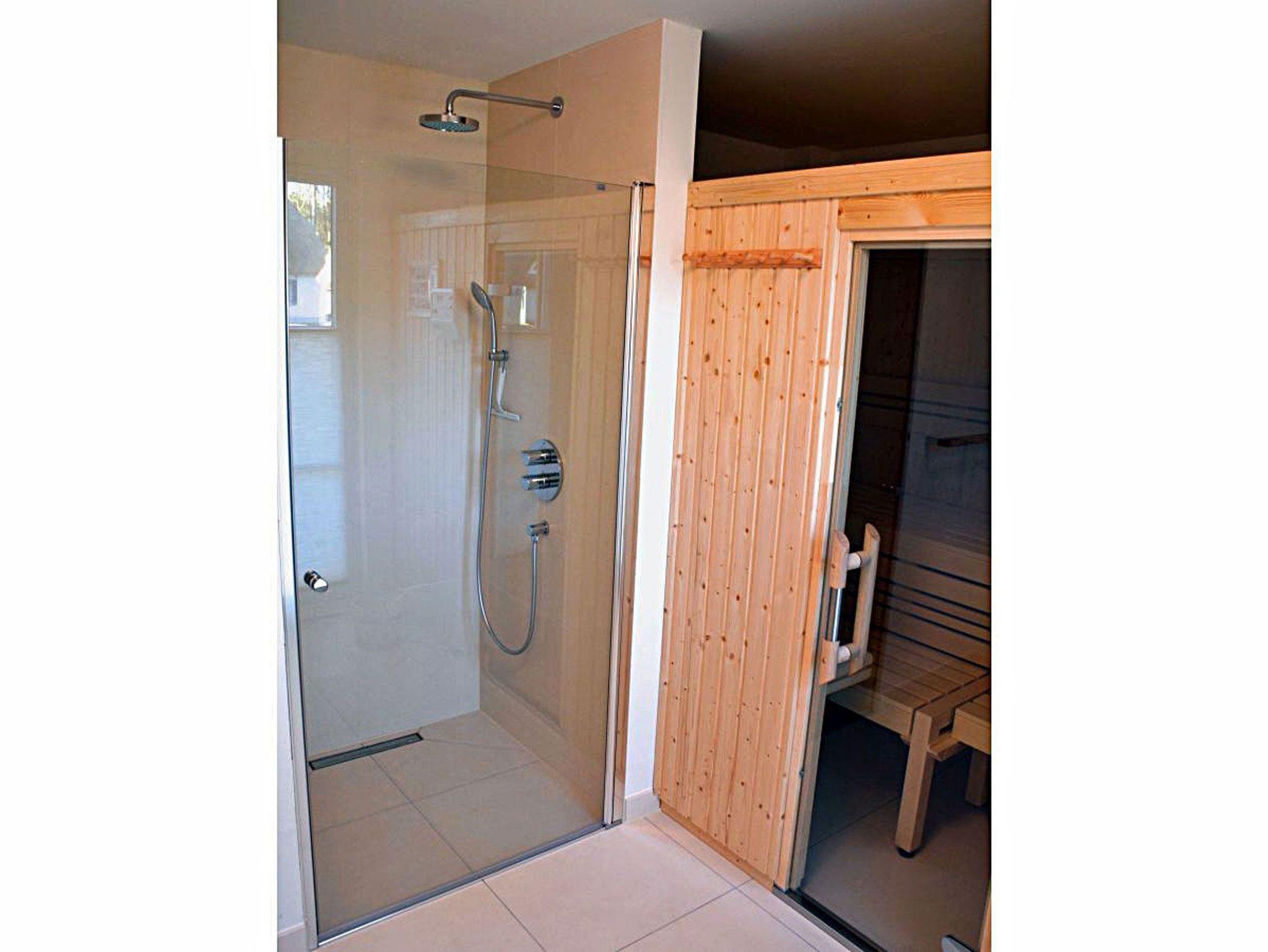 Saunabereich: mit ebenerdiger Dusche, separates WC mit Waschbecken und Spiegel;