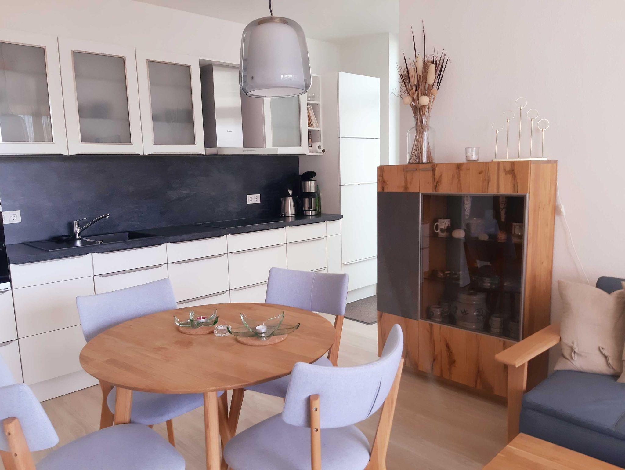 Die Ferienwohnung bietet Platz für bis zu 4 Personen (3 Erw. oder 2 Erw. + 2 Kinder bis 6 Jahre). Das Schlafzimmer verfügt über ein Doppelbett (180 x 200), im Wohnzimmer befindet sich eine Schlafcouch (120 x 210). In der Küche können Sie auch im Urlaub Ihr Lieblingsgericht zaubern. Im Haus steht eine Sauna mit Relaxbereich und Schwalldusche zur Verfügung, welche Sie nach Anmeldung kostenfrei nutzen. Zur Wohnung gehört außerdem ein Teifgaragenstellplatz.