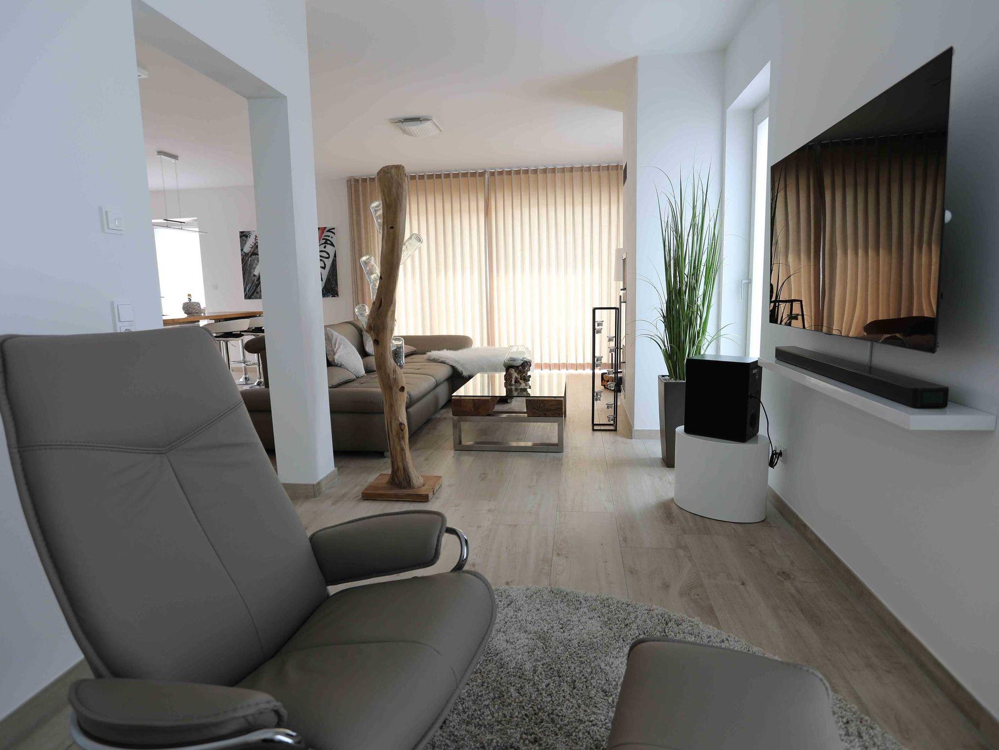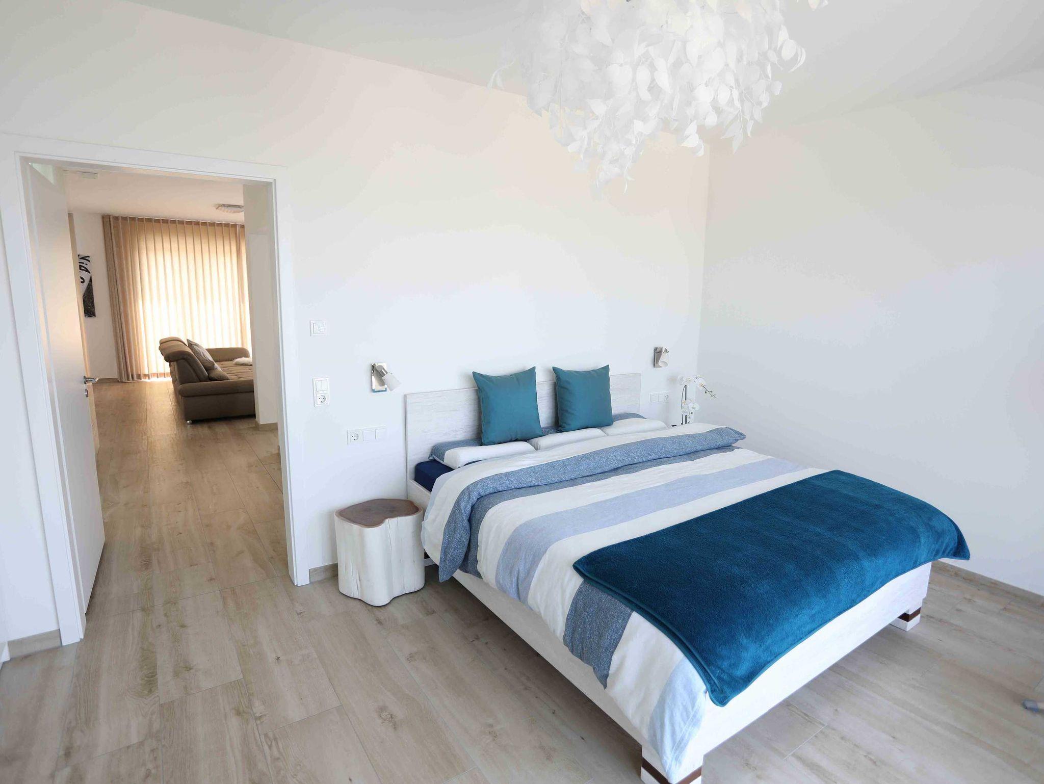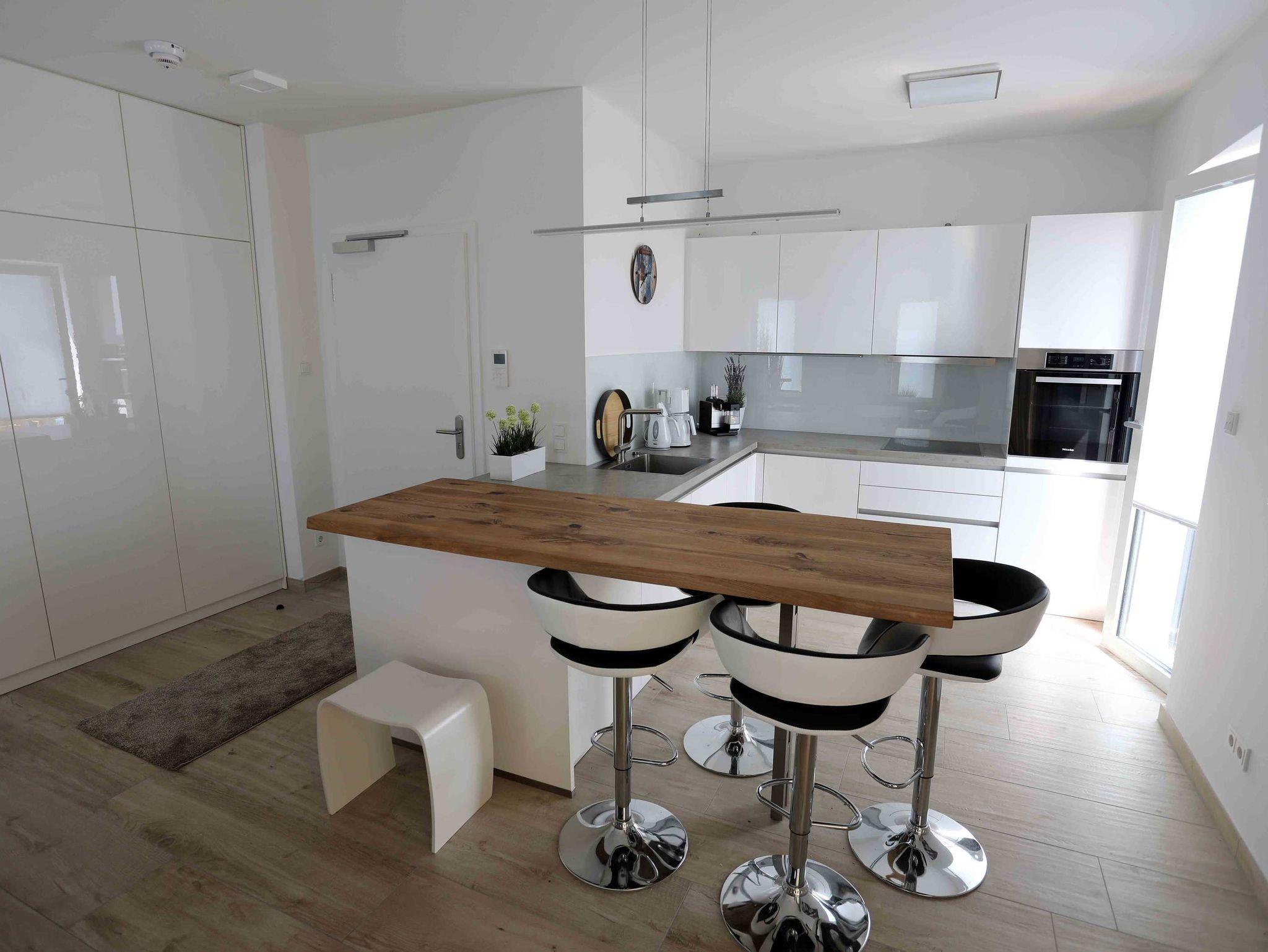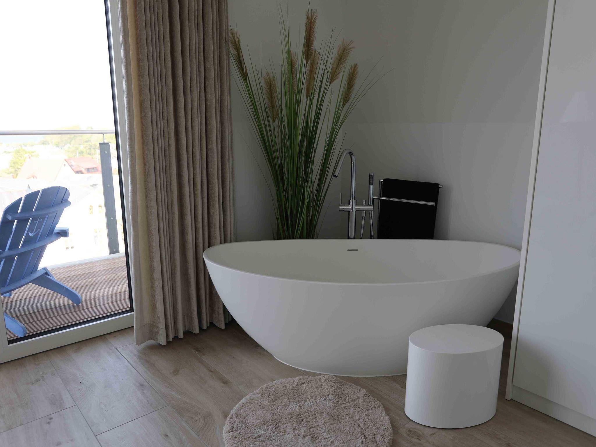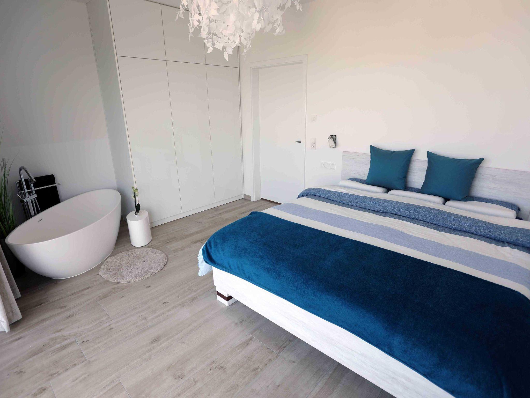Die Nichtraucherwohnung verfügt über ein Schlafzimmer mit einem 1,80m breiten Boxspringbett mit durchgehender Matratze und freistehender Badewanne. Das Badezimmer beherbergt eine Dusche. Sie ist ideal, um zwei Personen eine romantische und besondere Zeit zu bieten. Selbst bei schlechtem Wetter hat man in dieser lichtdurchfluteten Wohnung einen äußerst angenehmen Aufenthalt. Der Wohnbereich ist mit einem großen OLED-Flachbild-Fernseher und einer entsprechenden Heimkino-Musikanlage sowie einem Blu-ray/DVD-Player ausgestattet. Ein umfangreiches Angebot an Büchern sorgt für entspannte Momente. Selbstverständlich ist hier WLAN verfügbar. Der PKW Stellplatz befindet sich in der Tiefgarage des Nebengebäudes.