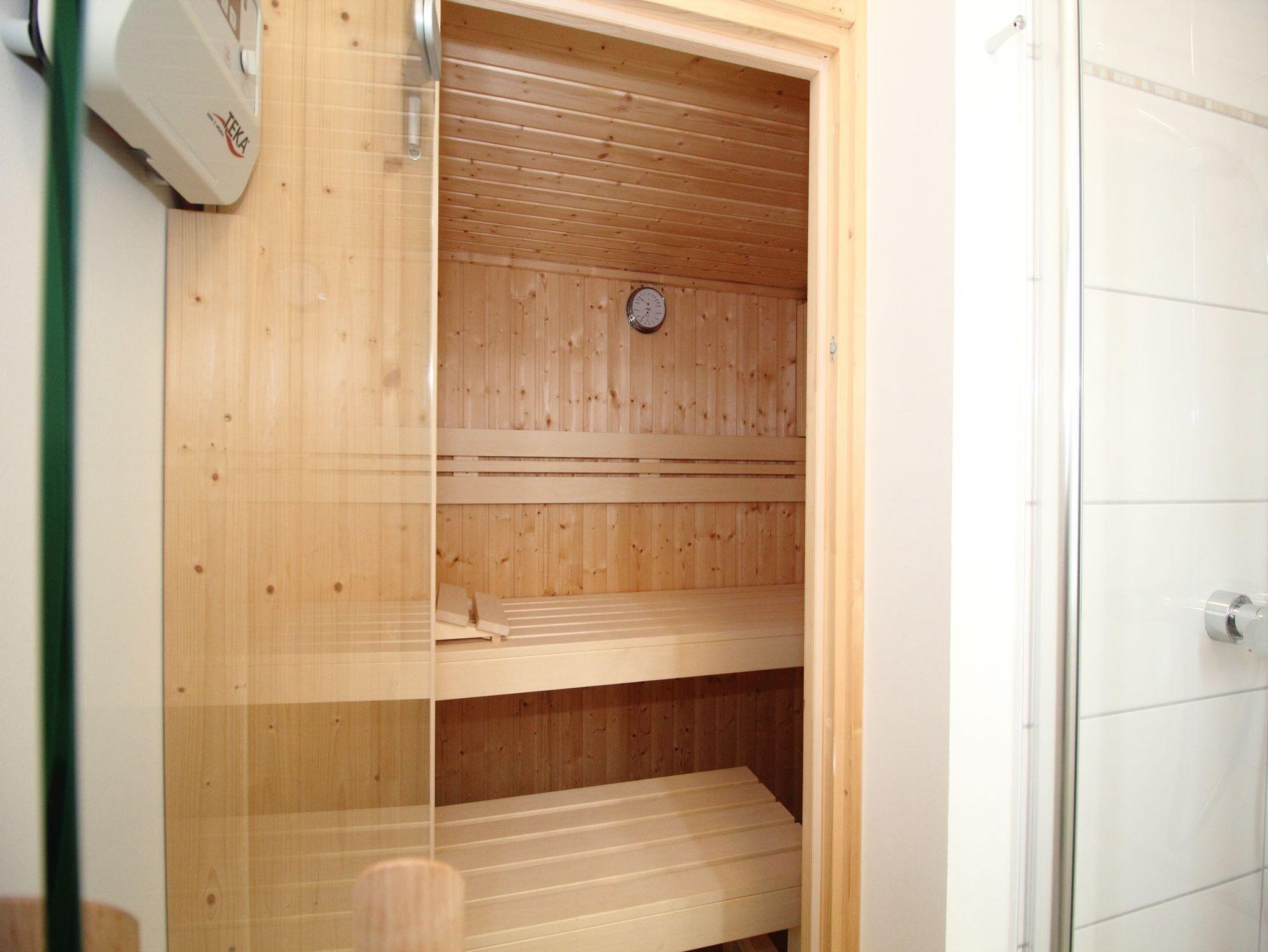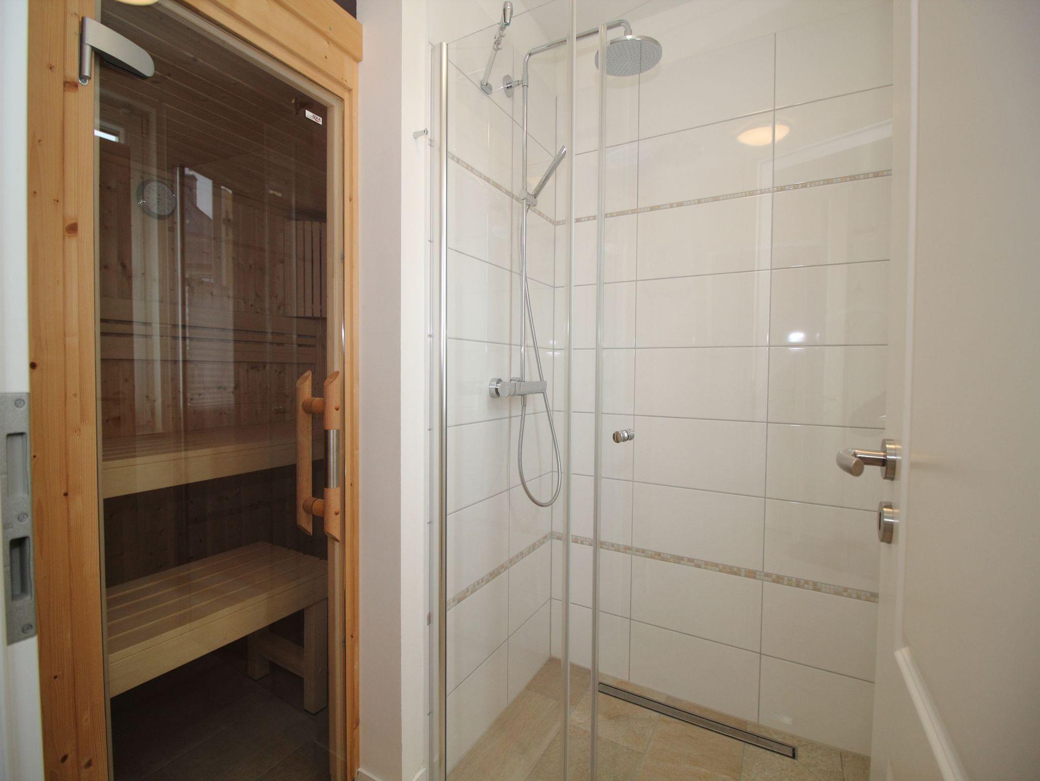 ? Badezimmer mit ebenerdiger Dusche und Sauna, die Toilette ist separiert.