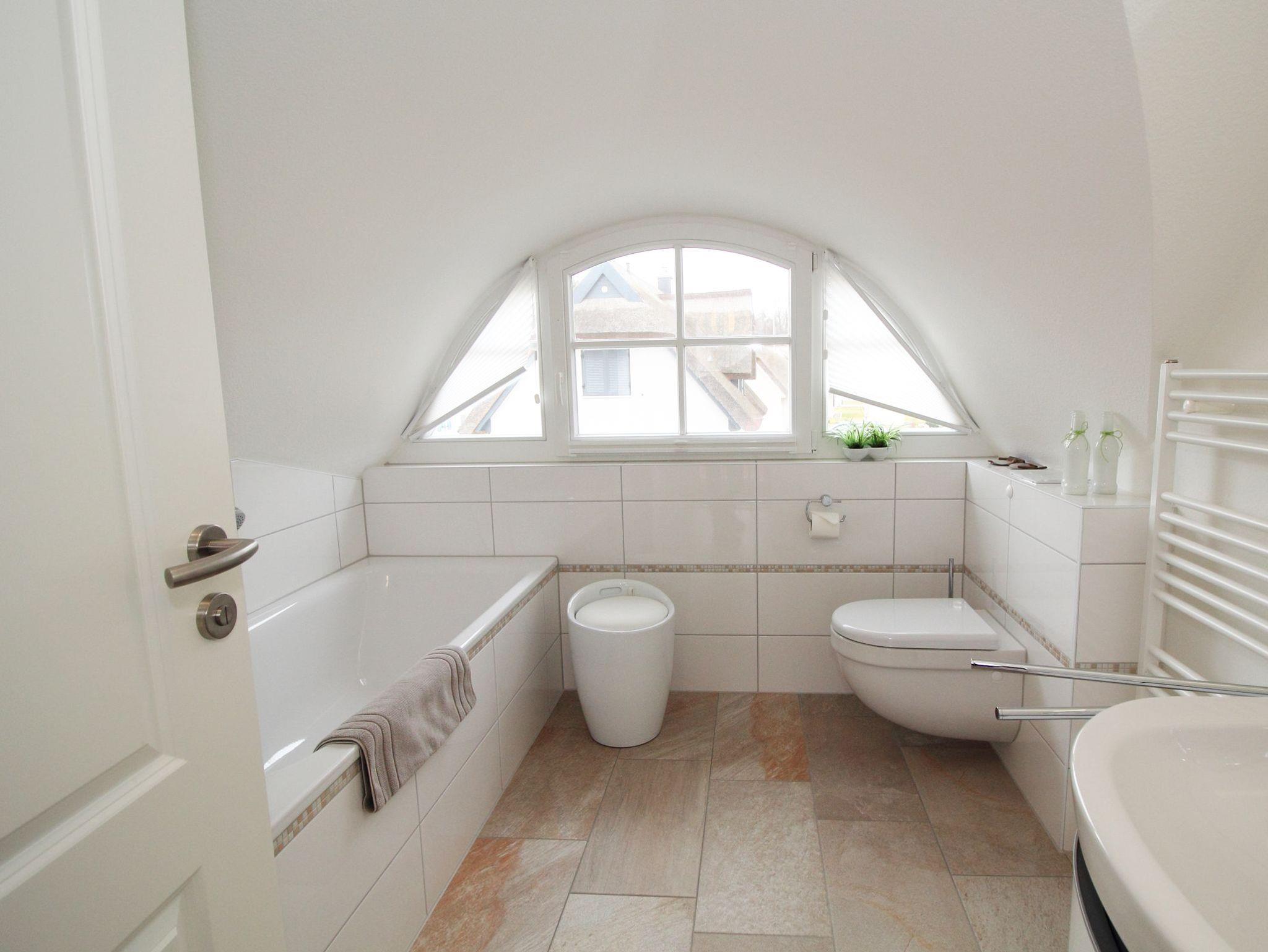 ? ein komfortables Badezimmer mit Waschtisch und Spiegelschrank, ausreichend Ablagemöglichkeiten, Dusche, Badewanne, Handtuchheizkörper und WC.