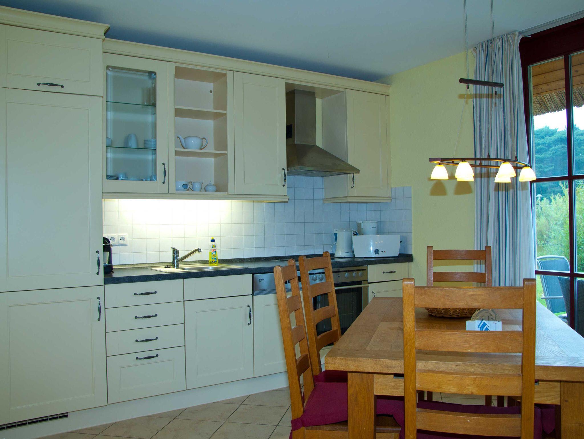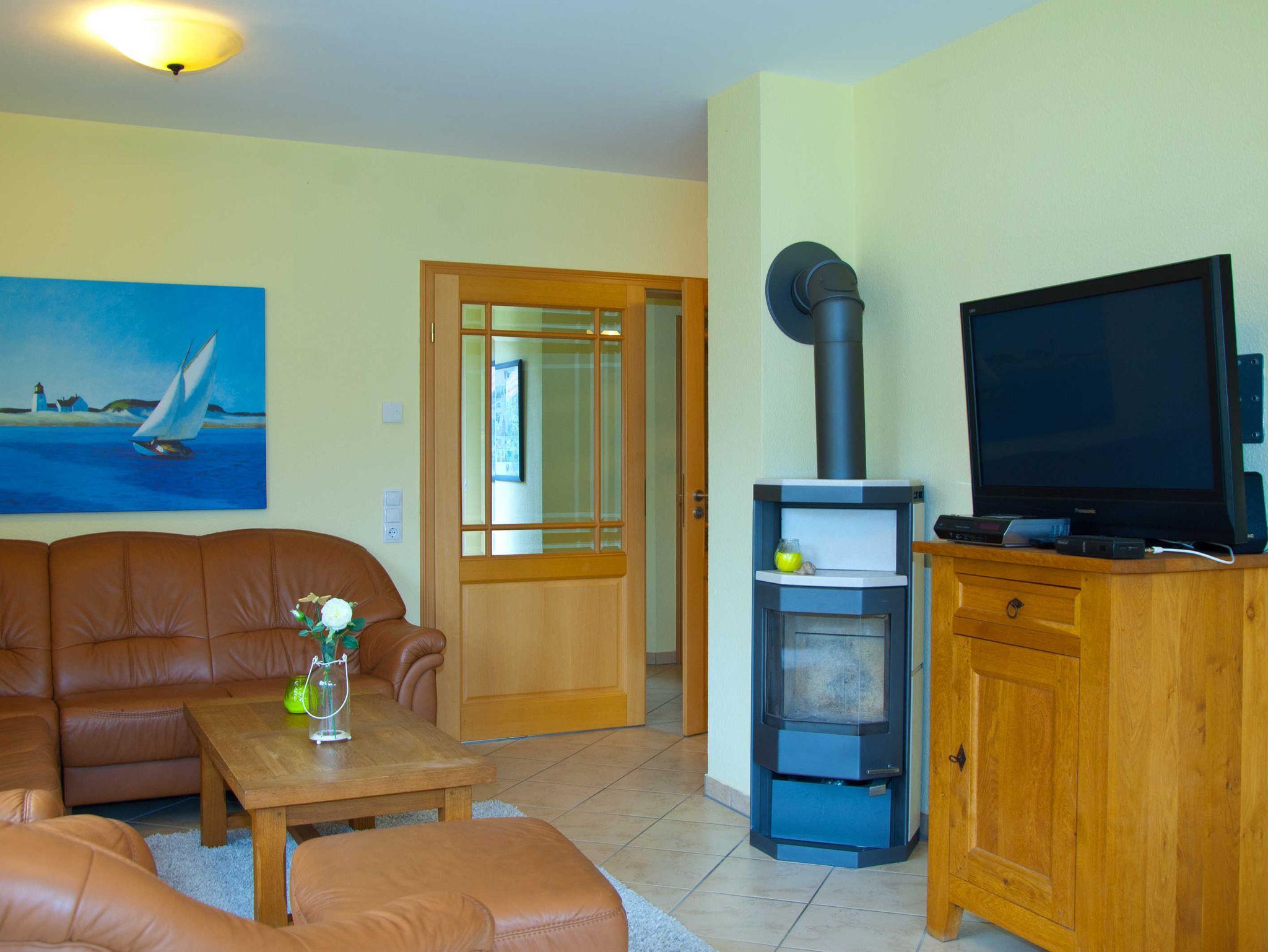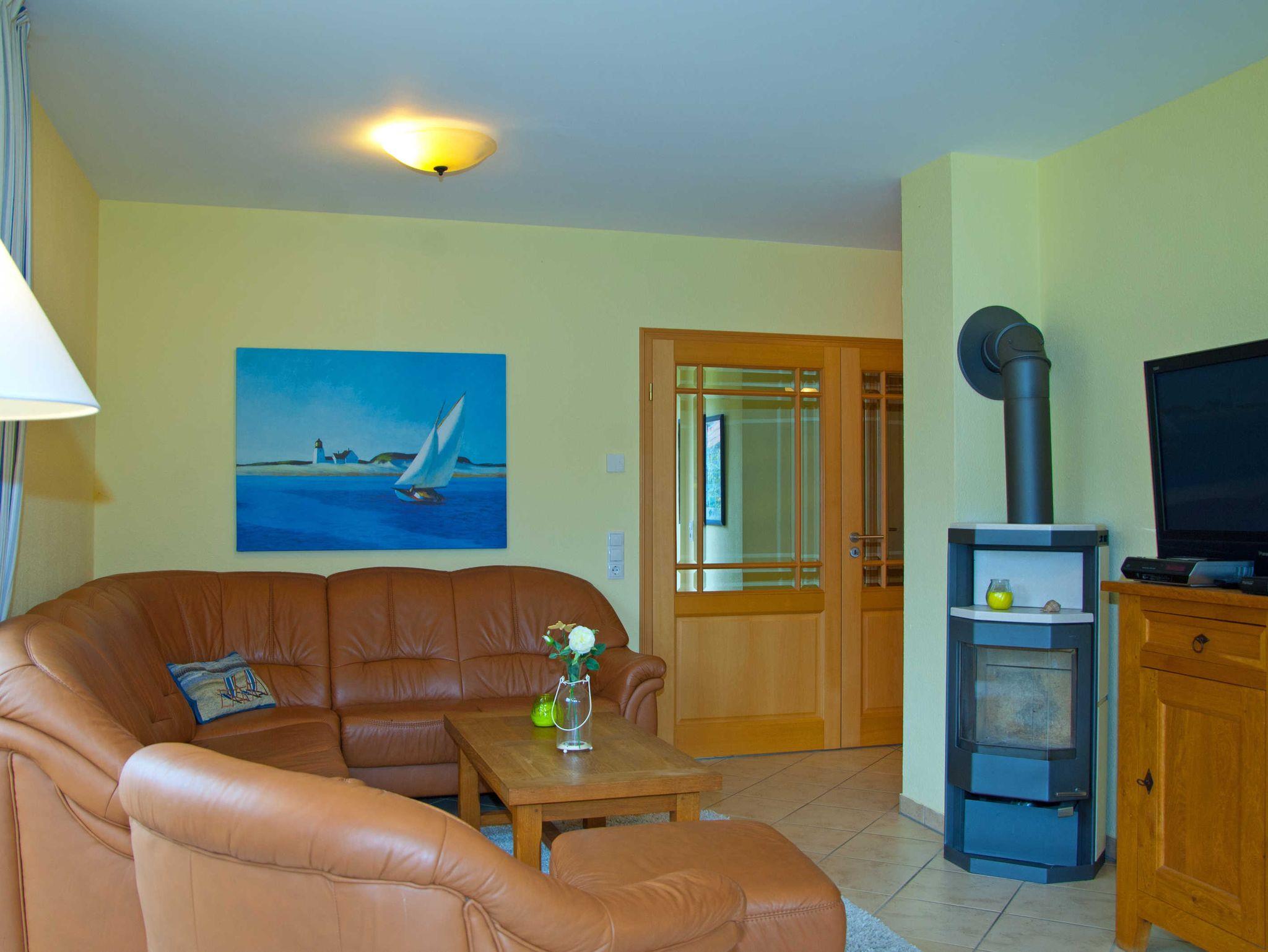 Im Wohnbereich werden Sie sich auch mal bei schlechtem Wetter sehr wohlfühlen. Die Einrichtung mit massiven Eichenmöbeln ist auf den gemütlichen Stil des Hauses mit dem Reetdach abgestimmt. Zum Entspannen finden Sie dort eine riesige Sofaecke aus feinstem Leder. Wenn dann das Kaminfeuer flackert, erlebt man bestimmt romantische Abende. Sollten Sie mit Kindern die Ferien geniessen, so werden Sie auch die Entertainmentaustattung mit Flachbildschirm und hunderten Programmen schätzen. Auch die Stereoanlage können Sie gern richtig aufdrehen, denn durch die massive Bauweise kann Sie garantiert kein Nachbar hören.