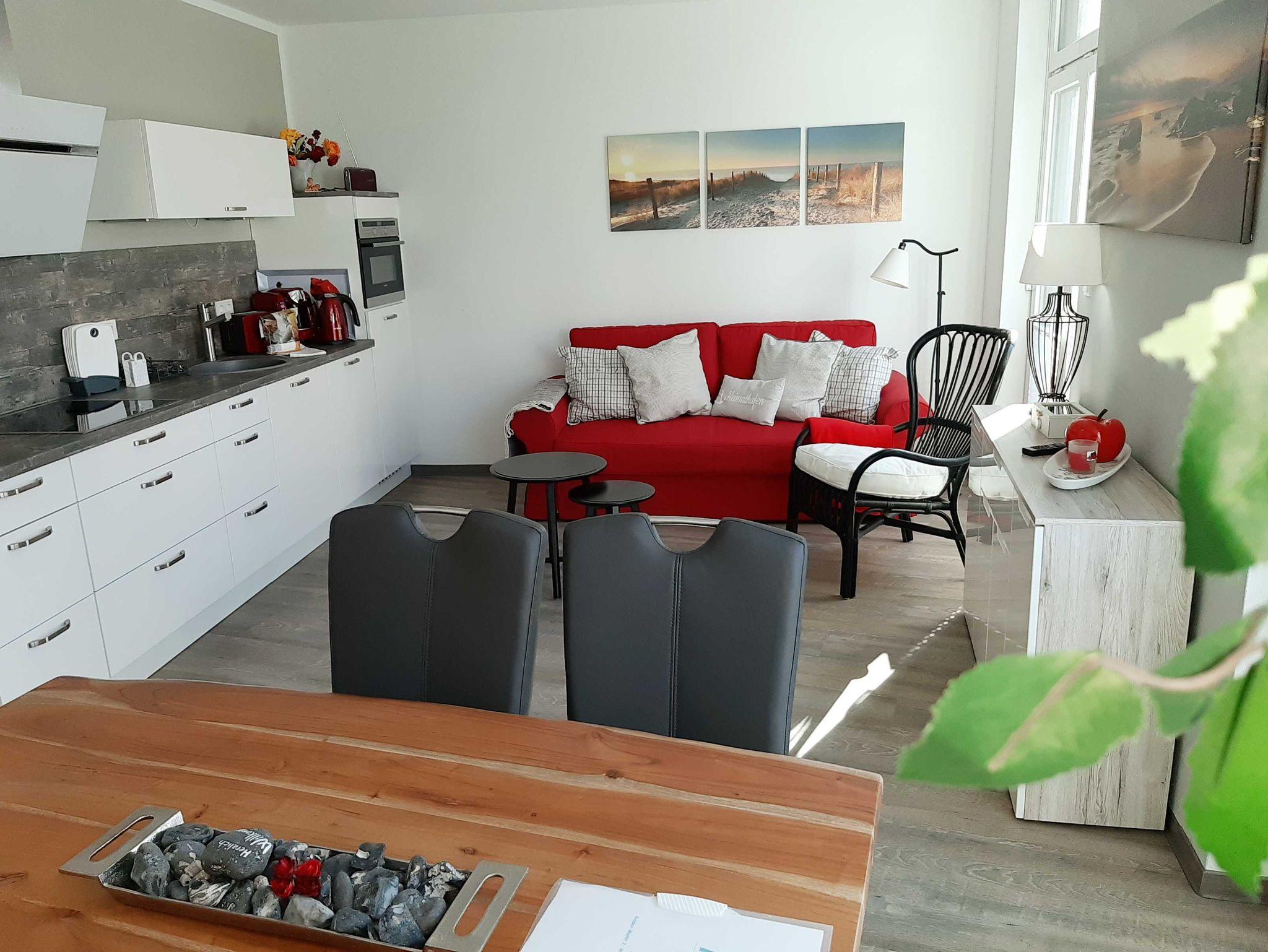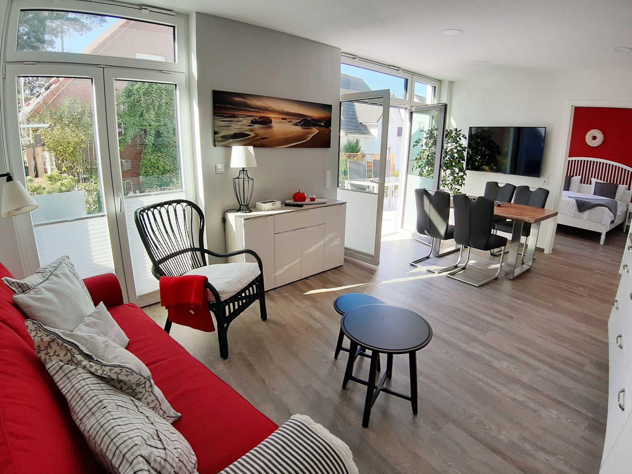 Das Domizil besitzt eine Terrasse, ein Schlafzimmer mit Doppelbett, ein Bad mit Dusche und einen Wohnbereich mit gemütlicher Couchecke mit Schlaffunktion sowie TV-Gerät und integrierter Küche. Die Wohnung ist gemütlich eingericht und liebevoll gestaltet.